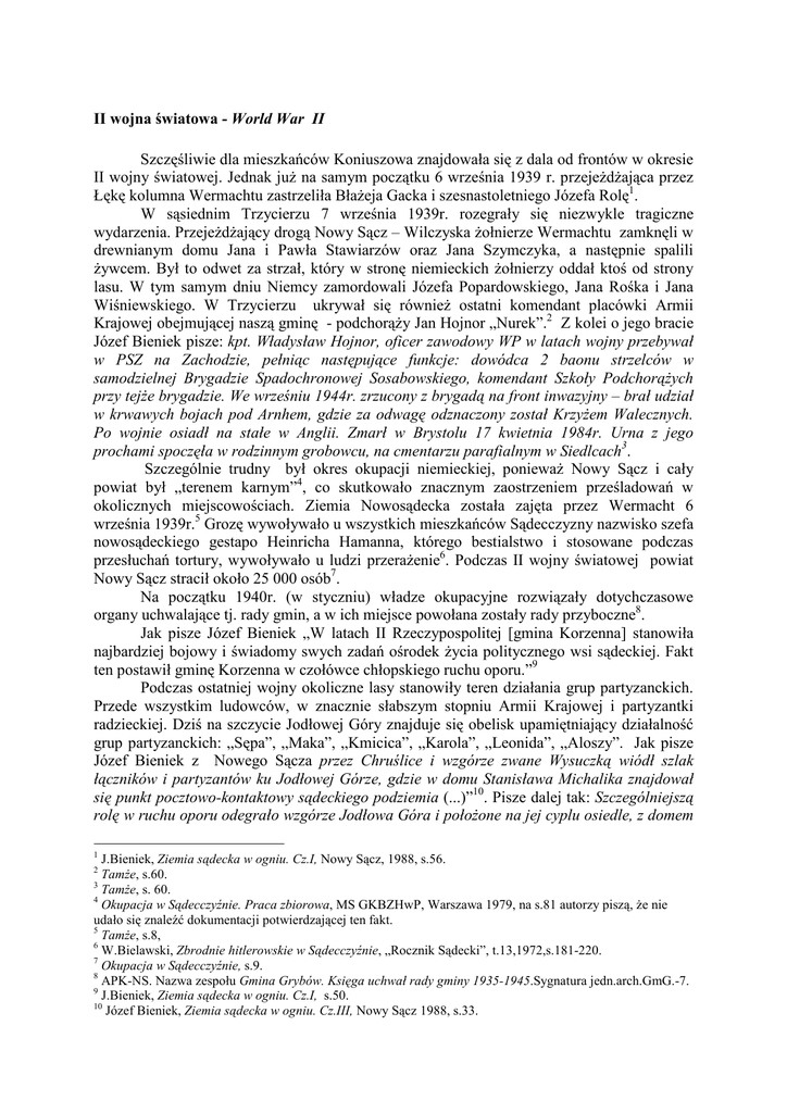 II wojna światowa - World War II Szczęśliwie dla mieszkańców Koniuszowa znajdowała się z dala od frontów w okresie II wojny światowej. Jednak juŜ na samym początku 6 września 1939 r. przejeŜdŜająca przez Łękę kolumna Wermachtu zastrzeliła BłaŜeja Gacka i szesnastoletniego Józefa Rolę1. W sąsiednim Trzycierzu 7 września 1939r. rozegrały się niezwykle tragiczne wydarzenia. PrzejeŜdŜający drogą Nowy Sącz – Wilczyska Ŝołnierze Wermachtu zamknęli w drewnianym domu Jana i Pawła Stawiarzów oraz Jana Szymczyka, a następnie spalili Ŝywcem. Był to odwet za strzał, który w stronę niemieckich Ŝołnierzy oddał ktoś od strony lasu. W tym samym dniu Niemcy zamordowali Józefa Popardowskiego, Jana Rośka i Jana Wiśniewskiego. W Trzycierzu ukrywał się równieŜ ostatni komendant placówki Armii Krajowej obejmującej naszą gminę - podchorąŜy Jan Hojnor „Nurek”.2 Z kolei o jego bracie Józef Bieniek pisze: kpt. Władysław Hojnor, oficer zawodowy WP w latach wojny przebywał w PSZ na Zachodzie, pełniąc następujące funkcje: dowódca 2 baonu strzelców w samodzielnej Brygadzie Spadochronowej Sosabowskiego, komendant Szkoły PodchorąŜych przy tejŜe brygadzie. We wrześniu 1944r. zrzucony z brygadą na front inwazyjny – brał udział w krwawych bojach pod Arnhem, gdzie za odwagę odznaczony został KrzyŜem Walecznych. Po wojnie osiadł na stałe w Anglii. Zmarł w Brystolu 17 kwietnia 1984r. Urna z jego prochami spoczęła w rodzinnym grobowcu, na cmentarzu parafialnym w Siedlcach3. Szczególnie trudny był okres okupacji niemieckiej, poniewaŜ Nowy Sącz i cały powiat był „terenem karnym”4, co skutkowało znacznym zaostrzeniem prześladowań w okolicznych miejscowościach. Ziemia Nowosądecka została zajęta przez Wermacht 6 września 1939r.5 Grozę wywoływało u wszystkich mieszkańców Sądecczyzny nazwisko szefa nowosądeckiego gestapo Heinricha Hamanna, którego bestialstwo i stosowane podczas przesłuchań tortury, wywoływało u ludzi przeraŜenie6. Podczas II wojny światowej powiat Nowy Sącz stracił około 25 000 osób7. Na początku 1940r. (w styczniu) władze okupacyjne rozwiązały dotychczasowe organy uchwalające tj. rady gmin, a w ich miejsce powołana zostały rady przyboczne8. Jak pisze Józef Bieniek „W latach II Rzeczypospolitej [gmina Korzenna] stanowiła najbardziej bojowy i świadomy swych zadań ośrodek Ŝycia politycznego wsi sądeckiej. Fakt ten postawił gminę Korzenna w czołówce chłopskiego ruchu oporu.”9 Podczas ostatniej wojny okoliczne lasy stanowiły teren działania grup partyzanckich. Przede wszystkim ludowców, w znacznie słabszym stopniu Armii Krajowej i partyzantki radzieckiej. Dziś na szczycie Jodłowej Góry znajduje się obelisk upamiętniający działalność grup partyzanckich: „Sępa”, „Maka”, „Kmicica”, „Karola”, „Leonida”, „Aloszy”. Jak pisze Józef Bieniek z Nowego Sącza przez Chruślice i wzgórze zwane Wysuczką wiódł szlak łączników i partyzantów ku Jodłowej Górze, gdzie w domu Stanisława Michalika znajdował się punkt pocztowo-kontaktowy sądeckiego podziemia (...)”10. Pisze dalej tak: Szczególniejszą rolę w ruchu oporu odegrało wzgórze Jodłowa Góra i połoŜone na jej cyplu osiedle, z domem 1 J.Bieniek, Ziemia sądecka w ogniu. Cz.I, Nowy Sącz, 1988, s.56. TamŜe, s.60. 3 TamŜe, s. 60. 4 Okupacja w Sądecczyźnie. Praca zbiorowa, MS GKBZHwP, Warszawa 1979, na s.81 autorzy piszą, Ŝe nie udało się znaleźć dokumentacji potwierdzającej ten fakt. 5 TamŜe, s.8, 6 W.Bielawski, Zbrodnie hitlerowskie w Sądecczyźnie, „Rocznik Sądecki”, t.13,1972,s.181-220. 7 Okupacja w Sądecczyźnie, s.9. 8 APK-NS. Nazwa zespołu Gmina Grybów. Księga uchwał rady gminy 1935-1945.Sygnatura jedn.arch.GmG.-7. 9 J.Bieniek, Ziemia sądecka w ogniu. Cz.I, s.50. 10 Józef Bieniek, Ziemia sądecka w ogniu. Cz.III, Nowy Sącz 1988, s.33. 2 Michalika „Jodły” na czele. Tu był punkt etapowy i kontaktowy między południową i północną częścią podziemnej Sądecczyzny. Tu teŜ kwaterowały od czasu do czasu oddziały partyzanckie „Maka”, „Sępa” „Kosy” i „Kmicica” znajdując w rodzinie Michalików serdecznych przyjaciół i opiekunów. 10 X 1944r. kwaterujący u Michalików oddział „Maka” osaczony został przez duŜe siły gestapo, Ŝandarmerii i policji. Po kilkugodzinnym oblęŜeniu i strzelaninie z uŜyciem lekkich dział – oddział zdołał się przebić i wyjść cało. Wróg zemstę wywarł na rodzinie Michalików, aresztując wszystkich domowników, paląc dom z zabudowaniami gospodarczymi i rabując wszystkie wartościowe przedmioty. W ręce wroga wpadła sanitariuszka Stefania Górska oraz jeden z partyzantów, obywatel radziecki, który został zastrzelony podczas próby ucieczki. Michalikowie oraz sanitariuszka doczekali wyzwolenia11. Do czasów obecnych zachowały się ślady po domostwie Michalików: stojąc plecami do obelisku widać skarlałe drzewa owocowe, a na łące moŜna znaleźć wyraźne ślady zabudowań. Po wojnie rodzina nie wróciła na Jodłową Górę. Osiedlili się gdzieś w okolicy Nowego Sącza. Józef Bieniek jest związany z Koniuszową poprzez sąsiedztwo. Urodził się w Librantowej w niezamoŜnej rodzinie chłopskiej, osierocony przez ojca, gdy miał zaledwie 12 lat przeszedł twardą szkołę Ŝycia, pomagając matce w prowadzeniu gospodarstwa rolnego, dorabiając jako robotnik. Uzdolniony literacko i muzycznie, ukończywszy po szkole podstawowej szereg kursów Towarzystwa Szkoły Ludowej i Niedzielnego Uniwersytetu Ludowego wciągnął się w wieku młodzieńczym do pracy kulturalno-oświatowej w swoim środowisku, prowadził bibliotekę, zespół dobrego czytania, chór mieszany i kapelę. Pracował jako robotnik drogowy, dróŜnik, fakturzysta. W okresie II wojny światowej prowadził w Librantowej sklep spoŜywczo-przemysłowy. Twórczość literacką publikował w prasie l