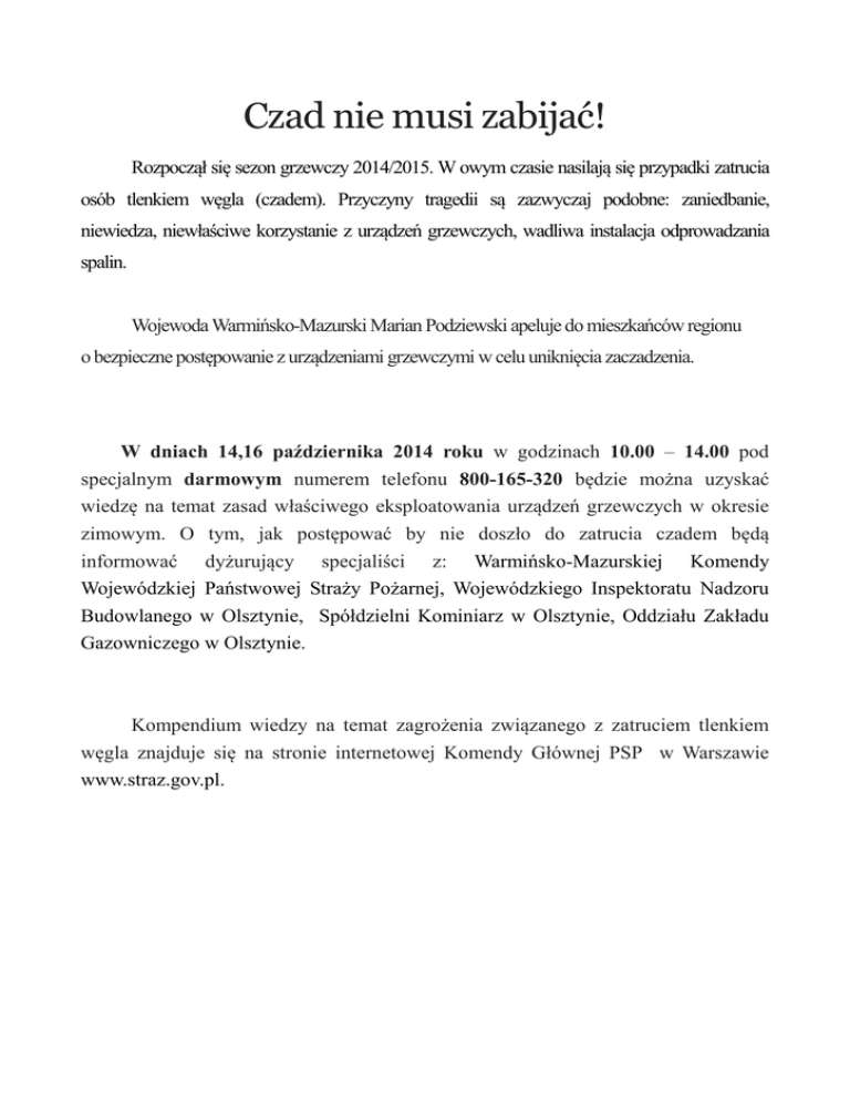 Czad nie musi zabijać! Rozpoczął się sezon grzewczy 2014/2015. W owym czasie nasilają się przypadki zatrucia osób tlenkiem węgla (czadem). Przyczyny tragedii są zazwyczaj podobne: zaniedbanie, niewiedza, niewłaściwe korzystanie z urządzeń grzewczych, wadliwa instalacja odprowadzania spalin. Wojewoda Warmińsko-Mazurski Marian Podziewski apeluje do mieszkańców regionu o bezpieczne postępowanie z urządzeniami grzewczymi w celu uniknięcia zaczadzenia. W dniach 14,16 października 2014 roku w godzinach 10.00 – 14.00 pod specjalnym darmowym numerem telefonu 800-165-320 będzie można uzyskać wiedzę na temat zasad właściwego eksploatowania urządzeń grzewczych w okresie zimowym. O tym, jak postępować by nie doszło do zatrucia czadem będą informować dyżurujący specjaliści z: Warmińsko-Mazurskiej Komendy Wojewódzkiej Państwowej Straży Pożarnej, Wojewódzkiego Inspektoratu Nadzoru Budowlanego w Olsztynie, Spółdzielni Kominiarz w Olsztynie, Oddziału Zakładu Gazowniczego w Olsztynie. Kompendium wiedzy na temat zagrożenia związanego z zatruciem tlenkiem węgla znajduje się na stronie internetowej Komendy Głównej PSP w Warszawie www.straz.gov.pl. OSTRZEGAMY! Każdego roku z powodu zatrucia tlenkiem węgla, potocznie zwanego czadem, ginie kilkadziesiąt osób. Bardzo często nie ma to związku z powstaniem pożaru, a wynika jedynie z niewłaściwej eksploatacji budynku i znajdujących się w nich urządzeń i instalacji grzewczych. PRZYPOMINAMY! Przepisy zobowiązują do czyszczenia kominów! Art. 62 ust. 1 pkt 1c ustawy z dnia 7 lipca 1994 r. Prawo budowlane (Dz. U. z 2006 r. Nr 156, poz. 1118 ze zm.) zobowiązuje właścicieli i zarządców obiektów budowlanych, w tym bloków mieszkalnych i domów jednorodzinnych do okresowej kontroli, co najmniej raz w roku stanu technicznego instalacji gazowych oraz przewodów kominowych (dymowych, spalinowych i wentylacyjnych). RADZIMY! Skąd się bierze czad i dlaczego jest tak niebezpieczny? Tlenek węgla powstaje podczas procesu niepełnego spalania materiałów palnych, w tym paliw, które występuje przy niedostatku tlenu w otaczającej atmosferze. Niebezpieczeństwo zaczadzenia wynika z faktu, że tlenek węgla: • • jest gazem niewyczuwalnym zmysłami człowieka (bezwonny, bezbarwny i pozbawiony smaku), blokuje dostęp tlenu do organizmu, poprzez zajmowanie jego miejsca w czerwonych ciałkach krwi, powodując przy długotrwałym narażeniu (w większych dawkach) śmierć przez uduszenie. Co jest główną przyczyną zaczadzeń? Głównym źródłem zatruć w budynkach mieszkalnych jest niesprawność przewodów kominowych: wentylacyjnych, spalinowych i dymowych. Wadliwe działanie wspomnianych przewodów może wynikać z: • • • • ich nieszczelności, braku konserwacji, w tym czyszczenia, wad konstrukcyjnych, niedostosowania istniejącego systemu wentylacji do standardów szczelności stosowanych okien i drzwi, w związku z wymianą starych okien i drzwi na nowe. Powyższe może prowadzić do niedrożności przewodów, braku ciągu, a nawet do powstawania zjawiska ciągu wstecznego, polegającego na tym, że dym zamiast wydostawać się przewodem kominowym na zewnątrz, cofa się z powrotem do pomieszczenia. Co zrobić, aby uniknąć zaczadzenia? W celu uniknięcia zaczadzenia należy: • • • • • • • • przeprowadzać kontrole techniczne, w tym sprawdzanie szczelności przewodów kominowych, ich systematyczne czyszczenie oraz sprawdzanie występowania dostatecznego ciągu powietrza, użytkować sprawne techniczne urządzenia, w których odbywa się proces spalania, zgodnie z instrukcją producenta, stosować urządzenia posiadające stosowne dopuszczenia w zakresie wprowadzenia do obrotu; w sytuacjach wątpliwych należy żądać okazania wystawionej przez producenta lub importera urządzenia tzw. deklaracji zgodności, tj. dokumentu zawierającego informacje o specyfikacji technicznej oraz przeznaczeniu i zakresie stosowania danego urządzenia, nie zaklejać i nie zasłaniać w inny sposób kratek wentylacyjnych, w przypadku wymiany okien na nowe, sprawdzić poprawność działania wentylacji, ponieważ nowe okna są najczęściej o wiele bardziej szczelne w stosunku do wcześniej stosowanych w budynku i mogą pogarszać wentylację, systematycznie sprawdzać ciąg powietrza, np. poprzez przykładanie kartki papieru do otworu bądź kratki wentylacyjnej; jeśli nic nie zakłóca wentylacji, kartka powinna przywrzeć do wyżej wspomnianego otworu lub kratki, często wietrzyć pomieszczenie, w których odbywa się proces spalania (kuchnie, łazienki wyposażone w termy gazowe), a najlepiej zapewnić, nawet niewielkie, rozszczelnienie okien, nie bagatelizować objawów duszności, bólów i zawrotów głowy, nudności, wymiotów, oszołomienia, osłabienia, przyspieszenia czynności serca i oddychania, gdyż mogą być sygnałem, że ulegamy zatruciu czadem; w takiej sytuacji należy natychmiast przewietrzyć pomieszczenie, w którym się znajdujemy i zasięgnąć porady lekarskiej. W trosce o własne bezpieczeństwo, warto rozważyć zamontowanie w domu czujek dymu i gazu. Koszt zamontowania takich czujek jest niewspółmiernie niski do korzyści, jakie daje zastosowanie tego typu urządzeń (łącznie z uratowaniem najwyższej wartości, jaką jest nasze życie). Jak pomóc przy zatruciu tlenkiem węgla? W przypadku zatrucia tlenkiem węgla należy: • • • • • • zapewnić dopływ świeżego czystego powietrza; w skrajnych przypadkach wybijając szyby w oknie, wynieść osobę poszkodowaną w bezpieczne miejsce, jeśli nie stanowi to zagrożenia dla zdrowia osoby ratującej; w przypadku istnienia takiego zagrożenia pozostawić przeprowadzenie akcji służbom ratowniczym, wezwać służby ratownicze (pogotowie ratunkowe, PSP), jak najszybciej podać tlen, jeżeli osoba poszkodowana nie oddycha, ma zatrzymaną akcję serca, należy natychmiast zastosować sztuczne oddychanie 