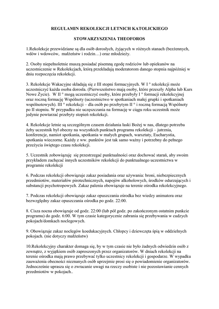 REGULAMIN REKOLEKCJI LETNICH KATOLICKIEGO STOWARZYSZENIA THEOFOROS 1.Rekolekcje przewidziane są dla osób dorosłych, żyjących w różnych stanach (bezżennych, wdów i wdowców, małżeństw i rodzin…) oraz młodzieży. 2. Osoby niepełnoletnie muszą posiadać pisemną zgodę rodziców lub opiekunów na uczestniczenie w Rekolekcjach, którą przekładają moderatorom danego stopnia najpóźniej w dniu rozpoczęcia rekolekcji. 3. Rekolekcje Wakacyjne składają się z III stopni formacyjnych. W I ° rekolekcji może uczestniczyć każda osoba dorosła. (Pierwszeństwo mają osoby, które przeszły Alpha lub Kurs Nowe Życie). W II ° mogą uczestniczyć osoby, które przebyły I ° formacji rekolekcyjnej oraz roczną formację Wspólnoty (uczestnictwo w spotkaniach małej grupki i spotkaniach wspólnotowych). III ° rekolekcji – dla osób po przebytym II ° i roczną formacją Wspólnoty po II stopniu. W przypadku nie uczęszczania na formację w ciągu roku uczestnik może jedynie powtarzać przebyty stopień rekolekcji. 4. Rekolekcje letnie są szczególnym czasem działania łaski Bożej w nas, dlatego potrzeba żeby uczestnik był obecny na wszystkich punktach programu rekolekcji – jutrznia, konferencje, namiot spotkania, spotkania w małych grupach, warsztaty, Eucharystia, spotkania wieczorne. Każdy z ww. punktów jest tak samo ważny i potrzebny do pełnego przeżycia świętego czasu rekolekcji. 5. Uczestnik zobowiązuję się przestrzegać punktualności oraz dochować starań, aby swoim przykładem zachęcać innych uczestników rekolekcji do punktualnego uczestnictwa w programie rekolekcji 6. Podczas rekolekcji obowiązuje zakaz posiadania oraz używania: broni, niebezpiecznych przedmiotów, materiałów pirotechnicznych, napojów alkoholowych, środków odurzających i substancji psychotropowych. Zakaz palenia obowiązuje na terenie ośrodka rekolekcyjnego. 7. Podczas rekolekcji obowiązuje zakaz opuszczania ośrodka bez wiedzy animatora oraz bezwzględny zakaz opuszczania ośrodka po godz. 22:00. 8. Cisza nocna obowiązuje od godz. 22:00 (lub pół godz. po zakończonym ostatnim punkcie programu) do godz. 6:00. W tym czasie kategorycznie zabrania się przebywania w cudzych pokojach/domkach noclegowych. 9. Obowiązuje zakaz noclegów koedukacyjnych. Chłopcy i dziewczęta śpią w oddzielnych pokojach. (nie dotyczy małżeństw) 10.Rekolekcyjny charakter domaga się, by w tym czasie nie było żadnych odwiedzin osób z zewnątrz, z wyjątkiem osób zaproszonych przez organizatorów. W dniach rekolekcji na terenie ośrodka mają prawo przebywać tylko uczestnicy rekolekcji i gospodarze. W wypadku zauważenia obecności nieznanych osób uprzejmie prosi się o powiadomienie organizatorów. Jednocześnie uprasza się o zwracanie uwagi na rzeczy osobiste i nie pozostawianie cennych przedmiotów w pokojach.. 11. Podczas spotkań odbywających się w świątyni każdego uczestnika obowiązuje właściwy strój oraz postawa szacunku dla miejsca świętego. Za właściwy strój uważa się ubranie zasłaniające ramiona, brzuch oraz nogi o stonowanych barwach. Wymóg ten dotyczy zarówno kobiet jak i mężczyzn. Nie chodzimy do świątyni w strojach sportowych, plażowych, spódniczkach mini, krótkich spodenkach itp.Organizatorzy proszą o zaangażowanie w śpiew i modlitwę, a także o czynne włączanie się w liturgię i nabożeństwa. 12.Podczas pobytu obowiązuje strój stosowny do czasu rekolekcji. Pamiętajmy, że nasz strój również może wpływać na rozproszenia w przeżywaniu rekolekcji przez innych uczestników. 13.Prosimy o nie przywożenie hałaśliwych zabawek, sprzętu audio video (radio, mp3 player), gier elektronicznych, 14.Dbamy o czystość i porządek w swoich pokojach, a także całym ośrodku rekolekcyjno/wypoczynkowym. 15. Każdy dorosły uczestnik przydzielony jest do małej grupy, za którą odpowiada animator. W czasie rekolekcji nie przewiduje się przeniesienia uczestnika do innej małej grupki. W przypadku gdy utworzona jest grupa młodzieżowa, wówczas osoby w wieku 13-18 przydzielone są do małej grupy młodzieżowej. Jednak gdy taka grupa nie powstała w małej grupce uczestniczą osoby powyżej 16 roku życia. 16. W czasie rekolekcji każda z małych grupek pełnić będzie dyżury według sporządzonego przez organizatorów grafiku. Przewiduje się następujące dyżury małych grupek: - śniadaniowy – posługa w trakcie śniadania, sprzątanie stołów i ewentualna pomoc w zmywaniu po śniadaniu oraz nakrycie stołów na obiad; - obiadowy – ewentualna pomoc w przygotowaniu obiadu (obieranie ziemniaków), posługa w trakcie obiadu, sprzątanie stołów i pomoc w zmywaniu po obiedzie oraz nakrycie stołów na kolację; - kolacyjny – posługa w trakcie kolacji, sprzątanie stołów i zmywanie po kolacji oraz nakrycie stołów na śniadanie. - liturgiczny – oprawa liturgiczna podczas nabożeństw i eucharystii w trakcie dnia rekolekcyjnego; - sprzątający – sprzątanie w wolnym czasie części wspólnych (sale konferencyjne, kawiarenka itp.) W dniu przyjazdu należy zapoznać się i przestrzegać dyżurów rekolekcyjnych zgodnie z zasadami przedstawionymi na spotkaniu wstępnym. 17. Dla dzieci, z którymi przyjeżdżają uczestnicy przewidziane są zajęcia z opiekunami. Mogą w nich uczestniczyć dzieci od lat 3, które chcą i potrafią funkcjonować w grupie. Opieka nad dziećmi odbywa się w czasie konferencji, namiotu spotkania, spotkań w grupach oraz warsztatów. W Eucharystii dzieci uczestniczą z rodzicami. W czasie modlitwy wieczornej jest przewidziany dyżur dla dzieci, które chcą już pozostać w domu-czytanie ewentualnie oglądanie bajek. Zachęca się do uczestniczenia dzieci w wieczornym uwielbieniu. Wtedy jednak troską rodziców będzie to, żeby swoim usposobieniem dzieci nie były powodem dyskomfortu dla pozostałych uczestników modlitwy. Ze względu na rekolekcyjny charakter tego czasu i ograniczoną ilo