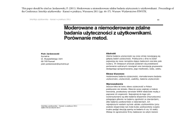 This paper should be cited as: Jardanowski, P. (2011). Moderowane a niemoderowane zdalne badania użyteczności z użytkownikami . Proceedings of the Conference: Interfejs użytkownika - Kansei w praktyce, Warszawa 2011 (pp. 44–57). Warsaw: Wydawnictwo PJWSTK. Interfejs użytkownika - Kansei w praktyce 2011 44 Moderowane a niemoderowane zdalne badania użyteczności z użytkownikami. Porównanie metod. Piotr Jardanowski Symetria Ul. Wyspiańskiego 10/4 60-749 Poznań [email protected] Abstrakt Zdalne badania użyteczności są coraz silniej rozwijającą się gałęzią badań użyteczności. Praktycznie z dnia na dzień pojawiają się nowe narzędzia dające badaczom szerokie pole wyboru. W niniejszym artykule postaram się przedstawić porównanie wybranych rozwiązań oraz koncepcję grupowania dostępnego oprogramowania, jego możliwości, wady, zalety. Słowa kluczowe moderowane badania użyteczności, niemoderowane badania użyteczności, użyteczność, usability, badania użyteczności Wprowadzenie Interfejs użytkownika – Kansei w praktyce 2011 ISBN 978-83-89244-99-4 Jeszcze kilka lat temu słowo użyteczność w Polsce praktycznie nie istniało. Obecnie coraz częściej w trakcie tworzenia, przebudowy serwisów WWW właściciele myślą o poprawie ich ergonomii. Najczęściej do tego celu wykorzystywane są albo badania eksperckie (heurystyczne) polegające głównie na badaniu zgodności ze standardami, albo badania użytkowników w laboratoriach. Ich największymi wadami są brak udziału użytkowników (przy analizie eksperckiej) lub mała liczba użytkowników (często trudno podjąć decyzję opartą na badaniu 6 czy 10 osób). Widząc te ograniczenia firmy badawcze na całym świecie Interfejs użytkownika - Kansei w praktyce 2011 zaczęły tworzyć narzędzia do zdalnego badania użytkowników poprzez Internet, upatrując w nich remedium na wymienione wyżej problemy. Praktycznie z dnia na dzień pojawiają się nowe narzędzia, programy, aplikacje, które dają co raz to większe możliwości badaczom. Czy są one w stanie zastąpić badania laboratoryjne? Jakie narzędzia w zakresie zdalnych badań użyteczności są dostępne? Jakie są między nimi różnice i podobieństwa oraz co w efekcie ich zastosowania można otrzymać? Na te i inne pytania zostanie przedstawiona odpowiedź w niniejszym artykule. Użyteczność Użyteczność pochodzi od angielskiego słowa usability. W Polsce czasami zamiennie (choć coraz rzadziej) stosuje się jeszcze tłumaczenia: funkcjonalność, używalność, ergonomia. W literaturze można znaleźć różne określenie tego słowa, a prawie każdy znany specjalista definiuje je na swój sposób. W niniejszym artykule użyteczność będzie rozumiana zgodnie z jej definicją w standardzie ISO 9241-11[1]: „Użyteczność to miara wydajności, efektywności i satysfakcji użytkownika z jaką dany produkt może być używany dla osiągnięcia danych celów przez danych użytkowników w danym kontekście”. W myśl tej definicji strona, aplikacja internetowa będą traktowane jako specyficzny produkt. Jego ocena następuje w trzech wymiarach: • Wydajności – wysiłku poniesionego na osiągnięcie określonego celu (np. ile czasu trzeba szukać książki w sklepie internetowym). 45 • Efektywności – osiągniętego celu w trakcie wykorzystywania produktu (np. czy udało się zamówić książkę w sklepie internetowym). • Satysfakcji – odczuwanej przez użytkownika w trakcie i po wykorzystaniu produktu (np. na ile przyjemne było dokonanie zakupu w sklepie internetowym. Właśnie te cechy podlegają najczęściej pomiarom w trakcie prowadzonych badań, a na ich podstawie jest generowana ocena użyteczności serwisu, aplikacji internetowej. Badanie użyteczności Badanie użyteczności jest najczęściej utożsamiane z dwoma rodzajami metod: • Analiza ekspercka – polegająca na ocenie strony przez specjalistę od użyteczności, który jest w stanie wskazać różnego rodzaju odstępstwa od konwencji stosowanych w Internecie i wskazać obszary, które mogą być problematyczne dla użytkownika. • Badania z użytkownikami – polegają na zaproszeniu użytkowników do laboratorium badawczego. Każdy uczestnik otrzymuje serię zadań do wykonania na stronie internetowej. Moderator obserwuje zachowania użytkownika i notuje wszelkie problemy i zgłoszone wątpliwości. Interfejs użytkownika - Kansei w praktyce 2011 Te dwie najpopularniejsze techniki badawcze są często uzupełniane różnego rodzaju innymi, takimi jak: • śledzenie ruchu gałki ocznej (ang. eye tracking), • ankiety badawcze, • indywidualne wywiady pogłębione, • zogniskowane wywiady grupowe, • badania etnograficzne, • śledzenie ruchu na stronie za pomocą statystyk (ang. web traffic). Chociaż wymienione tutaj metody badawcze w większości wykorzystywane w badaniach marketingowych do poznania opinii, poglądów, postaw. To również te informacje są często niezbędne w projektowaniu strony internetowej. Badania użyteczności przez Internet (on-line) jako odpowiedź na zapotrzebowanie biznesowe Firmy zamawiające badania użyteczności, bądź posiadające własne działy dedykowane do tego celu, zaczęły zgłaszać co raz szersze potrzeby w zakresie badania użytkowników. Od kilku lat dają się wyraźnie zauważyć trzy dominujące trendy w zakresie przedstawianych potrzeb. Badania jakościowe a podejmowanie decyzji Badania użyteczności oraz analizy eksperckie są bardzo dobrą formą poprawy użyteczności, ale są słabą przesłanką w zakresie podejmowania decyzji. Decydowanie o tzw. „być albo nie być” produktu na podstawie zachowania kilku osób lub wniosków 2-3 ekspertów nie ma racji bytu w otoczeniu 46 biznesowym. Menadżerowie potrzebują ilościowych informacji, aby mieć pewność, że pomysł przyjmie się lub nie na rynku, aby przekonać przełożonych do nakładów finansowych, aby mieć wyższe prawdopodobie