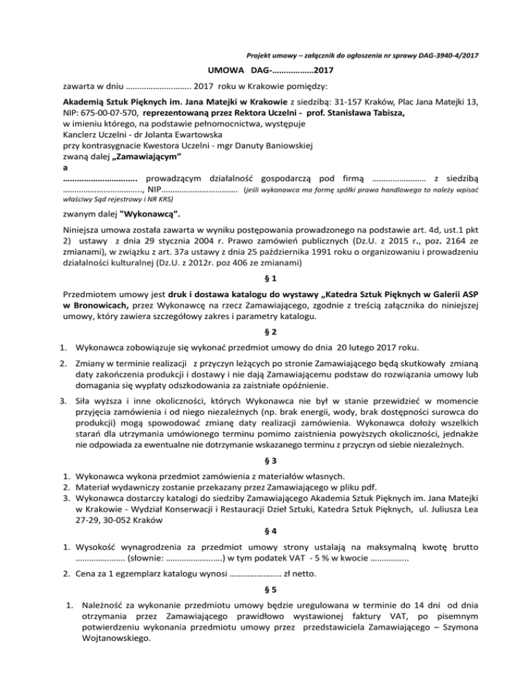 Projekt umowy – załącznik do ogłoszenia nr sprawy DAG-3940-4/2017 UMOWA DAG-………………2017 zawarta w dniu ……………………….. 2017 roku w Krakowie pomiędzy: Akademią Sztuk Pięknych im. Jana Matejki w Krakowie z siedzibą: 31-157 Kraków, Plac Jana Matejki 13, NIP: 675-00-07-570, reprezentowaną przez Rektora Uczelni - prof. Stanisława Tabisza, w imieniu którego, na podstawie pełnomocnictwa, występuje Kanclerz Uczelni - dr Jolanta Ewartowska przy kontrasygnacie Kwestora Uczelni - mgr Danuty Baniowskiej zwaną dalej „Zamawiającym” a ………………………….. prowadzącym działalność gospodarczą pod firmą …………………… z siedzibą …………………………….., NIP……………………………. (jeśli wykonawca ma formę spółki prawa handlowego to należy wpisać właściwy Sąd rejestrowy i NR KRS) zwanym dalej "Wykonawcą”. Niniejsza umowa została zawarta w wyniku postępowania prowadzonego na podstawie art. 4d, ust.1 pkt 2) ustawy z dnia 29 stycznia 2004 r. Prawo zamówień publicznych (Dz.U. z 2015 r., poz. 2164 ze zmianami), w związku z art. 37a ustawy z dnia 25 października 1991 roku o organizowaniu i prowadzeniu działalności kulturalnej (Dz.U. z 2012r. poz 406 ze zmianami) §1 Przedmiotem umowy jest druk i dostawa katalogu do wystawy „Katedra Sztuk Pięknych w Galerii ASP w Bronowicach, przez Wykonawcę na rzecz Zamawiającego, zgodnie z treścią załącznika do niniejszej umowy, który zawiera szczegółowy zakres i parametry katalogu. §2 1. Wykonawca zobowiązuje się wykonać przedmiot umowy do dnia 20 lutego 2017 roku. 2. Zmiany w terminie realizacji z przyczyn leżących po stronie Zamawiającego będą skutkowały zmianą daty zakończenia produkcji i dostawy i nie dają Zamawiającemu podstaw do rozwiązania umowy lub domagania się wypłaty odszkodowania za zaistniałe opóźnienie. 3. Siła wyższa i inne okoliczności, których Wykonawca nie był w stanie przewidzieć w momencie przyjęcia zamówienia i od niego niezależnych (np. brak energii, wody, brak dostępności surowca do produkcji) mogą spowodować zmianę daty realizacji zamówienia. Wykonawca dołoży wszelkich starań dla utrzymania umówionego terminu pomimo zaistnienia powyższych okoliczności, jednakże nie odpowiada za ewentualne nie dotrzymanie wskazanego terminu z przyczyn od siebie niezależnych. §3 1. Wykonawca wykona przedmiot zamówienia z materiałów własnych. 2. Materiał wydawniczy zostanie przekazany przez Zamawiającego w pliku pdf. 3. Wykonawca dostarczy katalogi do siedziby Zamawiającego Akademia Sztuk Pięknych im. Jana Matejki w Krakowie - Wydział Konserwacji i Restauracji Dzieł Sztuki, Katedra Sztuk Pięknych, ul. Juliusza Lea 27-29, 30-052 Kraków §4 1. Wysokość wynagrodzenia za przedmiot umowy strony ustalają na maksymalną kwotę brutto …………………. (słownie: …………………….) w tym podatek VAT - 5 % w kwocie …………….. 2. Cena za 1 egzemplarz katalogu wynosi ………………….. zł netto. §5 1. Należność za wykonanie przedmiotu umowy będzie uregulowana w terminie do 14 dni od dnia otrzymania przez Zamawiającego prawidłowo wystawionej faktury VAT, po pisemnym potwierdzeniu wykonania przedmiotu umowy przez przedstawiciela Zamawiającego – Szymona Wojtanowskiego. 2. Strony uzgodniły, że zapłata należności będzie dokonana w formie przelewu na konto Wykonawcy wskazane na fakturze. 3. Strony postanawiają, że zapłata następuje w dniu obciążenia rachunku bankowego Zamawiającego. §6 1. Reklamacje mogą dotyczyć braków ilościowych, wad jakościowych całości lub części wykonanego przedmiotu umowy lub zastosowanych procesów technologicznych, za które odpowiada Wykonawca. 2. Zamawiający ma prawo złożyć reklamację ilościową w ciągu 7 dni od daty przekazania całości nakładu, a jakościową w ciągu 14 dni, wyznaczając Wykonawcy dodatkowy, nie dłuższy niż 5 dni termin na wykonanie przedmiotu umowy zgodnie z jej zapisami. §7 1. Strony ustanawiają odpowiedzialność za niewykonanie lub nienależyte wykonanie umowy w formie kar umownych . 2. Wykonawca zapłaci Zamawiającemu kary umowne : a) za zwłokę w wykonaniu przedmiotu umowy w wysokości 0,05% maksymalnego wynagrodzenia określonego w § 4 ust.1 za każdy dzień zwłoki w wykonaniu przedmiotu umowy, z wyłączeniem okoliczności wskazanych w § 2 ust. 2, § 2 ust. 3, których to wystąpienie nie stanowi zwłoki w wykonaniu przedmiotu umowy; b) z tytułu odstąpienia od umowy w całości przez którąkolwiek ze stron z winy Wykonawcy, w wysokości 10% maksymalnego wynagrodzenia określonego w § 4 ust.1; c) z tytułu odstąpienia od umowy w części przez którąkolwiek ze stron z winy Wykonawcy, w wysokości 10 % od kwoty stanowiącej różnicę pomiędzy maksymalną łączną wartością prac objętych niniejszą umową a wynagrodzeniem brutto za prace wykonane i odebrane przez Zamawiającego. 3. Zamawiający zapłaci Wykonawcy karę umowną: a) z tytułu odstąpienia od umowy w całości przez którąkolwiek ze stron z winy Zamawiającego, w wysokości 10% maksymalnego wynagrodzenia określonego w § 4 ust.1; b) z tytułu odstąpienia od umowy w części przez którąkolwiek ze stron z winy Zamawiającego, w wysokości 10% maksymalnego wynagrodzenia określonego w § 4 ust 1. 4. Jeżeli kary umowne nie pokryją poniesionej szkody, Strony niniejszej umowy zastrzegają sobie prawo dochodzenia odszkodowania uzupełniającego na zasadach określonych w art. 471 kodeksu cywilnego do wysokości poniesionej szkody. §8 1. Oprócz przypadków wymienionych w Kodeksie cywilnym Stronom przysługuje prawo odstąpienia od niniejszej umowy w razie zaistnienia okoliczności wskazanych w ust. 2. 2. Zamawiający może odstąpić od umowy w terminie do 14 dni od dnia powzięcia wiadomości o zaistnieniu jednej z poniższych okoliczności: 3. a) zostanie podjęta likwidacja Wykonawcy, b) został 