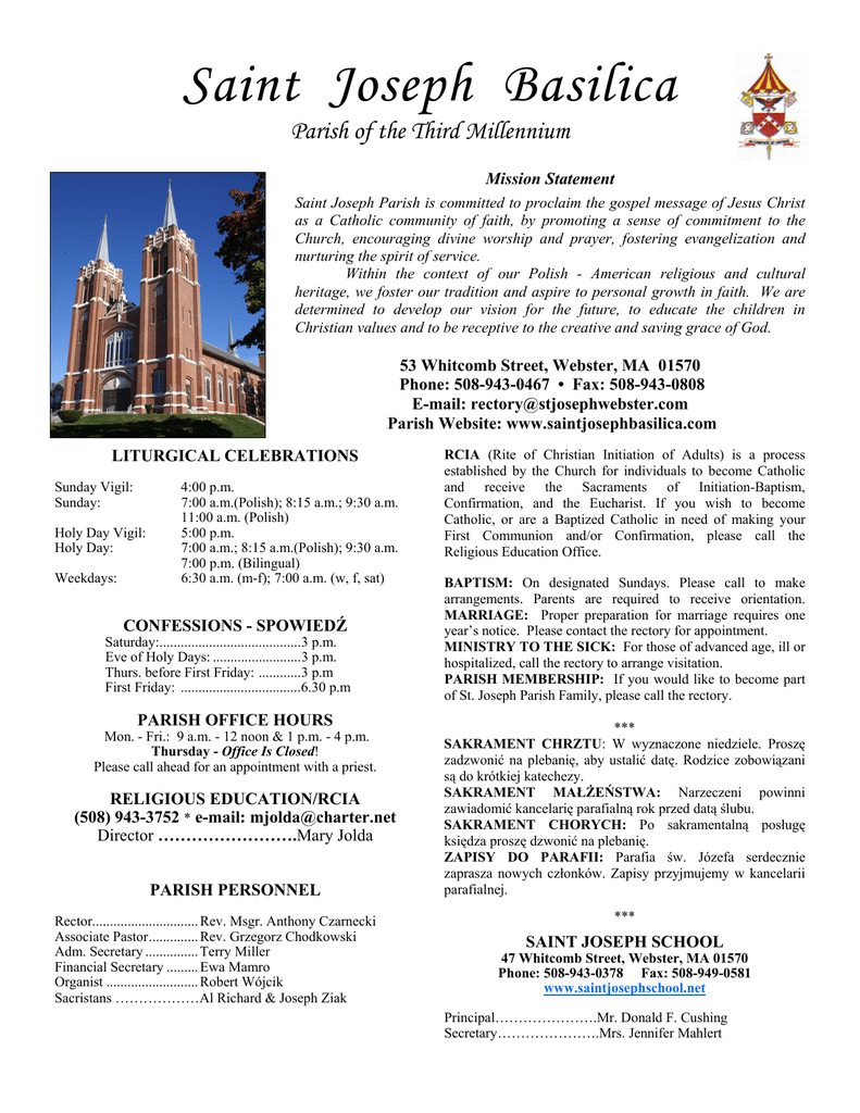 Saint Joseph Basilica Parish of the Third Millennium Mission Statement Saint Joseph Parish is committed to proclaim the gospel message of Jesus Christ as a Catholic community of faith, by promoting a sense of commitment to the Church, encouraging divine worship and prayer, fostering evangelization and nurturing the spirit of service. Within the context of our Polish - American religious and cultural heritage, we foster our tradition and aspire to personal growth in faith. We are determined to develop our vision for the future, to educate the children in Christian values and to be receptive to the creative and saving grace of God. 53 Whitcomb Street, Webster, MA 01570 Phone: 508-943-0467 • Fax: 508-943-0808 E-mail: [email protected] Parish Website: www.saintjosephbasilica.com LITURGICAL CELEBRATIONS Sunday Vigil: Sunday: Holy Day Vigil: Holy Day: Weekdays: 4:00 p.m. 7:00 a.m.(Polish); 8:15 a.m.; 9:30 a.m. 11:00 a.m. (Polish) 5:00 p.m. 7:00 a.m.; 8:15 a.m.(Polish); 9:30 a.m. 7:00 p.m. (Bilingual) 6:30 a.m. (m-f); 7:00 a.m. (w, f, sat) CONFESSIONS - SPOWIEDŹ Saturday:........................................3 p.m. Eve of Holy Days: .........................3 p.m. Thurs. before First Friday: ............3 p.m First Friday: ..................................6.30 p.m PARISH OFFICE HOURS Mon. - Fri.: 9 a.m. - 12 noon & 1 p.m. - 4 p.m. Thursday - Office Is Closed! Please call ahead for an appointment with a priest. RELIGIOUS EDUCATION/RCIA (508) 943-3752 * e-mail: [email protected] Director …………………….Mary Jolda PARISH PERSONNEL Rector.............................. Rev. Msgr. Anthony Czarnecki Associate Pastor.............. Rev. Grzegorz Chodkowski Adm. Secretary ............... Terry Miller Financial Secretary ......... Ewa Mamro Organist .......................... Robert Wójcik Sacristans ………………Al Richard & Joseph Ziak RCIA (Rite of Christian Initiation of Adults) is a process established by the Church for individuals to become Catholic and receive the Sacraments of Initiation-Baptism, Confirmation, and the Eucharist. If you wish to become Catholic, or are a Baptized Catholic in need of making your First Communion and/or Confirmation, please call the Religious Education Office. BAPTISM: On designated Sundays. Please call to make arrangements. Parents are required to receive orientation. MARRIAGE: Proper preparation for marriage requires one year’s notice. Please contact the rectory for appointment. MINISTRY TO THE SICK: For those of advanced age, ill or hospitalized, call the rectory to arrange visitation. PARISH MEMBERSHIP: If you would like to become part of St. Joseph Parish Family, please call the rectory. *** SAKRAMENT CHRZTU: W wyznaczone niedziele. Proszę zadzwonić na plebanię, aby ustalić datę. Rodzice zobowiązani są do krótkiej katechezy. SAKRAMENT MAŁŻEŃSTWA: Narzeczeni powinni zawiadomić kancelarię parafialną rok przed datą ślubu. SAKRAMENT CHORYCH: Po sakramentalną posługę księdza proszę dzwonić na plebanię. ZAPISY DO PARAFII: Parafia św. Józefa serdecznie zaprasza nowych członków. Zapisy przyjmujemy w kancelarii parafialnej. *** SAINT JOSEPH SCHOOL 47 Whitcomb Street, Webster, MA 01570 Phone: 508-943-0378 Fax: 508-949-0581 www.saintjosephschool.net Principal………………….Mr. Donald F. Cushing Secretary………………….Mrs. Jennifer Mahlert Page 2 November 20, 2011 - 20 listopada 2011r. Masses for the week—Msze Sw. Podczas Tygodnia Sunday Vigil—November 19 4:00 r.s. Leon Lenkiewicz (25th anniv.) - int. son & daughters Sunday—November 20 7:00 s.p. Henryk Morga - int. Maria Ptak i Teresa Makara 8:15 For all the living & deceased enrolled in Friends of St. Joseph School Fund 9:30 r.s. Sister Sophia Wanda M. Stapor - int. Msgr. Anthony Czarnecki Catholic Youth Group Mass 11:00 s.p. Anna i Valenty Ucher - int. syn, Jan z rodznina Baptism—Neli Maria Kuznecki Monday—November 21 6:30 r.s. Antoinette T. Sroczenski - int. Edward Sitkowski, Roland Malboeuf & John Hickey 2:15pm Lanessa Nursing Home Tuesday—November 22 6:30 r.s. Wanda & Lionel King - int. Dorothy Hanc 7:00 For the parishioners of St. Joseph Basilica Wednesday—November 23 6:30 r.s. Alfreda Cimoch - int. Edward & Anna Kudron 7:00 r.s. Edward J. Motyka - int. Edward Sitkowski, Roland Malboeuf & John Hickey Thursday—November 24—Thanksgiving Day 6:30 r.s. John Dudek (11th anniv.) - int. Dudek, Moroz and Jankowski families Friday—November 25 6:30 r.s. Warren A. Rekowski - int. Rose Rekowski & family 7:00 s.p. Walenty Grzegorzek int. Wanda Chwaszczynski Saturday—November 26 7:00 r.s. Stasia Laskowski - int. Pat & Don Masse 4:00 r.s. Catherine Knych - int. M/M Bernard Knych & family Sunday—November 27 7:00 For the parishioners of St. Joseph Basilica 8:15 In thanksgiving to the Polish Womens’ Club for all their kindness and generosity to Sr. Jeanne Marie Akalski, Sr. Mary Valenta & Sr. Mary Ann Papiez 9:30 r.s. Francis Mleczko & Veronica & Joseph Mleczko - int. Chmielewski family 11:00 s.p. Jan Bozek (8th anniv.) - int. family 1-25 Winner for 8th week—#187 Robert Lavallee Captain Pat Parslow 9th Week—#5 Scott Wagner (Captain Theresa Wagner) SHARING OUR BLESSINGS—November 13, 2011 Weekly $5245 (incl. $253.50 in loose money) Diocesan Obligations $91; Fuel $2179.25 (incl. $101.25 in loose money); Weekly Budget $7500 Stewardship Note. When the Son of Man comes in glory, may we be among those who have fed the hungry, welcomed the stranger, and clothed the naked. For Jesus tells us clearly that it is those who have demonstrated good stewardship by sharing their gifts with the less fortunate who will receive God’s blessing and inherit the kingdom. Word of Life. These witnesses (young people with severe disabilities) speak to us, first and foremost, of the dignity of all human life, created in the image of God. No suffering can efface this divine image imprinted in the depths of our humanity. But there is more: because the Son of God wanted 