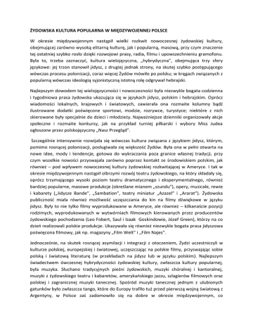 ŻYDOWSKA KULTURA POPULARNA W MIĘDZYWOJENNEJ POLSCE W okresie międzywojennym nastąpił wielki rozkwit nowoczesnej żydowskiej kultury, obejmującej zarówno wysoką elitarną kulturę, jak i popularną, masową, przy czym znaczenie tej ostatniej szybko rosło dzięki rozwojowi prasy, radia, filmu i upowszechnieniu gramofonu. Była to, trzeba zaznaczyd, kultura wielojęzyczna, „hybrydyczna”, obejmująca trzy sfery językowe: jej trzon stanowił jidysz, z drugiej jednak strony, na skutej szybko postępującego wówczas procesu polonizacji, coraz więcej Żydów mówiło po polsku; w kręgach związanych z popularną wówczas ideologią syjonistyczną istotną rolę odgrywał hebrajski. Najlepszym dowodem tej wielojęzyczności i nowoczesności była niezwykle bogata codzienna i tygodniowa prasa żydowska ukazująca się w językach jidysz, polskim i hebrajskim. Oprócz wiadomości lokalnych, krajowych i światowych, zawierała ona rozmaite kolumny bądź ilustrowane dodatki poświęcone sportowi, modzie, rozrywce, turystyce; niektóre z nich skierowane były specjalnie do dzieci i młodzieży. Najważniejsze dzienniki organizowały akcje społeczne i rozmaite konkursy, jak na przykład turniej piłkarski i wybory Miss Judea ogłoszone przez polskojęzyczny „Nasz Przegląd”. Szczególnie intensywnie rozwijała się wówczas kultura związana z językiem jidysz, którym, pomimo rosnącej polonizacji, posługiwała się większośd Żydów. Była ona w pełni otwarta na nowe idee, mody i tendencje, gotowa do wykraczania poza granice własnej tradycji, przy czym wszelkie nowości przyswajała zarówno poprzez kontakt ze środowiskiem polskim, jak również – pod wpływem nowoczesnej kultury żydowskiej rozkwitającej w Ameryce. I tak w okresie międzywojennym nastąpił olbrzymi rozwój teatru żydowskiego, na który składały się, oprócz trzymającego wysoki poziom teatru dramatycznego i eksperymentalnego, również bardziej popularne, masowe produkcje (określane mianem „szundu”), opery, musicale, rewie i kabarety („Jidysze Bande”, „Sambation”, teatry miniatur „Azazel” i „Ararat”). Żydowska publicznośd miała również możliwośd uczęszczania do kin na filmy dźwiękowe w języku jidysz. Były to nie tylko filmy wyprodukowane w Ameryce, ale również – kilkanaście pozycji rodzimych, wyprodukowanych w wytwórniach filmowych kierowanych przez producentów żydowskiego pochodzenia (Leo Fobert, Saul i Izaak Goskindowie, Józef Green), którzy na co dzieo realizowali polskie produkcje. Ukazywała się również niezwykle bogata prasa jidyszowa poświęcona filmowy, jak np. magazyny „Film Welt” i „Film Najes”. Jednocześnie, na skutek rosnącej asymilacji i integracji z otoczeniem, Żydzi uczestniczyli w kulturze polskiej, europejskiej i światowej, uczęszczając na polskie filmy, przyswajając sobie polską i światową literaturę (w przekładach na jidysz lub w języku polskim). Najlepszym świadectwem ówczesnej hybrydyczności żydowskiej kultury, zwłaszcza kultury popularnej, była muzyka. Słuchano tradycyjnych pieśni żydowskich, muzyki chóralnej i kantoralnej, muzyki z żydowskiego teatru i kabaretów, amerykaoskiego jazzu, szlagierów filmowych oraz polskiej i zagranicznej muzyki tanecznej. Spośród muzyki tanecznej jednym z ulubionych gatunków było zwłaszcza tango, które do Europy trafiło tuż przed pierwszą wojną światową z Argentyny, w Polsce zaś zadomowiło się na dobre w okresie międzywojennym, co zaowocowało olbrzymią liczby rodzimych kompozycji. Żydowska publicznośd miała możliwośd słuchania również jidyszowych wersji popularnych tanecznych szlagierów. Utwory te postawały nie tylko w Polsce, ale przede wszystkim tworzone były przez Żydów w Buenos Aires czy Nowym Jorku, które to miasta były wówczas głównymi ośrodkami żydowskiego teatru i przemysłu rozrywkowego. W przypadku kultury żydowskiej to przekraczanie granic i kontynentów było ułatwione ze względu na wspólnotę języka, tym bardziej, że wiele trup i artystów żydowskich z Ameryki przejeżdżało na występy do Europy. Najbardziej znanym „importem” z Ameryki jest dziś „Miasteczko Bełz”, do którego muzykę skomponował amerykaoskie-żydowski kompozytor pochodzący z Rosji, Alexander Olshanetsky. *** Kolejnym świadectwem hybrydyczności i przenikania się kultur w okresie międzywojennym był wkład Żydów w rozwój polskiej kultury. Bardziej lub mniej zasymilowani Żydzi - artyści, literaci, publicyści - byli obecni w głównych ugrupowaniach artystycznych i literackich okresu międzywojennego (skamandryci, futuryści, wydawcy najważniejszego pisma kulturalnego tygodnika „Wiadmości Literackie”, formiści, rytmiści, szkoła paryska). Szczególnie duży był wkład twórców pochodzenia żydowskiego w rozwój przemysłu rozrywkowego. Wymienieni powyżej producenci, reżyserzy (Aleksander Ford, Henryk Szaro, Michał Waszyoski, Aleksander Marten, Zygmunt Turkow) i scenarzyści (Henryk Bojm, Konrad Tom, Mark Arnstein)], oprócz kilku produkcji jidyszowych, byli przede wszystkim autorami głównych przebojów polskiego międzywojennego kina, z takimi aktorami jak Eugeniusz Bodo, Nora Ney, Maria Malicka. Inną ważną dziedziną był niezwykle popularny w okresie międzywojennym kabaret. Wielką popularnością cieszyły się satyryczne teksty i piosenki Mariana Hemara współpracującego z kabaretami „Qui pro Quo”, „Małe Qui Pro Quo” „Cyrulik Warszawski”, dla których teksty pisali również Julian Tuwim i Antoni Słonimski. Występy z udziałem znanych aktorów, jak Adolf Dymsza, Eugeniusz Bodo, Kazimierz Krukowski, Hanka Ordonówna i Zula Pogorzelska odbywały się w głównych lokalach stolicy, m.in. w kawiarni „Ziemiaoska”. Oprócz Hemara, należy wymienid Konrada Toma, aktora, reżysera i autora scenariuszów i tekstów kabaretowych, współpracującego z kabaretami „Miraż”, „Banda”,