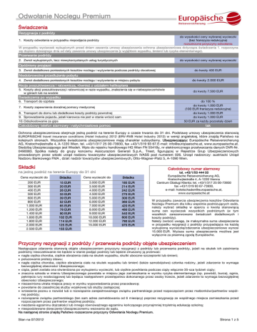 Odwołanie Noclegu Premium Świadczenia Rezygnacja z podróży do wysokości ceny wybranej wycieczki (bez franszyza redukcyjna) rozszerzone przyczyny odwołania W przypadku wycieczek wykupionych przed dniem zawarcia umowy ubezpieczenia ochrona ubezpieczeniowa dotycząca świadczenia 1. rozpoczyna się dopiero dziesiątego dnia od daty zawarcia umowy ubezpieczenia (z wyjątkiem wypadku, śmierci lub ryzyka elementarnego). 1. Koszty odwołania w przypadku niepodjęcia podróży Przerwanie podróży 2. Zwrot wykupionych, lecz niewykorzystanych usług turystycznych do wysokości ceny wybranej wycieczki Opóźniony przyjazd 3. Zwrot dodatkowo poniesionych kosztów noclegu i wyżywienia podczas podróży docelowej do kwoty 400 EUR Niedobrowolne przedłużenie pobytu do kwoty 2.000 EUR 4. Zwrot dodatkowo poniesionych kosztów noclegu i wyżywienia w miejscu pobytu Akcja poszukiwawcza i ratownicza, również z udziałem helikoptera 5. Koszty akcji poszukiwawczej i ratowniczej w razie wypadku, znalezienia się w niebezpieczeństwie w górach lub na wodzie do kwoty 7.500 EUR Świadczenia po wypadku 6. Transport do szpitala do 100 % do kwoty 1.000 EUR (100 EUR franszyza redukcyjna) do kwoty 1.000 EUR do kwoty 1.000 EUR 50 EUR za każdy pozostały dzień 7. Koszty zapewnienia doraźnej pomocy medycznej 8. Transport do domu lub dodatkowe koszty podróży powrotnej 9. Sprowadzenie pojazdu, jeżeli kierowca nie jest w stanie wrócić sam 10. Odszkodowanie za gips Całodobowy telefon alarmowy i natychmiastowa pomoc tak Ochrona ubezpieczeniowa obejmuje jedną podróż na terenie Europy o czasie trwania do 31 dni. Podstawę umowy ubezpieczenia stanowią EUROPÄISCHE travel insurance conditions (Hotel Industry) 2012 (ERV-RVB Hotel Industry 2012) w wersji angielskiej, które znajdą Państwo na kolejnych stronach. Wszystkie świadczenia ubezpieczeniowe mają charakter subsydiarny. Ubezpieczający: Europäische Reiseversicherung AG, Kratochwjlestraße 4, A-1220 Wien. tel. +43/1/317 25 00-73930, fax +43/1/319 93 67.E-mail: [email protected], www.europaeische.at. Siedzibą Ubezpieczającego jest Wiedeń. Wpis do rejestru handlowego HG Wien FN 55418y, nr elektronicznego przetwarzania danych DVR-Nr. 0490083. Spółka należy do grupy koncernu Assicurazioni Generali S.p.A., Triest, figurującej w Rejestrze Grup Ubezpieczeniowych prowadzonym przez włoski urząd nadzoru towarzystw ubezpieczeniowych IVASS pod numerem 026. Urząd nadzorczy: austriacki Urząd Nadzoru Bankowego FMA , dział: nadzór towarzystw ubezpieczeniowych, Otto-Wagner-Platz 5, A-1090 Wien. Składki Całodobowy numer alarmowy na jedną podróż na terenie Europy do 31 dni Cena wycieczki do Składka Cena wycieczki do Składka 200 EUR 300 EUR 400 EUR 500 EUR 600 EUR 800 EUR 1.000 EUR 1.200 EUR 1.400 EUR 1.600 EUR 1.800 EUR 2.000 EUR 2.500 EUR 15 EUR 20 EUR 26 EUR 33 EUR 39 EUR 52 EUR 65 EUR 78 EUR 90 EUR 102 EUR 114 EUR 125 EUR 155 EUR 3.000 EUR 3.500 EUR 4.000 EUR 4.500 EUR 5.000 EUR 6.000 EUR 7.000 EUR 8.000 EUR 9.000 EUR 10.000 EUR 12.000 EUR 15.000 EUR 185 EUR 214 EUR 242 EUR 270 EUR 300 EUR 360 EUR 420 EUR 480 EUR 540 EUR 600 EUR 780 EUR 975 EUR tel. +43/1/50 444 00 Europäische Reiseversicherung AG, Kratochwjlestraße 4, A-1220 Vienna Centrum Obsługi Klienta: tel. +43/1/317 25 00-73930 fax +43/1/319 93 67-73930, e-mail: [email protected], www.europaeische.at W przypadku zawarcia ubezpieczenia kosztów Odwołania Noclegu Premium dla kilku wspólnie podróżujących osób, należy wybrać składkę w oparciu o kwotę stanowiącą sumę cen wycieczek wszystkich podróżnych (w tym wszelkich zarezerwowane świadczeń dodatkowych i koszty podróży). Należy zwrócić uwagę, że maksymalna suma ubezpieczenia w przypadku rezygnacji z podróży przypadająca na każdą wykupioną wycieczkę/zdarzenie ubezpieczeniowe wynosi 15.000 EUR. Wyższa suma ubezpieczenia możliwa jest wyłącznie za pisemną zgodą Europäische. Przyczyny rezygnacji z podróży / przerwania podróży objęte ubezpieczeniem Następujące zdarzenia stanowią objęte ubezpieczeniem przyczyny rezygnacji z podróży lub przerwania podróży, jeżeli na skutek ich zaistnienia podróżny nieoczekiwanie nie będzie w stanie podjąć podróży lub będzie zmuszony ją przerwać: nagła ciężka choroba, ciężkie obrażenia ciała na skutek wypadku, skutki uboczne szczepionki lub śmierć; poluzowanie protezy stawu; nagła ciężka choroba, ciężkie obrażenia ciała na skutek wypadku lub śmierć (także samobójstwo) członka rodziny, jeżeli zdarzenie to wymaga bezwzględnej obecności Ubezpieczonego; ciąża, jeżeli została ona stwierdzona po wykupieniu wycieczki, lub ciężkie powikłania podczas ciąży włącznie 35-sza tydzień ciąży; znaczna szkoda w mieniu Ubezpieczonego powstała w miejscu jego zamieszkania w wyniku ryzyka elementarnego (np. powódź, burza), ognia, pęknięcia rury wodociągowej lub będąca następstwem przestępstwa dokonanego przez osoby trzecie, jeżeli zdarzenie to wymaga bezwzględnej obecności Ubezpieczonego; niezawiniona utrata miejsca pracy w wyniku wypowiedzenia przez pracodawcę; powołanie do zasadniczej służby wojskowej lub służby zastępczej; wniesienie pozwu o rozwód lub o rozwiązanie zarejestrowanego związku partnerskiego przed rozpoczęciem przez małżonków/partnerów wspólnej podróży; rozwiązanie związku partnerskiego (ten sam adres zameldowania od 6 miesięcy) poprzez rezygnację ze wspólnego miejsca zamieszkania przed rozpoczęciem przez partnerów wspólnej podróży; niezdanie egzaminu dojrzałości lub innego równoważnego egzaminu kończącego przynajmniej trzyletnią edukację szkolną; niespodziewane doręczenie Ubezpieczonemu wezwania do sądu. Na następnej stronie znajdą Państwo rozszerzone przyczyny Odwołania Noclegu Premium. Stan na 07/2012 Strona 1 z 5 Odwołanie Noclegu Premium: rozszerzone przyczyny odwołania Odwołanie Noclegu Premium dodatkowo zawiera następujące przyczyny rezygnacji z podr