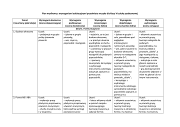 Plan wynikowy z wymaganiami edukacyjnymi przedmiotu muzyka dla klasy VI szkoły podstawowej Temat (rozumiany jako lekcja) Wymagania konieczne (ocena dopuszczająca) 1. Budowa okresowa Uczeń: – podejmuje w grupie próby śpiewania piosenki. 2. Forma AB i ABA Uczeń: – wykonuje pracę plastyczną inspirowaną utworem muzycznym; – słucha muzyki w ciszy i w skupieniu; Wymagania Wymagania podstawowe rozszerzające (ocena dostateczna) (ocena dobra) Dział 1. Formy muzyczne Uczeń: Uczeń: – śpiewa w grupie – wyjaśnia, co to jest piosenkę; budowa okresowa; – wie, czym są – w prostym utworze poprzednik i następnik. wyodrębnia ze słuchu poprzednik i następnik; – uczestniczy w pracach grupy tworzącej następniki do podanych poprzedników; – z pomocą nauczyciela, korzystając z wybranego instrumentu szkolnego, odczytuje zapisane za pomocą nut poprzedniki. Uczeń: – wykonuje pracę plastyczną inspirowaną utworem muzycznym, która spełnia wymogi postawione przez Uczeń: – bierze aktywny udział w pracach zespołu opracowującego ilustrację muzyczną o zadanej formie; Wymagania dopełniające (ocena bardzo dobra) Wymagania wykraczające (ocena celująca) Uczeń: – śpiewa w grupie i solo, prawidłowo pod względem intonacyjnym i rytmicznym piosenkę; – wie, jakie znaczenie w budowie okresowej utworu ma następstwo akordów D-T; – aktywnie uczestniczy w pracach grupy, tworząc następniki do podanych poprzedników, ma twórczy wkład w powstałe „dzieło”; – korzystając z wybranego instrumentu szkolnego, samodzielnie odczytuje poprzedniki zapisane za pomocą nut. Uczeń: – aktywnie uczestniczy w pracach grupy, tworząc ilustracje muzyczne o określonej formie, ma twórczy Uczeń: – aktywnie uczestniczy w pracach grupy, tworząc następniki do podanych poprzedników, ma twórczy wkład w powstałe „dzieło”, a jego rozwiązania są nietypowe, ciekawe; – odczytuje a vista głosem zapisane w nutach poprzedniki; – gra akompaniament do piosenki Odpowie ci wiatr na gitarze lub na innym instrumencie. Uczeń: – aktywnie uczestniczy w pracach grupy, tworząc ilustracje muzyczne o określonej formie, ma twórczy – bierze udział w pracach zespołu opracowującego ilustrację muzyczną o zadanej formie. nauczyciela – przedstawia formę dwuczęściową; – bierze aktywny udział w pracach zespołu opracowującego ilustrację muzyczną o zadanej formie. 3. Wariacje Uczeń: – słucha muzyki w ciszy i w skupieniu; – podejmuje próby śpiewania piosenki w grupie. Uczeń: – podejmuje próby odczytania z nut i zagrania na instrumencie szkolnym melodii Trzy kurki; – śpiewa w grupie piosenkę. 4. Rondo Uczeń: – słucha muzyki w ciszy i w skupieniu; – wykonuje ćwiczenia zaproponowane przez nauczyciela. Uczeń: – wie, że rondo składa się z refrenów i kupletów; – podczas słuchania ronda zauważa powrót refrenu. 5. Pieśń solowa Uczeń: – podejmuje próby śpiewania pieśni w grupie. Uczeń: – śpiewa pieśń w grupie; – wskazuje w pieśni zwrotki i refren. – określa prostą formę AB lub ABA wysłuchanego utworu; – aktywnie słucha muzyki, z pomocą nauczyciela odczytuje akompaniament perkusyjny do słuchanego utworu. Uczeń: – nadaje tytuły wysłuchanym wariacjom, tworząc historię Jeden dzień z życia kurnika; – wyjaśnia, jak powstaje forma tematu z wariacjami. Uczeń: – z pomocą nauczyciela odczytuje jedną z partii instrumentalnych w opracowaniu fragmentu Dla Elizy L. van Beethovena; – improwizuje proste kuplety do zadanego refrenu; – wie, jak jest zbudowane rondo. Uczeń: – wyjaśnia, co to jest pieśń; – określa, czy dana pieśń jest pieśnią wkład w powstałe „dzieło”; – aktywnie słucha muzyki, samodzielnie odczytuje akompaniament perkusyjny do słuchanego utworu. wkład w powstałe „dzieło”, a jego pomysły i rozwiązania są innowacyjne, nietypowe, ciekawe. Uczeń: – śpiewa w grupie i solo, prawidłowo pod względem intonacyjnym i rytmicznym piosenkę. Uczeń: – tworzy własne wariacje na temat piosenki Trzy kurki. Uczeń: – samodzielnie odczytuje jedną z partii instrumentalnych w opracowaniu fragmentu Dla Elizy L. van Beethovena; – określa formę słuchanego utworu i zapisuje ją z użyciem wielkich liter. Uczeń: – gra w zespole opracowanie fragmentu Dla Elizy L. van Beethovena; – improwizuje kuplety do zadanego refrenu, a jego pomysły są ciekawe, niekonwencjonalne. Uczeń: – śpiewa w grupie i solo, prawidłowo pod względem rytmicznym i melodycznym; Uczeń: – gra akompaniament do wybranej pieśni; – śpiewa inną pieśń niż poznane na lekcjach zwrotkową, czy zwrotkową z refrenem. 6. Opera Uczeń: – słucha muzyki w ciszy i w skupieniu; – podejmuje próby śpiewania w grupie. Uczeń: – wyjaśnia, co to jest opera; – wymienia przynajmniej dwa głosy żeńskie i dwa głosy męskie; – podejmuje trud odczytania zapisu nutowego, wymaga przy tym bardzo dużej pomocy nauczyciela; – śpiewa w grupie; – improwizuje taniec – gesty podczas słuchania muzyki. 7. Balet Uczeń: – podejmuje próby aktywnego słuchania muzyki w grupie. Uczeń: – wyjaśnia, co to jest balet; – wymienia grupy instrumentów. Uczeń: – wyjaśnia pojęcia: libretto, aria, ansambl, scenografia, scenograf, rekwizyt, kostiumolog, inspicjent, uwertura; – szereguje głosy ludzkie od najwyższego do najniższego; – wymienia głosy męskie i żeńskie; – z pomocą nauczyciela odczytuje zapis nutowy, gra fragment wybranej arii lub uwertury na dowolnym instrumencie szkolnym, zdarzają mu się pomyłki melodyczne i rytmiczne. Uczeń: – wyjaśnia pojęcia: taniec klasyczny, pointy; – wymienia przynajmniej trzy tytuły – wypowiada się na temat roli akompaniamentu w pieśni Prząśniczka; – wyszukuje w internecie lub w innych źródłach tytuły pieśni polskich kompozytorów. Uczeń: – samodzielnie odczytuje zapis nutowy, gra fragment wybranej arii lub