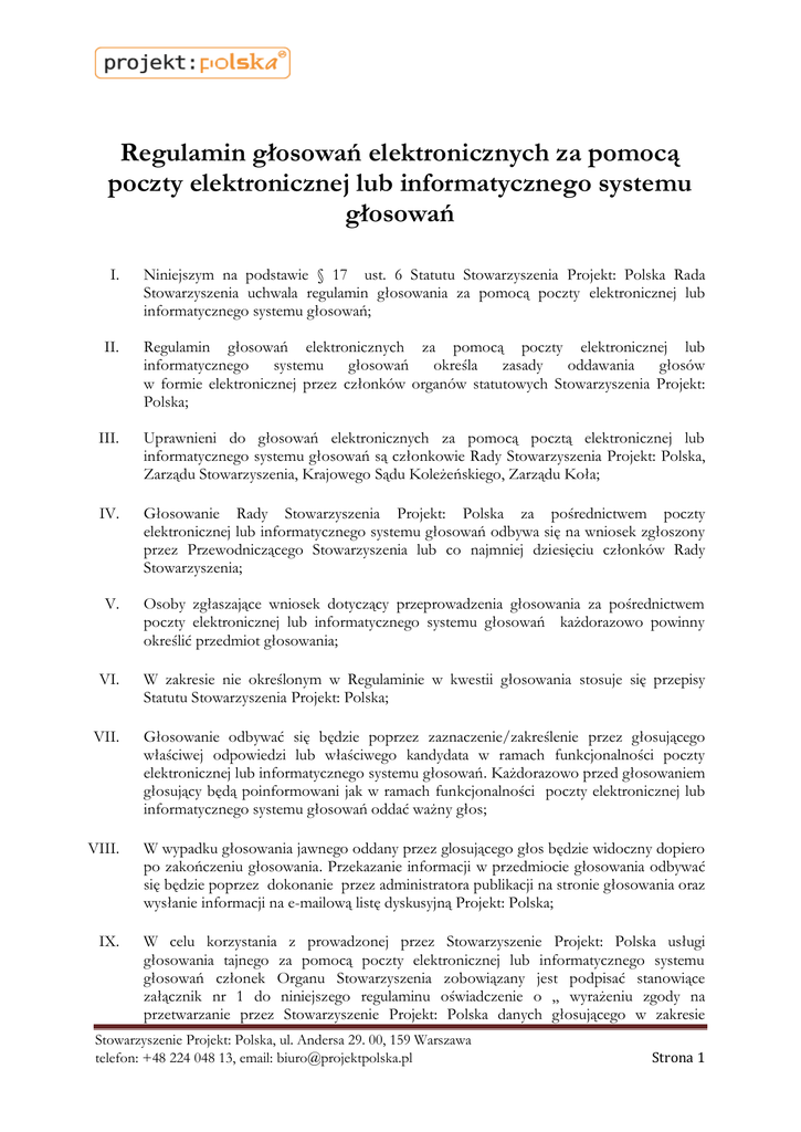 Regulamin głosowań elektronicznych za pomocą poczty elektronicznej lub informatycznego systemu głosowań I. Niniejszym na podstawie § 17 ust. 6 Statutu Stowarzyszenia Projekt: Polska Rada Stowarzyszenia uchwala regulamin głosowania za pomocą poczty elektronicznej lub informatycznego systemu głosowań; II. Regulamin głosowań elektronicznych za pomocą poczty elektronicznej lub informatycznego systemu głosowań określa zasady oddawania głosów w formie elektronicznej przez członków organów statutowych Stowarzyszenia Projekt: Polska; III. Uprawnieni do głosowań elektronicznych za pomocą pocztą elektronicznej lub informatycznego systemu głosowań są członkowie Rady Stowarzyszenia Projekt: Polska, Zarządu Stowarzyszenia, Krajowego Sądu Koleżeńskiego, Zarządu Koła; IV. Głosowanie Rady Stowarzyszenia Projekt: Polska za pośrednictwem poczty elektronicznej lub informatycznego systemu głosowań odbywa się na wniosek zgłoszony przez Przewodniczącego Stowarzyszenia lub co najmniej dziesięciu członków Rady Stowarzyszenia; V. Osoby zgłaszające wniosek dotyczący przeprowadzenia głosowania za pośrednictwem poczty elektronicznej lub informatycznego systemu głosowań każdorazowo powinny określić przedmiot głosowania; VI. W zakresie nie określonym w Regulaminie w kwestii głosowania stosuje się przepisy Statutu Stowarzyszenia Projekt: Polska; VII. Głosowanie odbywać się będzie poprzez zaznaczenie/zakreślenie przez głosującego właściwej odpowiedzi lub właściwego kandydata w ramach funkcjonalności poczty elektronicznej lub informatycznego systemu głosowań. Każdorazowo przed głosowaniem głosujący będą poinformowani jak w ramach funkcjonalności poczty elektronicznej lub informatycznego systemu głosowań oddać ważny głos; VIII. W wypadku głosowania jawnego oddany przez glosującego głos będzie widoczny dopiero po zakończeniu głosowania. Przekazanie informacji w przedmiocie głosowania odbywać się będzie poprzez dokonanie przez administratora publikacji na stronie głosowania oraz wysłanie informacji na e-mailową listę dyskusyjną Projekt: Polska; IX. W celu korzystania z prowadzonej przez Stowarzyszenie Projekt: Polska usługi głosowania tajnego za pomocą poczty elektronicznej lub informatycznego systemu głosowań członek Organu Stowarzyszenia zobowiązany jest podpisać stanowiące załącznik nr 1 do niniejszego regulaminu oświadczenie o ,, wyrażeniu zgody na przetwarzanie przez Stowarzyszenie Projekt: Polska danych głosującego w zakresie Stowarzyszenie Projekt: Polska, ul. Andersa 29. 00, 159 Warszawa telefon: +48 224 048 13, email: [email protected] Strona 1 informacji dotyczących oddanego przez niego głosu w ramach przeprowadzonego za pomocą poczty elektronicznej lub systemu informatycznego głosowania tajnego”; X. Podpisanie oświadczenia jest dobrowolne, lecz niezbędne do oddania głosu w głosowaniu tajnym. Podpisanie oświadczenia uprawnia głosującego do każdorazowego udziału w głosowaniu tajnym, oświadczenie może być odwołane przez głosującego w każdym momencie; XI. Informację o podpisaniu ww. oświadczenia uprawnieni do głosowania tajnego członkowie organów Stowarzyszenia przekazują w formie wiadomości e-mail na adres [email protected] lub telefonicznie, w tym w formie wiadomości sms najpóźniej w dniu poprzedzającym planowane głosowanie. Oryginał podpisanego oświadczenia ww. członkowie składają Zarządowi koła lub bezpośrednio w siedzibie Stowarzyszenie. Zarząd koła przesyła otrzymane oświadczenia na adres siedziby Stowarzyszenia niezwłocznie po ich otrzymaniu; XII. Przetwarzać dane głosującego w zakresie informacji dotyczących oddanego przez niego głosu w ramach przeprowadzonego za pomocą poczty elektronicznej lub systemu informatycznego głosowania tajnego będzie mógł wyłącznie wyznaczony głosowaniem Rady Stowarzyszenia administrator, który podpisze klauzulę o zachowaniu poufności, której treść stanowi załącznik nr 2 do niniejszego regulaminu. Administrator jest powołany bezterminowo, aż do chwili jego odwołania przez Radę Stowarzyszenia; XIII. Głosowanie, którego podmiotem jest Administrator nie może być przeprowadzone za pomocą poczty elektronicznej lub informatycznego systemu głosowań; XIV. Administrator ma obowiązek przedstawić zbiorczą informację o wynikach głosowań elektronicznych, która nie będzie zawierać danych osobowych osób biorących udział w głosowaniu, w terminie nie dłuższym niż 24 h od chwili zakończenia głosowania; XV. Czas na oddanie głosu za pomocą poczty elektronicznej lub informatycznego systemu głosowań wynosi, co najmniej 72 h od chwili ogłoszenia informacji o rozpoczęciu głosowania, w wypadku przedłużenie niniejszego terminu głosujący zostaną poinformowani przez Administratora. Administrator poinformuje każdorazowo głosujących o terminie zakończenia głosowania za pomocą poczty elektronicznej lub elektronicznego systemu głosowań. XVI. Członkowie organów Stowarzyszenia mają prawo wysłać swój głos tylko raz, niedopuszczalne jest poprawianie pierwotnie wysłanego głosu. Oddanie ponownego głosu przez głosującego będzie skutkować unieważnieniem jego głosu; XVII. XVIII. XIX. Regulamin wchodzi z dniem ogłoszenia……………..; Niniejszy regulamin jest dostępny do wglądu w siedzibie Stowarzyszenia Projekt: Polska a także na stronie internetowej……………..; Zmiana regulaminu w formie elektronicznego głosowania jest niemożliwa. Stowarzyszenie Projekt: Polska, ul. Andersa 29. 00, 159 Warszawa telefon: +48 224 048 13, email: [email protected] Strona 2 Załącznik nr 1 Oświadczenie o wyrażeniu zgody na przetwarzanie przez Stowarzyszenie Projekt: Polska danych głosującego w zakresie informacji dotyczących oddanego przez niego głosu w ramach przeprowadzonego za pomocą poczty elektronicznej lub systemu informatycznego głosowania tajnego Wyrażam zgodę na