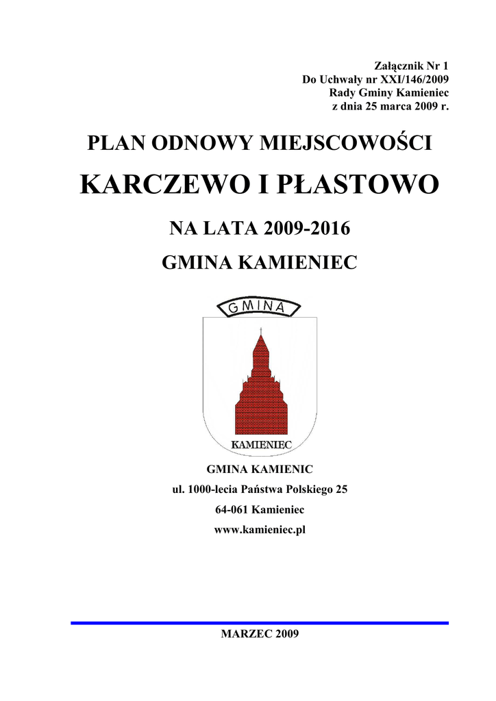 Załącznik Nr 1 Do Uchwały nr XXI/146/2009 Rady Gminy Kamieniec z dnia 25 marca 2009 r. PLAN ODNOWY MIEJSCOWOŚCI KARCZEWO I PŁASTOWO NA LATA 2009-2016 GMINA KAMIENIEC GMINA KAMIENIC ul. 1000-lecia Państwa Polskiego 25 64-061 Kamieniec www.kamieniec.pl MARZEC 2009 Plan Odnowy Miejscowości Karczewo i Płastowo na lata 2009–2016____________________ SPIS TREŚCI WSTĘP ........................................................................................................................................ 4 1. CHARAKTERYSTYKA MIEJSCOWOŚCI, W KTÓREJ BĘDZIE REALIZOWANA OPERACJA ............................................................................................ 6 1.1. Obszar i czas realizacji Planu Odnowy Miejscowości Karczewo i Płastowo ........... 6 1.2. Położenie miejscowości, przynależność administracyjna........................................... 6 1.3. Powierzchnia i struktura użytkowania gruntów ........................................................ 8 1.4. Ludność .......................................................................................................................... 8 1.5. Historia miejscowości .................................................................................................... 8 1.6. Określenie przestrzennej struktury miejscowości – elementy charakterystyczne miejscowości ................................................................................... 9 2. INWENTARYZACJA ZASOBÓW SŁUŻĄCYCH ODNOWIE MIEJSCOWOŚCI KARCZEWO I PŁASTOWO ............................................................................................. 10 2.1. Zasoby przyrodnicze ................................................................................................... 10 2.1.1. Wody ...................................................................................................................... 10 2.1.2. Świat roślinny i zwierzęcy .................................................................................... 10 2.1.3. Surowce mineralne ............................................................................................... 10 2.2. Dziedzictwo kulturowe – zabytki ............................................................................... 10 2.3. Infrastruktura społeczna ............................................................................................ 11 2.3.1. Oświata .................................................................................................................. 11 2.3.2. Sport....................................................................................................................... 11 2.3.3. Kultura .................................................................................................................. 11 2.3.4. Organizacje pozarządowe .................................................................................... 11 2.3.5. Ochrona zdrowia .................................................................................................. 12 2.3.6. Bezpieczeństwo publiczne .................................................................................... 12 2.3.7. Ochrona przeciwpożarowa .................................................................................. 12 2.4. Infrastruktura techniczna........................................................................................... 12 2.4.1. Wodociągi i zaopatrzenie w wodę ....................................................................... 12 2.4.2. Kanalizacja i gospodarka ściekowa .................................................................... 13 2.4.3. Gospodarka odpadami stałymi ........................................................................... 13 2.4.4. Gazyfikacja – zaopatrzenie w gaz ....................................................................... 13 2.4.5. Energetyka – zaopatrzenie w energię elektryczną ............................................ 13 2.4.6. Telefonizacja ......................................................................................................... 13 2.4.7. Drogownictwo i komunikacja .............................................................................. 14 2.4.8. Sytuacja mieszkaniowa ........................................................................................ 14 2.5. Gospodarka, rolnictwo ................................................................................................ 14 2.5.1. Rynek pracy .......................................................................................................... 14 2.5.2. Rolnictwo ............................................................................................................... 14 2.5.3. Przedsiębiorstwa ................................................................................................... 15 2.5.4. Bezrobocie ............................................................................................................. 15 3. OCENA ZASOBÓW MIEJSCOWOŚCI KARCZEWO I PŁASTOWO ....................... 17 4. DIAGNOZA AKTUALNEJ SYTUACJI KARCZEWA I PŁASTOWA – JACY JESTEŚMY ........................................................................................................................... 19 5. OCENA MOCNYCH I SŁABYCH STRON MIEJSCOWOŚCI KARCZEWO I PŁASTOWO ............................................................................................. 21 6. WIZJA ROZWOJU MIEJSCOWOŚCI – NASZA MIEJSCOWOŚĆ ZA 8 LAT......... 22 2 Plan Odnowy Miejscowości Karczewo i Płastowo na lata 2009–2016____________________ 7. WIZJA STANU DOCELOWEGO – JAKIE MA BYĆ KARCEWO I PŁASTOWO ZA KILKA LAT? ................................................................ 23 8. OPIS PLANOWANYCH ZADAŃ INWESTYCYJNYCH I PRZEDSIĘWZIĘĆ AKTYWIZUJĄCYCH SPOŁECZNOŚĆ LOKALNĄ. HIERARCHIZACJA PRZEDSIĘWZIĘĆ .............................................................................................................. 24 8.1. Opis 