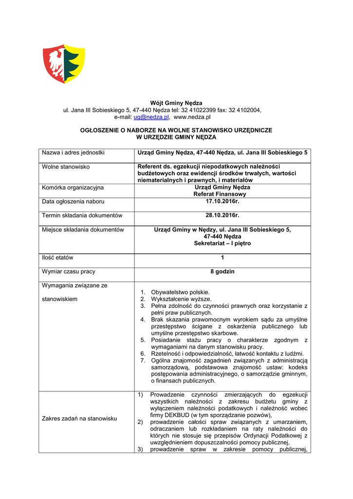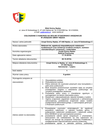 Wójt Gminy Nędza ul. Jana III Sobieskiego 5, 47-440 Nędza tel: 32 41022399 fax: 32 4102004, e-mail: [email protected], www.nedza.pl OGŁOSZENIE O NABORZE NA WOLNE STANOWISKO URZĘDNICZE W URZĘDZIE GMINY NĘDZA Nazwa i adres jednostki Urząd Gminy Nędza, 47-440 Nędza, ul. Jana III Sobieskiego 5 Wolne stanowisko Referent ds. egzekucji niepodatkowych należności budżetowych oraz ewidencji środków trwałych, wartości niematerialnych i prawnych, i materiałów Urząd Gminy Nędza Referat Finansowy 17.10.2016r. Komórka organizacyjna Data ogłoszenia naboru Termin składania dokumentów 28.10.2016r. Miejsce składania dokumentów Urząd Gminy w Nędzy, ul. Jana III Sobieskiego 5, 47-440 Nędza Sekretariat – I piętro 1 Ilość etatów 8 godzin Wymiar czasu pracy Wymagania związane ze stanowiskiem 1. Obywatelstwo polskie. 2. Wykształcenie wyższe. 3. Pełna zdolność do czynności prawnych oraz korzystanie z pełni praw publicznych. 4. Brak skazania prawomocnym wyrokiem sądu za umyślne przestępstwo ścigane z oskarżenia publicznego lub umyślne przestępstwo skarbowe. 5. Posiadanie stażu pracy o charakterze zgodnym z wymaganiami na danym stanowisku pracy. 6. Rzetelność i odpowiedzialność, łatwość kontaktu z ludźmi. 7. Ogólna znajomość zagadnień związanych z administracją samorządową, podstawowa znajomość ustaw: kodeks postępowania administracyjnego, o samorządzie gminnym, o finansach publicznych. 1) Zakres zadań na stanowisku 2) 3) Prowadzenie czynności zmierzających do egzekucji wszystkich należności z zakresu budżetu gminy z wyłączeniem należności podatkowych i należność wobec firmy DEKBUD (w tym sporządzanie pozwów), prowadzenie całości spraw związanych z umarzaniem, odraczaniem lub rozkładaniem na raty należności do których nie stosuje się przepisów Ordynacji Podatkowej z uwzględnieniem dopuszczalności pomocy publicznej, prowadzenie spraw w zakresie pomocy publicznej, sporządzanie sprawozdań, w tym: zbiorczych w zakresie pomocy publicznej i ich przekazywanie do odpowiednich podmiotów, 4) prowadzenie ewidencji środków trwałych ( i ich właściwe oznaczenie), wartości niematerialnych i prawnych stosownie do obowiązujących w tym zakresie przypisów i sporządzanie rocznych sprawozdań o stanie i ruchu środków trwałych, 5) prowadzenie ewidencji ilościowo-wartościowej pozostałych środków trwałych i ich właściwe oznaczenie, 6) prowadzenie ewidencji ilościowo-wartościowej materiałów. 7) rozliczanie inwentaryzacji w zakresie pkt 4, 5 i 6, 8) bieżące sporządzanie umów i protokołów przekazania pozostałych środków trwałych zakupionych na rzecz OSP lub innych podległych jednostek organizacyjnych, 9) zgłaszanie do Skarbnika propozycji zmian dokumentacji opisującej przyjęte zasady (politykę) rachunkowości, 10) prowadzenie całości zadań związanych z wpisami do Rejestru Dłużników w KRD zgodnie z ustawą o udostępnianiu informacji gospodarczych i wymianie danych gospodarczych, 11) prowadzenie centralnego rejestru umów, 12) prowadzenie całości spraw związanych z windykacją zaległych należności budżetowych, w tym wysyłka upomnień w zakresie należności budżetowych. Informacja o warunkach pracy Dodatkowe informacje Wymagane dokumenty 1. Praca przy komputerze 2. Praca na kondygnacji (II piętro) bez możliwości dojazdu windą. 3. Wynagrodzenie ustalane zgodnie z Rozporządzeniem Rady Ministrów z dnia 18 marca 2009 r. w sprawie wynagradzania pracowników samorządowych (t.j. Dz. U. z 2014r.poz.1786) oraz Regulaminu wynagradzania pracowników Urzędu Gminy Nędza. Wskaźnik zatrudnienia osób niepełnosprawnych w Urzędzie Gminy w Nędzy w rozumieniu przepisów o rehabilitacji zawodowej i społecznej oraz zatrudnianiu osób niepełnosprawnych w miesiącu wrześniu 2016 roku wynosił mniej niż 6% . 1. List motywacyjny, 2. życiorys –curriculum vitae – z informacjami o wykształceniu i opisem dotychczasowego przebiegu pracy zawodowej; 3. kserokopie świadectw pracy; 4. kserokopie dyplomów potwierdzających wykształcenie; 5. kserokopie zaświadczeń o ukończonych kursach, szkoleniach; 6. kwestionariusz osobowy dla osoby ubiegającej się o zatrudnienie; 7. Oświadczenie o posiadanym obywatelstwie; 8. Oświadczenie o pełnej zdolności do czynności prawnych, o korzystaniu z pełni praw publicznych i o niekaralności za przestępstwo popełnione umyślnie ścigane z oskarżenia publicznego lub umyślne przestępstwo skarbowe; 9. Oświadczenie o wyrażeniu zgody na przetwarzanie danych osobowych. Oświadczenia wg wzorów dostępnych na stronie internetowej Urzędu Gminy w Nędzy lub w siedzibie Urzędu Gminy w Nędzy – Regulamin naboru kandydatów na wolne stanowiska urzędnicze, w tym na kierownicze stanowiska urzędnicze w Urzędzie Gminy Nędza stanowiący załącznik do zarządzenia nr 0050.148.2016 Wójta Gminy Nędza z dnia 1 kwietnia 2016 roku. Kopie dokumentów, o których mowa w pkt 3-5 winny być uwierzytelnione własnym podpisem z klauzulą „za zgodność z oryginałem” oraz datą.