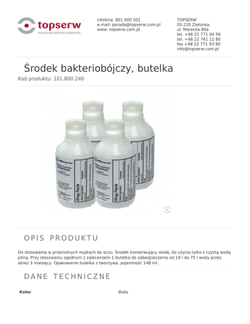 infolinia: 801 000 501 e-mail: [email protected] www: topserw.com.pl TOPSERW 05-220 Zielonka, ul. Marecka 66a tel. +48 22 771 04 56 tel. +48 22 761 11 80 fax +48 22 771 93 80 [email protected] Środek bakteriobójczy, butelka Kod produktu: 101.800.240 OPIS PRODUKTU Do stosowania w przenośnych myjkach do oczu. Środek konserwujący wodę, do użycia tylko z czystą wodą pitną. Przy stosowaniu zgodnym z zaleceniami 1 butelka do zabezpieczenia od 19 l do 75 l wody przez okrez 3 miesięcy. Opakowanie butelka z tworzywa, pojemność 148 ml. DANE TECHNICZNE Kolor Biały