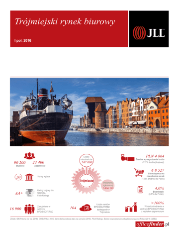 Trójmiejski rynek biurowy I poł. 2016 90 200 Studenci PLN 4 864 Liczba mieszkańców 23 400 Średnie wynagrodzenie brutto (117% średniej krajowej) 747 000 Absolwenci € 8 527 20 AA+ 16 900 Siła nabywcza na mieszkańca na rok (132% średniej dla Polski) Szkoły wyższe Trójmiasto 1 036 300 Rating krajowy dla Gdańska, Fitch Ratings Zatrudnienie w sektorze BPO/SSC/IT/R&D Mieszkańcy aglomeracji 4,0% Bezrobocie (8,8% dla Polski) 104 Liczba centrów BPO/SSC/IT/R&D działających w Trójmieście >100% Wzrost zatrudnienia w centrach BPO/SSC/IT/R&D z kapitałem zagranicznym Źródło: GfK Polonia (IV kw. 2015), GUS (IV kw. 2015, dane dla bezrobocia stan na czerwiec 2016), Fitch Ratings, Sektor nowoczesnych usług biznesowych w Polsce 2016 (ABSL) Rynek biurowy W ostatnich dwóch dekadach Trójmiasto stało się ważną oraz dynamicznie rozwijającą się lokalizacją biurową. Aglomeracja oferuje potencjalnym najemcom liczne opcje najmu, zarówno atrakcyjne kosztowo, jak i pod kątem wielkości. Od 2008 roku podaż biur w regionie zwiększyła się trzykrotnie (od 229 300 m2 na koniec 2008 r. do 629 300 m2 na koniec czerwca 2016 r.). Wyróżniającą cechą mieszkańców Trójmiasta na tle innych ośrodków biurowych w Polsce jest dobra znajomość niszowych języków obcych (w tym norweskiego, szwedzkiego, fińskiego i duńskiego). Ponadto, niedawne usprawnienia infrastrukturalne wpłyną znacząco na wizerunek regionu jako atrakcyjnej lokalizacji dla projektów z sektora nowoczesnych usług dla biznesu (obecnie Trójmiasto jest czwartym ośrodkiem SSC/BPO w Polsce, po Krakowie, Warszawie i Wrocławiu). W Trójmieście powstaje obecnie 132 100 m2, co wskazuje na wysoki poziom zaufania deweloperów co do przyszłości tego rynku biurowego. Jedynie w Warszawie, Krakowie i Wrocławiu wolumen nowobudowanych biurowców jest wyższy niż w Trójmieście. Na koniec 2018 r. całkowita podaż biur może wynieść nawet 800 000 m2. Historycznie rynek biurowy w Trójmieście był zdominowany przez lokalnych deweloperów. Niemniej jednak krajowi i międzynarodowi deweloperzy, tacy jak: Echo Investment, Hines czy Vastint, wraz z ukończeniem projektów biurowych w aglomeracji, zaznaczyli swoją obecność w regionie. Ostatnio również Skanska zakupiła kolejną działkę pod potencjalny projekt biurowy w Gdańsku. Nowa podaż, (m2), planowane (m2), poziom pustostanów (%) 100 000 16% 14% 12% 10% 8% 6% 4% 2% 0% 80 000 60 000 40 000 20 000 0 Nowa podaż (m²) Planowane (m²) Poziom pustostanów Źródło: JLL, PORF, II kw. 2016 r., *Współczynnik pustostanów na koniec II kw. 2016 W 2015 r. wolumen nowej podaży wyraźnie przyśpieszył – oddano do użytku prawie 87 000 m2 (w porównaniu ze średnią z ostatnich pięciu lat – 56 700 m2), z czego 62 500 m2 przypadło na Gdańsk, a 24 500 m2 na Gdynię. Przewidziana nowa podaż w całym 2016 r. JLL JLL Magdalena Reńska National Director Head of the Tri-City Office ul. Kaprów 19/28 80-316 Gdańsk tel. +48 58 350 62 62 [email protected] Mateusz Polkowski Associate Director Research & Consultancy Warsaw Spire Plac Europejski 1 00-844 Warszawa tel. +48 22 167 00 00 [email protected] www.jll.pl www.jll.pl to 64 700 m2, z czego 80% zostało ukończone w I poł. 2016 r. Na lata 2017-2018 deweloperzy planują kolejne budynki biurowe. 120 100 m2 z przewidzianych na te lata projektów jest już w budowie. Popyt w Trójmieście nadal utrzymuje się na wysokim poziomie. Po bardzo dobrym wyniku w roku 2014, kiedy to najemcy podpisali umowy na 66 500 m2, 2015 przyniósł rekordowy wolumen popytu klienci korporacyjni wynajęli ponad 107 000 m2. W I poł. 2016 r. zakontraktowanych zostało 37 000 m2, w tym kilkanaście umów o powierzchni większej niż 1 000 m2. Głównym generatorem popytu są firmy rozpoczynające swoją działalność w regionie oraz te rozwijające swoje struktury. Wśród najemców, którzy ostatnio otworzyli swoje biura w aglomeracji można wymienić State Street czy ThyssenKrupp, obie te spółki wynajęły łącznie 20 000 m2 co miało pozytywny wpływ na poziom absorpcji netto w 2015 r. Największą umową podpisaną w I poł. 2016 r. był przednajem 3 300 m2 przez Luxoft w Alchemii III. Popyt w Trójmieście, (m2) 120 000 100 000 80 000 60 000 40 000 20 000 0 2010 2011 2012 Popyt netto 2013 2014 2015 H1 2016 Renegocjacje Źródło: JLL, PORF, II kw. 2016 r. Wraz z dynamicznym rozwojem sektora SSC/BPO w Trójmieście, powinien utrzymywać się pozytywny trend po stronie popytowej (w I poł. 2016 r. 56% popytu było wygenerowane przez firmy z tego sektora). Trójmiejski rynek biurowy oferuje szeroki wachlarz małych i średnich powierzchni do wynajęcia od zaraz, z kolei dostępność modułów powyżej 5 000 m2 jest ograniczona. Najemcy poszukujący takiej powierzchni zmuszeni są do rozważenia projektów w budowie lub planowanych. Łącznie aglomeracja oferuje 84 900 m2 wolnej powierzchni rozproszonej w 52 biurowcach, co przekłada się na wskaźnik pustostanów na poziomie 13,5%. Od I kw. 2015 r. czynsze za najlepsze powierzchnie biurowe w Trójmieście utrzymują się na niezmiennym niskim poziomie (12,75 13,5 € / m2 / miesiąc). Spodziewamy się utrzymania korzystnych dla najemców warunków rynkowych do końca 2016 r. oraz w całym 2017, ze względu na rosnącą ofertę w budowanych oraz planowanych projektach biurowych. COPYRIGHT © JONES LANG LASALLE IP, INC. 2016. All rights reserved. No part of this publication may be reproduced or transmitted in any form or by any means without prior written consent of Jones Lang LaSalle. It is based on material that we believe to be reliable. Whilst every effort has been made to ensure its accuracy, we cannot offer any warranty that it contains no factual errors. We would like to be told of any such errors in order to correct them.