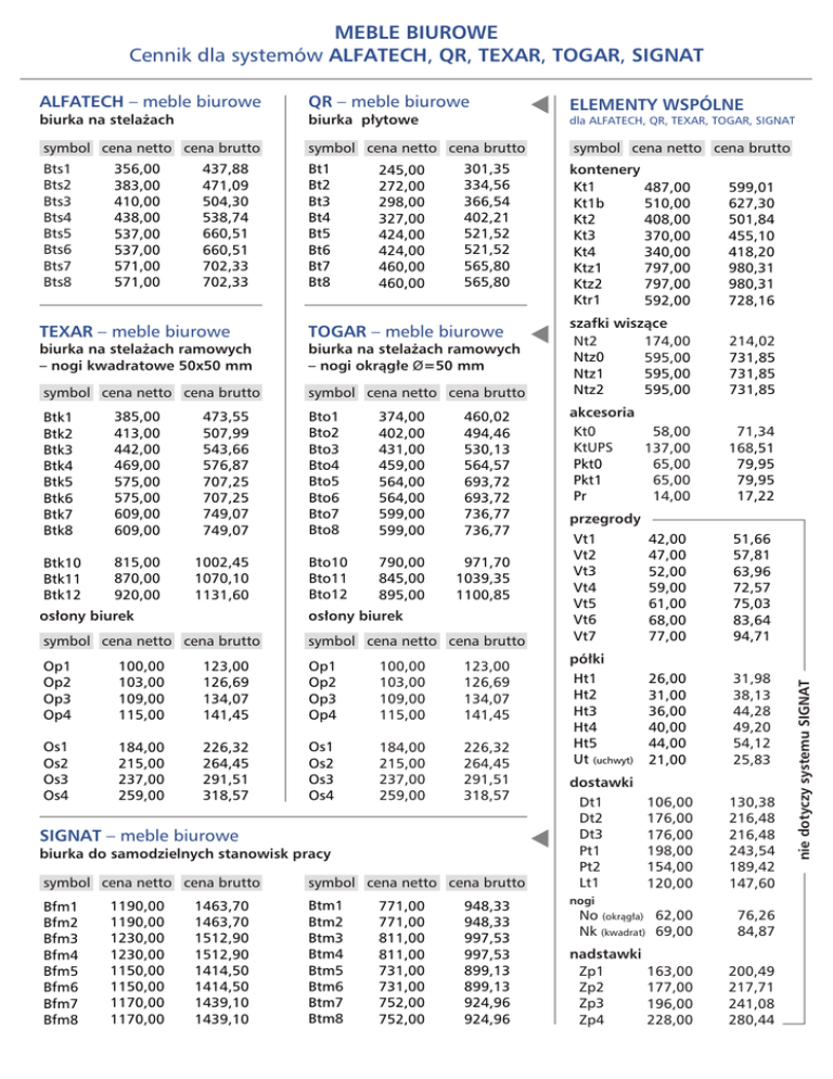 MEBLE BIUROWE Cennik dla systemów ALFATECH, QR, TEXAR, TOGAR, SIGNAT ALFATECH – meble biurowe QR – meble biurowe ELEMENTY WSPÓLNE biurka na stelażach biurka płytowe dla ALFATECH, QR, TEXAR, TOGAR, SIGNAT symbol cena netto cena brutto symbol cena netto cena brutto Bts1 Bts2 Bts3 Bts4 Bts5 Bts6 Bts7 Bts8 Bt1 Bt2 Bt3 Bt4 Bt5 Bt6 Bt7 Bt8 437,88 471,09 504,30 538,74 660,51 660,51 702,33 702,33 245,00 272,00 298,00 327,00 424,00 424,00 460,00 460,00 301,35 334,56 366,54 402,21 521,52 521,52 565,80 565,80 TEXAR – meble biurowe TOGAR – meble biurowe biurka na stelażach ramowych – nogi kwadratowe 50x50 mm biurka na stelażach ramowych – nogi okrągłe Ø=50 mm symbol cena netto cena brutto symbol cena netto cena brutto Btk1 Btk2 Btk3 Btk4 Btk5 Btk6 Btk7 Btk8 385,00 413,00 442,00 469,00 575,00 575,00 609,00 609,00 473,55 507,99 543,66 576,87 707,25 707,25 749,07 749,07 Btk10 Btk11 Btk12 815,00 870,00 920,00 1002,45 1070,10 1131,60 Bto1 Bto2 Bto3 Bto4 Bto5 Bto6 Bto7 Bto8 374,00 402,00 431,00 459,00 564,00 564,00 599,00 599,00 460,02 494,46 530,13 564,57 693,72 693,72 736,77 736,77 Bto10 Bto11 Bto12 790,00 845,00 895,00 971,70 1039,35 1100,85 osłony biurek osłony biurek symbol cena netto cena brutto symbol cena netto cena brutto Op1 Op2 Op3 Op4 100,00 103,00 109,00 115,00 123,00 126,69 134,07 141,45 Op1 Op2 Op3 Op4 100,00 103,00 109,00 115,00 123,00 126,69 134,07 141,45 Os1 Os2 Os3 Os4 184,00 215,00 237,00 259,00 226,32 264,45 291,51 318,57 Os1 Os2 Os3 Os4 184,00 215,00 237,00 259,00 226,32 264,45 291,51 318,57 SIGNAT – meble biurowe biurka do samodzielnych stanowisk pracy symbol cena netto cena brutto Bfm1 Bfm2 Bfm3 Bfm4 Bfm5 Bfm6 Bfm7 Bfm8 1190,00 1190,00 1230,00 1230,00 1150,00 1150,00 1170,00 1170,00 1463,70 1463,70 1512,90 1512,90 1414,50 1414,50 1439,10 1439,10 symbol cena netto cena brutto Btm1 Btm2 Btm3 Btm4 Btm5 Btm6 Btm7 Btm8 771,00 771,00 811,00 811,00 731,00 731,00 752,00 752,00 948,33 948,33 997,53 997,53 899,13 899,13 924,96 924,96 kontenery Kt1 487,00 Kt1b 510,00 Kt2 408,00 Kt3 370,00 Kt4 340,00 Ktz1 797,00 Ktz2 797,00 Ktr1 592,00 599,01 627,30 501,84 455,10 418,20 980,31 980,31 728,16 szafki wiszące Nt2 174,00 Ntz0 595,00 Ntz1 595,00 Ntz2 595,00 214,02 731,85 731,85 731,85 akcesoria Kt0 58,00 KtUPS 137,00 Pkt0 65,00 Pkt1 65,00 Pr 14,00 71,34 168,51 79,95 79,95 17,22 przegrody Vt1 Vt2 Vt3 Vt4 Vt5 Vt6 Vt7 42,00 47,00 52,00 59,00 61,00 68,00 77,00 51,66 57,81 63,96 72,57 75,03 83,64 94,71 26,00 31,00 36,00 40,00 44,00 21,00 31,98 38,13 44,28 49,20 54,12 25,83 106,00 176,00 176,00 198,00 154,00 120,00 130,38 216,48 216,48 243,54 189,42 147,60 No (okrągła) 62,00 Nk (kwadrat) 69,00 76,26 84,87 półki Ht1 Ht2 Ht3 Ht4 Ht5 Ut (uchwyt) dostawki Dt1 Dt2 Dt3 Pt1 Pt2 Lt1 nogi nadstawki Zp1 Zp2 Zp3 Zp4 163,00 177,00 196,00 228,00 200,49 217,71 241,08 280,44 nie dotyczy systemu SIGNAT 356,00 383,00 410,00 438,00 537,00 537,00 571,00 571,00 symbol cena netto cena brutto MEBLE BIUROWE Cennik dla systemu WHITE GRAPH biurka kontenery dostawki symbol cena netto cena brutto symbol cena netto cena brutto symbol cena netto cena brutto Wgb2-7 528,00 Wgb2-8 590,00 Wgb3-7 566,00 Wgb3-8 631,00 Wgb4-7 600,00 Wgb4-8 671,00 Wgb12 1038,00 Wgb13 1115,00 Wgb14 1174,00 649,44 725,70 696,18 776,13 738,00 825,33 1276,74 1371,45 1444,02 Wgk1 Wgk2 Wgk3 Wgk4 1050,00 962,00 934,00 745,00 1291,50 1183,26 1148,82 916,35 kółka K1 K2 150,00 250,00 184,50 307,50 Wgd1 Wgd2 Wgd3 Wgd4 1869,00 1845,00 1990,00 1966,00 2298,87 2269,35 2447,70 2418,18 biurka nakładane pomocniki przegrody tapicerowane symbol cena netto cena brutto symbol cena netto cena brutto symbol cena netto cena brutto Wgbn2-7 535,00 Wgbn2-8 597,00 Wgbn3-7 572,00 Wgbn3-8 638,00 Wgbn4-7 606,00 Wgbn4-8 678,00 Wgbn12 1056,00 Wgbn13 1123,00 Wgbn14 1186,00 658,05 734,31 703,56 784,74 745,38 833,94 1298,88 1381,29 1458,78 Wgp1 Wgp2 Wgp3 Wgp4 1478,00 1478,00 1805,00 1805,00 1817,94 1817,94 2220,15 2220,15 szuflada Wgsp1 260,00 319,80 Wga1 Wga2 Wga3 Wga4 Wga5 399,00 410,00 470,00 480,00 520,00 490,77 504,30 578,10 590,40 639,60 stoły maskownice biurek przegrody tapicerowane z podcięciami do podwójnych stanowisk symbol cena netto cena brutto symbol cena netto cena brutto symbol cena netto cena brutto Wgs1 Wgs2 Wgs3 585,00 702,00 1102,00 719,55 863,46 1355,46 Wgl1 Wgl2 Wgl3 262,00 299,00 336,00 322,26 367,77 413,28 Wga12 Wga13 Wga14 515,00 538,00 571,00 633,45 661,74 702,33 regały wysokie regały niskie nadstawki symbol cena netto cena brutto symbol cena netto cena brutto symbol cena netto cena brutto Wgr1 Wgr2 Wgr3 Wgr4 Wgr6 Wgr7 Wgr8 Wgr9 659,00 787,00 894,00 937,00 572,00 682,00 774,00 946,00 810,57 968,01 1099,62 1152,51 703,56 838,86 952,02 1163,58 Wgr11 Wgr12 Wgr13 Wgr14 Wgr16 Wgr17 Wgr18 Wgr19 527,00 629,00 715,00 830,00 483,00 656,00 440,00 596,00 648,21 773,67 879,45 1020,90 594,09 806,88 541,20 733,08 Wgn1 Wgn2 Wgz0 502,00 645,00 720,00 617,46 793,35 885,60 regały przesuwne i żaluzjowe zamki symbol cena netto cena brutto symbol cena netto cena brutto Wgsa1 1386,00 Wgsa2 1386,00 1704,78 1704,78 Wgsaz1 1874,00 Wgsaz3 1874,00 2305,02 2305,02 Wgsaz2 1874,00 Wgsaz4 1874,00 2305,02 2305,02 ZB ZP ZZ PK 135,00 55,00 75,00 55,00 166,05 67,65 92,25 67,65 REGAŁY BIUROWE – cennik REGAŁY dla systemów ALFATECH, QR, SIGNAT, TOGAR, TEXAR, CITAB, BTX, OPENTECH regały wysokie regały średnie regały niskie symbol cena netto cena brutto symbol cena netto cena brutto symbol cena netto cena brutto Rt1 Rt2 Rt2s Rt2d Rt3 Rt4 Rt5 Rt5s Rt5d Rt5k Rt5p Z1 Rt6 Rt6s Rt7 Rt8 Rt8p Rt10 Rt11 Z2 Rt9 Rt12 Rt13 Rt14 Z3 347,00 442,00 648,00 592,00 521,00 558,00 361,00 464,00 455,00 423,00 282,00 382,00 426,81 543,66 797,04 728,16 640,83 686,34 444,03 570,72 559,65 520,29 346,86 469,86 nadstawki do regałów symbol cena netto cena brutto Nt1 Nt1p Nt1s Nt2p Nt3 Nt3d Nt3p Nt3z Z4 Z5 299,00 179,00 320,00 225,00 144,00 253,00 174,00 207,00 245,00 252,00 367,77 220,17 393,60 276,75 177,12 311,19 214,02 254,61 301,35 309,96 242,00 448,00 337,00 392,00 392,00 221,00 3