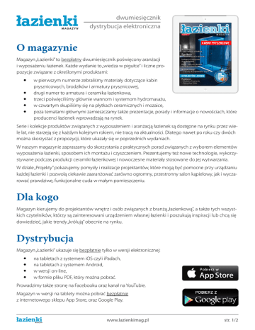 dwumiesięcznik dystrybucja elektroniczna O magazynie Magazyn „Łazienki” to bezpłatny dwumiesięcznik poświęcony aranżacji i wyposażeniu łazienek. Każde wydanie to „wiedza w pigułce” i liczne propozycje związane z określonymi produktami: yy yy yy yy yy w pierwszym numerze zebraliśmy materiały dotyczące kabin prysznicowych, brodzików i armatury prysznicowej, drugi numer to armatura i ceramika łazienkowa, trzeci poświęciliśmy głównie wannom i systemom hydromasażu, w czwartym skupiliśmy się na płytkach ceramicznych i mozaice, poza tematami głównymi zamieszczamy także prezentacje, porady i informacje o nowościach, które producenci łazienek wprowadzają na rynek. Serie i kolekcje produktów związanych z wyposażeniem i aranżacją łazienek są dostępne na rynku przez wiele lat, nie starzeją się z każdym kolejnym rokiem, nie tracą na aktualności. Dlatego nawet po roku czy dwóch można skorzystać z propozycji, które ukazały się w poprzednich wydaniach. W naszym magazynie zapraszamy do skorzystania z praktycznych porad związanych z wyborem elementów wyposażenia łazienki, sposobem ich montażu i czyszczeniem. Prezentujemy też nowe technologie, wykorzystywane podczas produkcji ceramiki łazienkowej i nowoczesne materiały stosowane do jej wytwarzania. W dziale „Projekty” pokazujemy pomysły i realizacje projektantów, które mogą być pomocne przy urządzaniu każdej łazienki i pozwolą ciekawie zaaranżować zarówno ogromny, przestronny salon kąpielowy, jak i wyczarować prawdziwe, funkcjonalne cuda w małym pomieszczeniu. Dla kogo Magazyn kierujemy do projektantów wnętrz i osób związanych z branżą „łazienkową”, a także tych wszystkich czytelników, którzy są zainteresowani urządzeniem własnej łazienki i poszukują inspiracji lub chcą się dowiedzieć, jakie trendy „królują” obecnie na rynku. Dystrybucja Magazyn „Łazienki” ukazuje się bezpłatnie tylko w wersji elektronicznej: yy yy yy yy na tabletach z systemem iOS czyli iPadach, na tabletach z systemem Android, w wersji on-line, w formie pliku PDF, który można pobrać. Prowadzimy także stronę na Facebooku oraz kanał na YouTubie. Magazyn w wersji na tablety można pobrać bezpłatnie z internetowego sklepu App Store, oraz Google Play. www.lazienkimag.pl str. 1/2 dwumiesięcznik dystrybucja elektroniczna Informacje dla klientów Publikacja treści, które otrzymujemy od czołowych światowych i polskich producentów lub ich agencji prasowych, jest bezpłatna. Staramy się prezentować wszystkie nowości lub wybierać najciekawsze, naszym zdaniem, produkty. Dzięki cyfrowej publikacji możemy skorzystać z udogodnień, na które prasa drukowana nie może sobie pozwolić. Są to m.in.: yy yy yy yy yy yy yy galerie zdjęć, materiały wideo, panoramy, linki do stron internetowych i materiałów wideo np. na YouTube, linki do innych aplikacji w AppStore i Google Play, zakładka - czyli zaznaczanie ulubionych stron w różnych magazynach, szybkie przesyłanie informacji o ciekawych artykułach do Facebooka, Twittera lub poczty email. Mimo że prasa elektroniczna nie wymusza ograniczeń ilości stron, to jednak, tak jak objętość czasopisma drukowanego mierzy się wagą w kilogramach, tak tutaj przekłada się ona na megabajty, które czytelnik musi pobrać na swój tablet. Z tego względu staramy się nie przesadzać z jego objętością, choć prezentowane materiały niektórych wydań zajmowałyby ok. 200 stron w druku. Opcje reklamowe Wszystkie reklamy w naszym magazynie są całostronicowe. Tylko na specjalne życzenie klienta możemy zaoferować mniejszą powierzchnię tworząc ofertę indywidualną. Reklama całostronicowa Artykuł sponsorowany Wideo w reklamie (max. 1 min) Audio w reklamie (max. 10 min) – 3400 zł – 3400 zł – 790 zł – 370 zł Dodatkowe funkcjonalności: Link do strony WWW Link do YouTube Inne linki np. do sklepu internetowego –gratis –gratis –gratis Elementy interaktywne typu: Galeria zdjęć, mapa dystrybutorów, elementy pop-up oraz dodatkowa strona do reklamy, są wyceniane indywidualnie Zapraszamy do współpracy Robert Lipski – redaktor naczelny, wydawca [email protected] tel. 500 122 332 Agata Rudnik – redaktor prowadzący, specjalista ds. PR [email protected] tel. 603 130 052 Oferta zawiera ceny netto. www.lazienkimag.pl str. 2/2