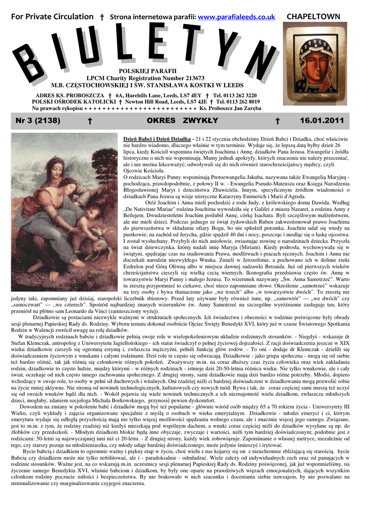 For Private Circulation † Strona internetowa parafii: www.parafialeeds.co.uk CHAPELTOWN POLSKIEJ PARAFII LPCM Charity Registration Number 213673 M.B. CZĘSTOCHOWSKIEJ I ŚW. STANISŁAWA KOSTKI W LEEDS ADRES KS. PROBOSZCZA † 6A, Harehills Lane, Leeds, LS7 4EY † Tel. 0113 262 3220 POLSKI OŚRODEK KATOLICKI † Newton Hill Road, Leeds, LS7 4JE † Tel. 0113 262 8019 Na prawach rękopisu + + + + + + + + + + + + + + + + + + + + + + + + + Ks. Proboszcz Jan Zaręba Nr 3 (2138) † OKRES ZWYKŁY † 16.01.2011 Dzień Babci i Dzień Dziadka - 21 i 22 stycznia obchodzimy Dzień Babci i Dziadka, choć właściwie nie bardzo wiadomo, dlaczego właśnie w tym terminie. Wydaje się, że lepszą datą byłby dzień 26 lipca, kiedy Kościół wspomina świętych Joachima i Annę, dziadków Pana Jezusa. Ewangelie i źródła historyczne o nich nie wspominają. Mamy jednak apokryfy, których znaczenia nie należy przeceniać, ale i nie można lekceważyć; odwoływali się do nich również starochrześcijańscy mędrcy, czyli Ojcowie Kościoła. O rodzicach Maryi Panny wspominają Protoewangelia Jakuba, nazywana także Ewangelią Maryjną pochodząca, prawdopodobnie, z połowy II w. - Ewangelia Pseudo-Mateusza oraz Księga Narodzenia Błogosławionej Maryi i dzieciństwa Zbawiciela. Innym, specyficznym źródłem wiadomości o dziadkach Pana Jezusa są wizje mistyczne Katarzyny Emmerich i Marii d'Agreda. Otóż Joachim i Anna mieli pochodzić z rodu Judy, z królewskiego domu Dawida. Według „De Nativitate Mariae" rodzina Joachima wywodziła się z Galilei z miasta Nazaret, a rodzina Anny z Betlejem. Dwudziestoletni Joachim poślubił Annę, córkę Isachara. Byli szczęśliwym małżeństwem, ale nie mieli dzieci. Podczas jednego ze świąt żydowskich Ruben zakwestionował prawo Joachima do pierwszeństwa w składaniu ofiary Bogu, bo nie spłodził potomka. Joachim udał się wtedy na pustkowie; na zachód od Jerycha, gdzie spędził 40 dni i nocy, poszcząc i modląc się o łaskę ojcostwa. I został wysłuchany. Przybyli do nich aniołowie, zwiastując nowinę o narodzinach dziecka. Przyszła na świat dziewczynka, której nadali imię Maryja (Miriam). Kiedy podrosła, wychowywała się w świątyni, spędzając czas na studiowaniu Prawa, modlitwach i pracach ręcznych. Joachim i Anna nie doczekali narodzin niezwykłego Wnuka. Zmarli w Jerozolimie, a pochowano ich w dolinie rzeki Ezdrelon pod Górą Oliwną albo w miejscu dawnej sadzawki Betsaida. Już od pierwszych wieków chrześcijaństwa cieszyli się wielką czcią wiernych. Ikonografia przedstawia często św. Annę w towarzystwie Maryi Panny i małego Jezusa. To wizerunek nazywany „Św. Anna Samotrzeć”. Warto tu zresztą przypomnieć to ciekawe, choć nieco zapomniane słowo. Określenie „samotrzeć” wskazuje na trzy osoby i bywa tłumaczone jako „we trzech” albo „w towarzystwie dwóch”. To zresztą nie jedyny taki, zapomniany już dzisiaj, staropolski liczebnik zbiorowy. Przed laty używane były również inne, np. „samowtór” — „we dwóch” czy „samoczwart” — „we czterech”. Spośród najbardziej znanych wizerunków św. Anny Samotrzeć na szczególne wyróżnienie zasługuje ten, który przeniósł na płótno sam Leonardo da Vinci (zamieszczony wyżej). Dziadkowie są postaciami niezwykle ważnymi w strukturach społecznych. Ich świadectwu i obecności w rodzinie poświęcone były obrady sesji plenarnej Papieskiej Rady ds. Rodziny. Wyboru tematu dokonał osobiście Ojciec Święty Benedykt XVI, który już w czasie Światowego Spotkania Rodzin w Walencji zwrócił uwagę na rolę dziadków. W tradycyjnych rodzinach babcie i dziadkowie pełnią swoje role w wielopokoleniowym układzie rodzinnych stosunków. - Niegdyś - wskazuje dr Stefan Klemczak, antropolog z Uniwersytetu Jagiellońskiego - ich statut świadczył o pełnej życiowej dojrzałości. Z racji doświadczenia jeszcze w XIX wieku dziadkowie cieszyli się ogromną estymą i, zwłaszcza mężczyźni, pełnili funkcję głów rodów. - To oni - dodaje dr Klemczak - dzielili się doświadczeniem życiowym z wnukami i całymi rodzinami. Dziś role te często się odwracają. Dziadkowie - jako grupa społeczna - mogą się od siebie też bardzo różnić, tak jak różnią się członkowie różnych pokoleń. Zważywszy m.in. na coraz dłuższy czas życia człowieka oraz wiek zakładania rodzin, dziadkowie to często ludzie, między którymi - w różnych rodzinach - istnieje dziś 20-50-letnia różnica wieku. Nie tylko wnukowie, ale i cały świat, oczekuje od nich często innego zachowania społecznego. Z drugiej strony, sami dziadkowie mają dziś bardzo różne potrzeby. Młodsi, dopiero wchodzący w swoje role, to osoby w pełni sił duchowych i witalnych. Oni rzadziej niźli ci bardziej doświadczeni w dziadkowaniu mogą pozwolić sobie na życie mniej aktywne. Nie stronią od nowinek technologicznych, kulturowych czy nowych mód. Bywa i tak, że coraz częściej sami muszą też uczyć się od swoich wnuków bądź dla nich. - Wokół pojawia się wiele nowinek technicznych a ich nieznajomość wielu dziadkom, zwłaszcza młodszych dzieci, mogłaby, zdaniem socjologa Michała Borkowskiego, przynosić pewien dyskomfort. Dowodem na zmiany w pokoleniu babć i dziadków mogą być też popularne - głównie wśród osób między 65 a 70 rokiem życia - Uniwersytety III Wieku, czyli wykłady i zajęcia organizowane specjalnie z myślą o osobach w wieku emerytalnym. Dziadkowie - młodzi emeryci i ci, którym emerytura wydaje się odległą przyszłością mają nie tylko więcej możliwości spędzania wolnego czasu, ale i znacznie więcej jego samego. Związane, jest to m.in. z tym, że rodziny rzadziej niż kiedyś mieszkają pod wspólnym dachem, a wnuki coraz częściej niźli do dziadków wysyłane są np. do żłobków czy przedszkoli. - Młodym dziadkom bliskie będą inne obyczaje, zwyczaje i wartości, niźli tym bardziej do