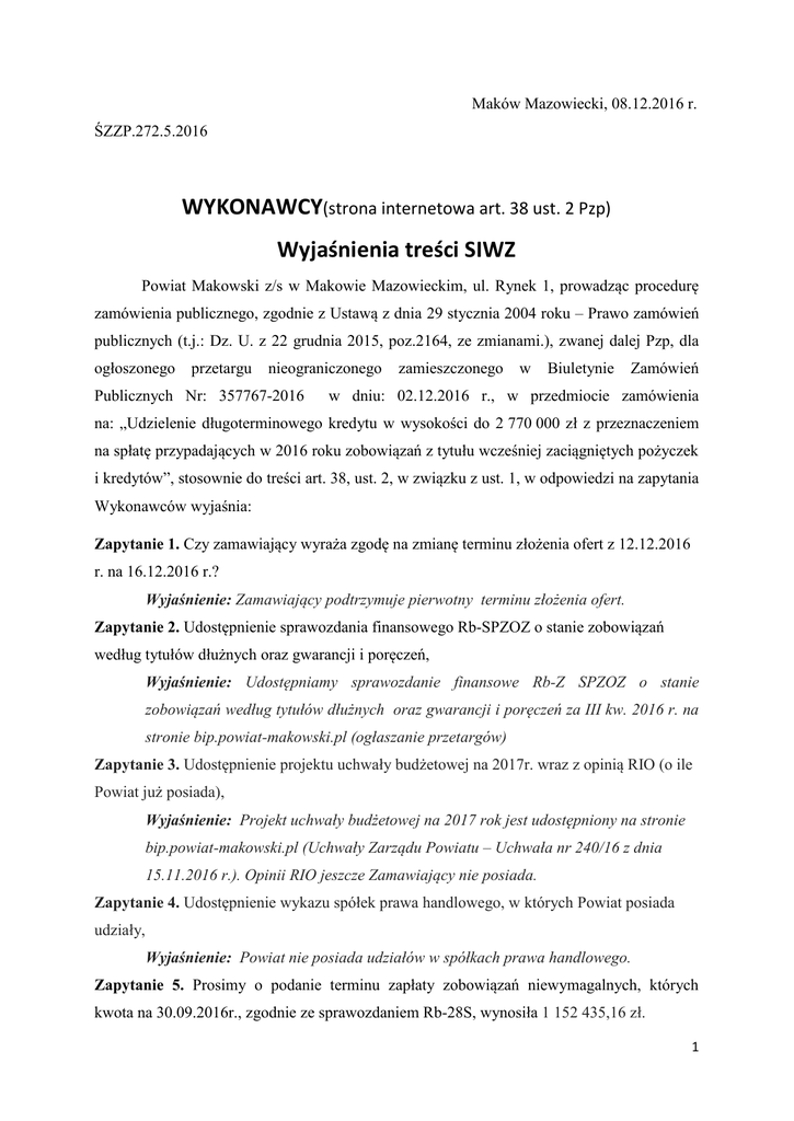 Maków Mazowiecki, 08.12.2016 r. ŚZZP.272.5.2016 WYKONAWCY(strona internetowa art. 38 ust. 2 Pzp) Wyjaśnienia treści SIWZ Powiat Makowski z/s w Makowie Mazowieckim, ul. Rynek 1, prowadząc procedurę zamówienia publicznego, zgodnie z Ustawą z dnia 29 stycznia 2004 roku – Prawo zamówień publicznych (t.j.: Dz. U. z 22 grudnia 2015, poz.2164, ze zmianami.), zwanej dalej Pzp, dla ogłoszonego przetargu nieograniczonego Publicznych Nr: 357767-2016 zamieszczonego w Biuletynie Zamówień w dniu: 02.12.2016 r., w przedmiocie zamówienia na: „Udzielenie długoterminowego kredytu w wysokości do 2 770 000 zł z przeznaczeniem na spłatę przypadających w 2016 roku zobowiązań z tytułu wcześniej zaciągniętych pożyczek i kredytów”, stosownie do treści art. 38, ust. 2, w związku z ust. 1, w odpowiedzi na zapytania Wykonawców wyjaśnia: Zapytanie 1. Czy zamawiający wyraża zgodę na zmianę terminu złożenia ofert z 12.12.2016 r. na 16.12.2016 r.? Wyjaśnienie: Zamawiający podtrzymuje pierwotny terminu złożenia ofert. Zapytanie 2. Udostępnienie sprawozdania finansowego Rb-SPZOZ o stanie zobowiązań według tytułów dłużnych oraz gwarancji i poręczeń, Wyjaśnienie: Udostępniamy sprawozdanie finansowe Rb-Z SPZOZ o stanie zobowiązań według tytułów dłużnych oraz gwarancji i poręczeń za III kw. 2016 r. na stronie bip.powiat-makowski.pl (ogłaszanie przetargów) Zapytanie 3. Udostępnienie projektu uchwały budżetowej na 2017r. wraz z opinią RIO (o ile Powiat już posiada), Wyjaśnienie: Projekt uchwały budżetowej na 2017 rok jest udostępniony na stronie bip.powiat-makowski.pl (Uchwały Zarządu Powiatu – Uchwała nr 240/16 z dnia 15.11.2016 r.). Opinii RIO jeszcze Zamawiający nie posiada. Zapytanie 4. Udostępnienie wykazu spółek prawa handlowego, w których Powiat posiada udziały, Wyjaśnienie: Powiat nie posiada udziałów w spółkach prawa handlowego. Zapytanie 5. Prosimy o podanie terminu zapłaty zobowiązań niewymagalnych, których kwota na 30.09.2016r., zgodnie ze sprawozdaniem Rb-28S, wynosiła 1 152 435,16 zł. 1 Wyjaśnienie: Zobowiązania niewymagalne , których kwota na 30.09.2016 r. zgodnie ze sprawozdaniem RB-28S wynosi 1 152 435,16 zł są związane z ciągłością działania powiatu i dotyczą składek społecznych odprowadzonych do ZUS do dnia 5.10.2016r., podatku dochodowego od osób fizycznych odprowadzonego do urzędu skarbowego do dnia 20.10.2016 r. oraz zakupu towarów i usług, których termin płatności przypada w miesiącu październiku 2016 r. Wszystkie zobowiązania wykazane w sprawozdaniu zostały uregulowane zgodnie z terminem płatności do końca października 2016 r. Zapytanie 6. Czy zamawiający ma zawarte umowy wsparcia finansowego na rzecz jednostek podległych/spółek komunalnych? Jeżeli tak to prosimy o wyszczególnienie? Wyjaśnienie: Zamawiający nie zawierał umów wsparcia finansowego na rzecz jednostek podległych/ spółek komunalnych. Zapytanie 7. Czy Zamawiający dopuszcza, aby do naliczania oprocentowania w każdym roku przyjąć 365 dni? Wyjaśnienie: Zamawiający nie dopuszcza aby do naliczenia oprocentowania w każdym roku przyjmować 365 dni. (Naliczenie oprocentowania prosimy liczyć tak jak w SIWZ). Zapytanie 8. Czy Zamawiający dopuszcza, aby odsetki naliczane były od następnego dnia po wypłacie kredytu/transzy do dnia spłaty włącznie Wyjaśnienie: Zamawiający w SIWZ w temacie „ Oprocentowanie kredytu” określił sposób naliczania odsetek. Zapytanie 9. Czy Zamawiający dopuszcza w przypadku gdy termin spłaty odsetek/kapitału przypada na dzień wolny aby spłata następowała w następnym dniu roboczym po dniu wolnym Wyjaśnienie: Zamawiający dopuszcza w przypadku gdy termin spłaty odsetek/kapitału przypada na dzień wolny aby spłata następowała w następnym dniu roboczym po dniu wolnym. Zapytanie 10. Czy zamawiający dopuszcza aby wysokość stawki referencyjnej ustalana była według notowania określonego w Tabeli kursów obowiązującej w dniu poprzedzającym rozpoczęcie każdego okresu obrachunkowego, Wyjaśnienie: Zamawiający w SIWZ w temacie „Oprocentowanie kredytu” określił stopę bazową. 2 Zapytanie 11. Czy zamawiający dopuszcza aby w przypadku opóźnienia w spłacie odsetki karne były liczone wg stopy procentowej przewidzianej dla kredytów przeterminowanych…….……. określonej w uchwale Zarządu Banku…..? Wyjaśnienie: Zamawiający dopuszcza, aby w przypadku opóźnienia w spłacie odsetki karne były liczone wg stopy procentowej przewidzianej dla kredytów przeterminowanych …….. % określonej w uchwale Zarządu Banku…….. . Zapytanie 12. Czy Powiat przewiduje (w okresie obowiązywania umowy kredytu, będącego przedmiotem zamówienia) dokapitalizowanie Spółek, w których Powiat ma udziały? Jeśli tak, to proszę o informację o wysokości planowanego dokapitalizowania oraz roku, w którym planowane jest dokapitalizowanie. Wyjaśnienie: Powiat nie przewiduje (w okresie obowiązywania umowy kredytu, będącego przedmiotem zamówienia) dokapitalizowania Spółek, ponieważ Powiat nie ma udziałów w żadnych spółkach. Zapytanie 13. Czy Zamawiający wyraża zgodę, aby w umowie kredytu zawarta została klauzula „Stopa procentowa równa jest wysokości stawki referencyjnej powiększonej o marżę banku, z zastrzeżeniem, że stopa procentowa nie może być niższa niż marża banku, jak również nie może być niższa niż zero”? Wyjaśnienie: Zamawiający wyraża zgodę, aby w umowie kredytu zawarta została klauzula „Stopa procentowa równa jest wysokości stopy bazowej powiększonej o marżę banku, z zastrzeżeniem, że stopa procentowa nie może być niższa niż marża banku, jak również nie może być niższa niż zero.” Zapytanie 14. Czy zamawiający dopuszcza zastosowanie w umowie kredytu klauzul: 1) Z zastrzeżeniem bezwzględnie obowiązujących przepisów prawa, Kredytobiorca zapewni, aby wszelkie wierzytelności