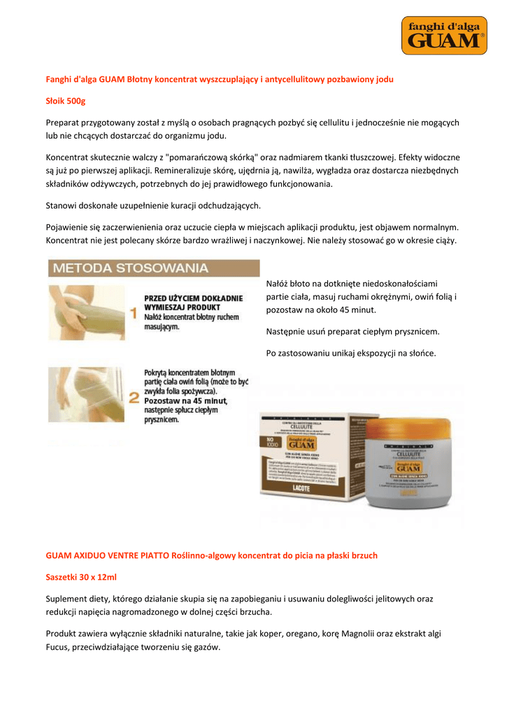 Fanghi d'alga GUAM Błotny koncentrat wyszczuplający i antycellulitowy pozbawiony jodu Słoik 500g Preparat przygotowany został z myślą o osobach pragnących pozbyć się cellulitu i jednocześnie nie mogących lub nie chcących dostarczać do organizmu jodu. Koncentrat skutecznie walczy z "pomarańczową skórką" oraz nadmiarem tkanki tłuszczowej. Efekty widoczne są już po pierwszej aplikacji. Remineralizuje skórę, ujędrnia ją, nawilża, wygładza oraz dostarcza niezbędnych składników odżywczych, potrzebnych do jej prawidłowego funkcjonowania. Stanowi doskonałe uzupełnienie kuracji odchudzających. Pojawienie się zaczerwienienia oraz uczucie ciepła w miejscach aplikacji produktu, jest objawem normalnym. Koncentrat nie jest polecany skórze bardzo wrażliwej i naczynkowej. Nie należy stosować go w okresie ciąży. Nałóż błoto na dotknięte niedoskonałościami partie ciała, masuj ruchami okrężnymi, owiń folią i pozostaw na około 45 minut. Następnie usuń preparat ciepłym prysznicem. Po zastosowaniu unikaj ekspozycji na słońce. GUAM AXIDUO VENTRE PIATTO Roślinno-algowy koncentrat do picia na płaski brzuch Saszetki 30 x 12ml Suplement diety, którego działanie skupia się na zapobieganiu i usuwaniu dolegliwości jelitowych oraz redukcji napięcia nagromadzonego w dolnej części brzucha. Produkt zawiera wyłącznie składniki naturalne, takie jak koper, oregano, korę Magnolii oraz ekstrakt algi Fucus, przeciwdziałające tworzeniu się gazów. 1 saszetkę preparatu rozpuść w szklance wody. Tak przygotowany specyfik wypijaj każdego ranka. Nie przekraczaj zalecanej dawki. Suplementy diety nie stanowią substytutu zróżnicowanej diety i zdrowego trybu życia. W przypadku chorób i terapii lekowych, przed użyciem produktu skonsultuj się z lekarzem. GUAM AXI-SNELL Koncentrat do picia wspomagający odchudzanie Saszetki 20 x 10ml Suplement diety zalecany podczas niskokalorycznych diet, ukierunkowanych na zmniejszenie masy ciała. Bogaty w składniki aktywne wspomagające proces odchudzania. Zawiera stabilizujący prawidłową wagę wyciąg Undaria Pinnatifida, ograniczający wchłanianie substancji odżywczych ekstrakt jabłkowy, drenujący wyciąg Lespedeza, działający antyoksydacyjnie i obniżający poziom cholesterolu wyciąg Yerba Mate, kofeinę oraz zieloną herbatę. 1 saszetkę preparatu rozpuść w szklance wody. Tak przygotowany specyfik wypijaj każdego ranka. Nie przekraczaj zalecanej dawki. Suplementy diety nie stanowią substytutu zróżnicowanej diety i zdrowego trybu życia. W przypadku chorób i terapii lekowych, przed użyciem produktu skonsultuj się z lekarzem. GUAM MICROCELLULAIRE – MORSKA PIELĘGNACJA TWARZY Nawilża i balansuje skórę twarzy i szyi. Zapobiega skutkom „upływającego czasu”. Wspomaga odnowę skóry. Przeciwzmarszczkowy krem pod oczy 15ml Wysoce skuteczny krem przeciwzmarszczkowy do okolic oczu. Zapobiega powstawaniu zmarszczek oraz spłyca już istniejące. Działa nawilżająco i regenerująco. Napina oraz uelastycznia delikatną skórę wokół oczu. Krem szybko się wchłania i nie pozostawia tłustej warstewki. Codziennie rano i wieczorem delikatnie wklep krem opuszkami palców. Hipoalergiczny krem może być stosowany przez osoby o wrażliwych spojówkach, noszących soczewki kontaktowe lub okulary. Morski krem wypełniający 50ml Połączone działanie intensywnych składników aktywnych (ekstrakt z czerwonych alg, kwas hialuronowy i wyciąg z maruny nadmorskiej) zapewnia wzrost elastyczności i jędrności skóry oraz efekt wypełnienia linii i zmarszczek od wewnątrz. Krem koryguje owal twarzy, redukuje oznaki upływającego czasu, przywraca optymalny poziom nawilżenia i odżywienia skóry. Twarz nabiera promiennego, młodego wyglądu. Rano i wieczorem wmasuj krem delikatnymi ruchami w czystą i suchą skórę. Morski krem oczyszczający 150ml Delikatny produkt skutecznie oczyszcza twarz i szyję, usuwając makijaż oraz wszelkie zanieczyszczenia. Pozostawia skórę delikatną, miękką i idealnie przygotowaną do wszelkich późniejszych zabiegów. Nanieś produkt za pomocą bawełnianego płatka. Zmyj twarz ciepłą wodą. Maska peelingująca 75ml Chłodzący i delikatnie orzeźwiający żel, zawierający naturalne, złuszczające mikrogranulki, doskonale oczyszcza skórę. Dzięki zawartości cennych mikroelementów i morskich składników aktywnych głęboko nawilża i odżywia skórę. Pozostawia ją świeżą, wygładzoną i rozświetloną. Opuszkami palców wmasuj maskę, skupiając się szczególnie na strefie T. Usuń produkt ciepłą wodą, a następnie nałóż odpowiedni krem. Olejek do masażu twarzy i szyi 30ml Jedwabiście gładki produkt, doskonale nawilża i odżywia pozbawioną witalności i blasku skórę. Zawiera intensywne składniki aktywne, które działając przeciw wolnym rodnikom, natychmiast usuwają drobne zmarszczki i linie. Twarz wygląda na wypoczętą, jest pełna energii i blasku. Nanieś na twarz i szyję kilka kropel produktu. Masując, skup się szczególnie na delikatnej okolicy wokół oczu i ust. Czynność wykonuj aż do całkowitego wchłonięcia się produktu.