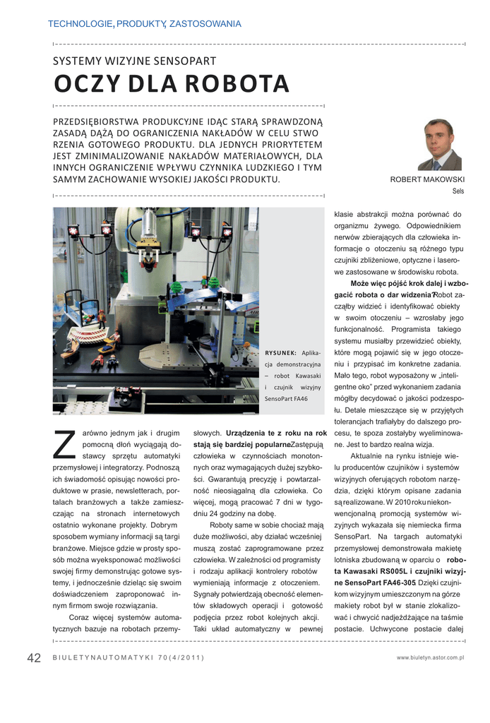 TECHNOLOGIE, PRODUKTY, ZASTOSOWANIA SYSTEMY WIZYJNE SENSOPART OCZY DLA OCZY DL AROBOTA ROBOTA PRZEDSIĘBIORSTWA PRODUKCYJNE IDĄC STARĄ SPRAWDZONĄ ZASADĄ DĄŻĄ DO OGRANICZENIA NAKŁADÓW W CELU STWO RZENIA GOTOWEGO PRODUKTU. DLA JEDNYCH PRIORYTETEM JEST ZMINIMALIZOWANIE NAKŁADÓW MATERIAŁOWYCH, DLA INNYCH OGRANICZENIE WPŁYWU CZYNNIKA LUDZKIEGO I TYM SAMYM ZACHOWANIE WYSOKIEJ JAKOŚCI PRODUKTU. ROBERT MAKOWSKI Sels klasie abstrakcji można porównać do organizmu żywego. Odpowiednikiem nerwów zbierających dla człowieka informacje o otoczeniu są różnego typu czujniki zbliżeniowe, optyczne i laserowe zastosowane w środowisku robota. Może więc pójść krok dalej i wzbogacić robota o dar widzenia?Robot zacząłby widzieć i identykować obiekty w swoim otoczeniu – wzrosłaby jego funkcjonalność. Programista takiego systemu musiałby przewidzieć obiekty, RYSUNEK: Aplika- które mogą pojawić się w jego otocze- cja demonstracyjna niu i przypisać im konkretne zadania. – robot Kawasaki Mało tego, robot wyposażony w „inteli- i gentne oko” przed wykonaniem zadania czujnik wizyjny SensoPart FA46 mógłby decydować o jakości podzespołu. Detale mieszczące się w przyjętych tolerancjach traałyby do dalszego pro- Z arówno jednym jak i drugim słowych. Urządzenia te z roku na rok cesu, te spoza zostałyby wyeliminowa- pomocną dłoń wyciągają do- stają się bardziej popularne . Zastępują stawcy sprzętu automatyki człowieka w czynnościach monoton- Aktualnie na rynku istnieje wie- przemysłowej i integratorzy. Podnoszą nych oraz wymagających dużej szybko- lu producentów czujników i systemów ich świadomość opisując nowości pro- ści. Gwarantują precyzję i powtarzal- wizyjnych oferujących robotom narzę- duktowe w prasie, newsletterach, por- ność nieosiągalną dla człowieka. Co dzia, dzięki którym opisane zadania talach branżowych a także zamiesz- więcej, mogą pracować 7 dni w tygo- są realizowane. W 2010 roku niekon- czając dniu 24 godziny na dobę. wencjonalną promocją systemów wi- na stronach internetowych Roboty same w sobie chociaż mają zyjnych wykazała się niemiecka rma sposobem wymiany informacji są targi duże możliwości, aby działać wcześniej SensoPart. Na targach automatyki branżowe. Miejsce gdzie w prosty spo- muszą zostać zaprogramowane przez przemysłowej demonstrowała makietę sób można wyeksponować możliwości człowieka. W zależności od programisty lotniska zbudowaną w oparciu o robo- swojej rmy demonstrując gotowe sys- i rodzaju aplikacji kontrolery robotów ta Kawasaki RS005L i czujniki wizyj- temy, i jednocześnie dzieląc się swoim wymieniają informacje z otoczeniem. ne SensoPart FA46-305. Dzięki czujni- doświadczeniem Sygnały potwierdzają obecność elemen- kom wizyjnym umieszczonym na górze tów składowych operacji i makiety robot był w stanie zlokalizo- ostatnio wykonane projekty. Dobrym zaproponować in- nym rmom swoje rozwiązania. Coraz więcej systemów automatycznych bazuje na robotach przemy- 42 ne. Jest to bardzo realna wizja. gotowość podjęcia przez robot kolejnych akcji. wać i chwycić nadjeżdżające na taśmie Taki układ automatyczny w postacie. Uchwycone postacie dalej B I U L E T Y N A U T O M AT Y K I 7 0 ( 4 / 2 0 11 ) pewnej www.biuletyn.astor.com.pl TECHNOLOGIE,PRODUKTY, ZASTOSOWANIA generowany sygnał klasykacji produktu jako dobrego lub złego. Układy złożone z robota przemysłowego oraz systemu wizyjnego można stosować przy stanowiskach produkcyjnych czy liniach montażowych. Wówczas w prosty sposób realizuje się werykację poprawności montażu. Dobrym przykładem z branży automotivejestkontrolapoprawności złożenia zagłówka samochodoweRYSUNEK: Kontro- go prezentowana przez rmę SELS la celek krzemo- na targach ROBOTshow 2011 w So- wych snowcu. Stanowisko było zbudowane w oparciu o robota przemysłowego Kawasaki RS005L. Na końcu ramieprzenosił przed inny czujnik wizyjny, starają się inwestować w który korzystając z algorytmów prze- kontrolę jakości redukując tym samym czujnik wizyjny twarzania obrazu sprawdzał z jakiej produkty wadliwe. Dodatkowym atu- V10 do inspekcji kompletności i jako- grupy pochodzą. Pasażerów transpor- tem pełnej kontroli produkcji jest ła- ści zagłówka. Zadaniem robota było tował do odprawy, a obsługę lotniska twość tworzenia dokumentacji i zesta- przemieszczanie czujnika i zatrzyma- umieszczał na odpowiednich stanowi- wienie wyników w celu optymalizacji nie go w skach. Natomiast potencjalnych ter- produkcji, a także wielkość niemierzal- miejscach przed zagłówkiem. W każ- rorystów oddawał w ręce policji do na – pewność swoich wyrobów. dej pozycji czujnik wizyjny wykony- dalszej „kontroli”. Było to bardzo przy- skuteczną Część przedsiębiorstw odczuwa nia robota umieszczono obiektowy SensoPart VISOR ściśle zaprogramowanych wał zdjęcie i werykował poprawność jazne zademonstrowanie współdziała- potrzebę zmian, ale nie wprowadza ich montażu poszczególnych części. Su- nia robota i czujników wizyjnych. ponieważ ma niedostateczną wiedzę na maryczny sygnał informował robota o wyniku przeprowadzonej inspekcji. W 2011 roku wszyscy dostawcy temat współczesnych systemów wizyj- dostrzegają większe zainteresowanie nych lub robotów przemysłowych, ma systemami wizyjnymi w Polsce. Dopa- złe doświadczenia z przeszłości lub po stabilnie, należy odpowiednio dobrać trują się przyczyn w ciągłym podnosze- prostu boją się innowacji. Warto jest jego części składowe. W niu produkcji i wymagań jakościowych wtedy podnieść świadomość kierownic- wizyjnych szczególną uwagę zwraca dotyczących produktów. Część wska- twa i przekonać pracowników, że zro- się na rozdzielczość i rodzaj matrycy, zuje również podniesioną świadomość botyzowany proces produkcyjny wcale ponieważ to ona decyduje o czułości kadry technicznej odno