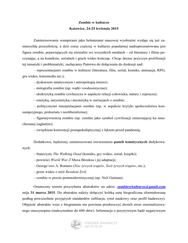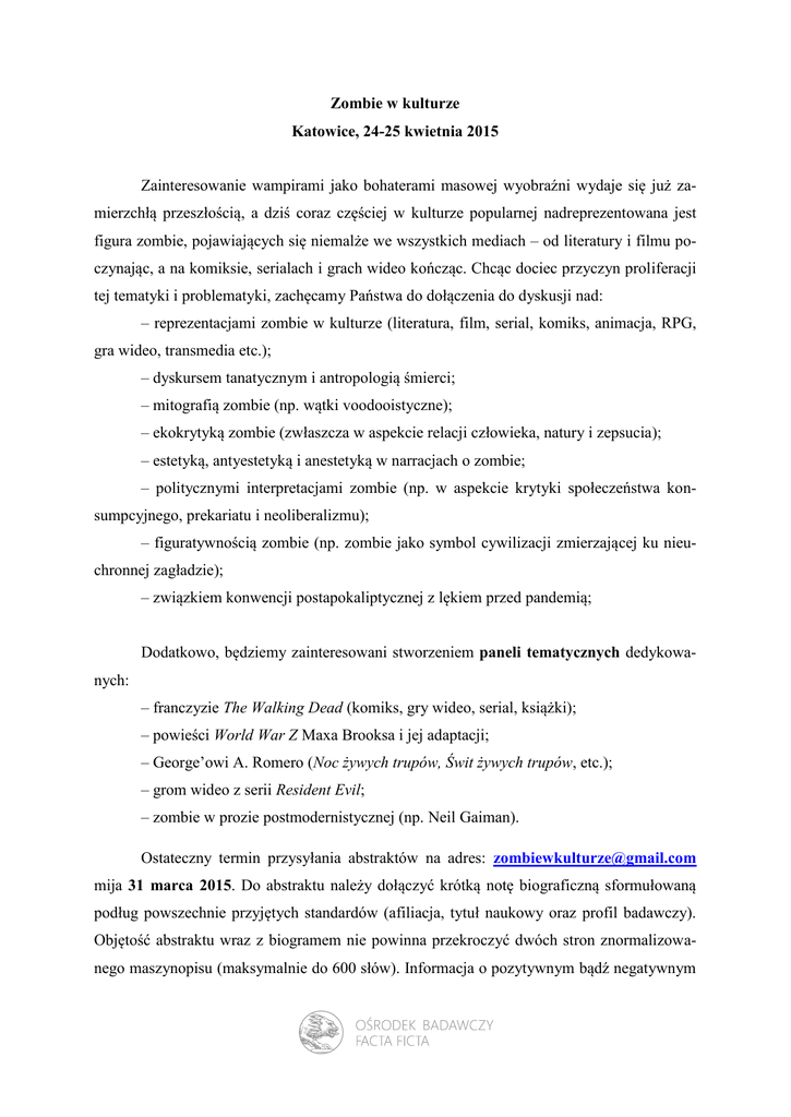 Zombie w kulturze Katowice, 24-25 kwietnia 2015 Zainteresowanie wampirami jako bohaterami masowej wyobraźni wydaje się już zamierzchłą przeszłością, a dziś coraz częściej w kulturze popularnej nadreprezentowana jest figura zombie, pojawiających się niemalże we wszystkich mediach – od literatury i filmu poczynając, a na komiksie, serialach i grach wideo kończąc. Chcąc dociec przyczyn proliferacji tej tematyki i problematyki, zachęcamy Państwa do dołączenia do dyskusji nad: – reprezentacjami zombie w kulturze (literatura, film, serial, komiks, animacja, RPG, gra wideo, transmedia etc.); – dyskursem tanatycznym i antropologią śmierci; – mitografią zombie (np. wątki voodooistyczne); – ekokrytyką zombie (zwłaszcza w aspekcie relacji człowieka, natury i zepsucia); – estetyką, antyestetyką i anestetyką w narracjach o zombie; – politycznymi interpretacjami zombie (np. w aspekcie krytyki społeczeństwa konsumpcyjnego, prekariatu i neoliberalizmu); – figuratywnością zombie (np. zombie jako symbol cywilizacji zmierzającej ku nieuchronnej zagładzie); – związkiem konwencji postapokaliptycznej z lękiem przed pandemią; Dodatkowo, będziemy zainteresowani stworzeniem paneli tematycznych dedykowanych: – franczyzie The Walking Dead (komiks, gry wideo, serial, książki); – powieści World War Z Maxa Brooksa i jej adaptacji; – George’owi A. Romero (Noc żywych trupów, Świt żywych trupów, etc.); – grom wideo z serii Resident Evil; – zombie w prozie postmodernistycznej (np. Neil Gaiman). Ostateczny termin przysyłania abstraktów na adres: [email protected] mija 31 marca 2015. Do abstraktu należy dołączyć krótką notę biograficzną sformułowaną podług powszechnie przyjętych standardów (afiliacja, tytuł naukowy oraz profil badawczy). Objętość abstraktu wraz z biogramem nie powinna przekroczyć dwóch stron znormalizowanego maszynopisu (maksymalnie do 600 słów). Informacja o pozytywnym bądź negatywnym rozpatrzeniu propozycji wystąpienia konferencyjnego zostanie rozesłana do autorów 3 kwietnia 2015. Na pokrycie kosztów związanych z cateringiem, wynajmem sali i przygotowaniem materiałów konferencyjnych przewiduje się opłatę w wysokości 450 zł (350 zł dla studentów i doktorantów), którą należało będzie uiścić najpóźniej do 10 kwietnia 2015 r. Organizatorzy przewidują publikację pokonferencyjną w formie recenzowanej antologii artykułów pokonferencyjnych w open accessie (udostępnionej w Centrum Otwartej Nauki na licencji CC BY-SA 3.0). Wybrane artykuły mogą zostać wytypowane do publikacji w recenzowanym kwartalniku naukowym „Facta Ficta”. Szczegółowe informacje znajdują się na oficjalnej stronie konferencji http://www.zombiewkulturze.wordpress.com (strona dostępna od 1 marca 2015)