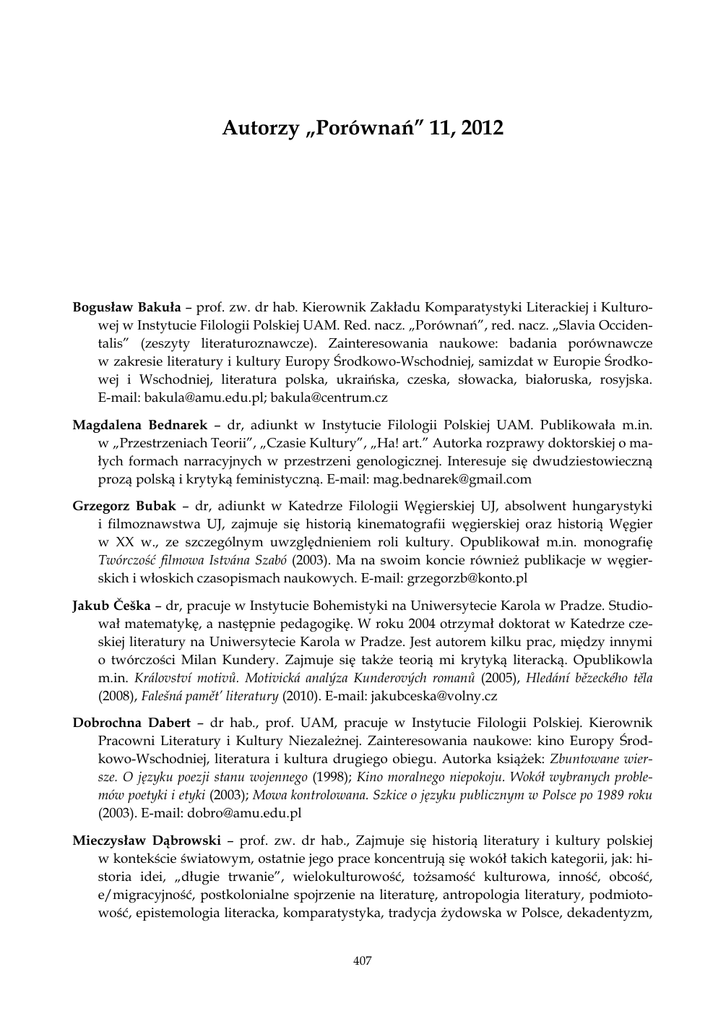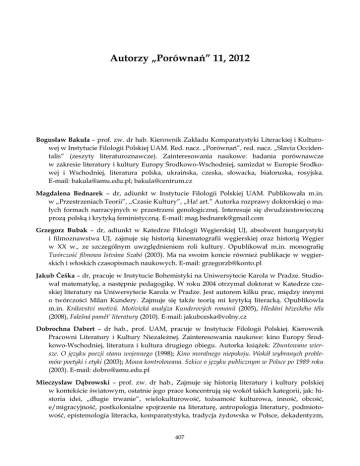 Autorzy „Porównań“ 11/2012 Autorzy „Porównań” 11, 2012 Bogusław Bakuła – prof. zw. dr hab. Kierownik Zakładu Komparatystyki Literackiej i Kulturowej w Instytucie Filologii Polskiej UAM. Red. nacz. „Porównań”, red. nacz. „Slavia Occidentalis” (zeszyty literaturoznawcze). Zainteresowania naukowe: badania porównawcze w zakresie literatury i kultury Europy Środkowo-Wschodniej, samizdat w Europie Środkowej i Wschodniej, literatura polska, ukraińska, czeska, słowacka, białoruska, rosyjska. E-mail: [email protected]; [email protected] Magdalena Bednarek – dr, adiunkt w Instytucie Filologii Polskiej UAM. Publikowała m.in. w „Przestrzeniach Teorii”, „Czasie Kultury”, „Ha! art.” Autorka rozprawy doktorskiej o małych formach narracyjnych w przestrzeni genologicznej. Interesuje się dwudziestowieczną prozą polską i krytyką feministyczną. E-mail: [email protected] Grzegorz Bubak – dr, adiunkt w Katedrze Filologii Węgierskiej UJ, absolwent hungarystyki i filmoznawstwa UJ, zajmuje się historią kinematografii węgierskiej oraz historią Węgier w XX w., ze szczególnym uwzględnieniem roli kultury. Opublikował m.in. monografię Twórczość filmowa Istvána Szabó (2003). Ma na swoim koncie również publikacje w węgierskich i włoskich czasopismach naukowych. E-mail: [email protected] Jakub Češka – dr, pracuje w Instytucie Bohemistyki na Uniwersytecie Karola w Pradze. Studiował matematykę, a następnie pedagogikę. W roku 2004 otrzymał doktorat w Katedrze czeskiej literatury na Uniwersytecie Karola w Pradze. Jest autorem kilku prac, między innymi o twórczości Milan Kundery. Zajmuje się także teorią mi krytyką literacką. Opublikowla m.in. Království motivů. Motivická analýza Kunderových romanů (2005), Hledání bězeckého těla (2008), Falešná pamět’ literatury (2010). E-mail: [email protected] Dobrochna Dabert – dr hab., prof. UAM, pracuje w Instytucie Filologii Polskiej. Kierownik Pracowni Literatury i Kultury Niezależnej. Zainteresowania naukowe: kino Europy Środkowo-Wschodniej, literatura i kultura drugiego obiegu. Autorka książek: Zbuntowane wiersze. O języku poezji stanu wojennego (1998); Kino moralnego niepokoju. Wokół wybranych problemów poetyki i etyki (2003); Mowa kontrolowana. Szkice o języku publicznym w Polsce po 1989 roku (2003). E-mail: [email protected] Mieczysław Dąbrowski – prof. zw. dr hab., Zajmuje się historią literatury i kultury polskiej w kontekście światowym, ostatnie jego prace koncentrują się wokół takich kategorii, jak: historia idei, „długie trwanie”, wielokulturowość, tożsamość kulturowa, inność, obcość, e/migracyjność, postkolonialne spojrzenie na literaturę, antropologia literatury, podmiotowość, epistemologia literacka, komparatystyka, tradycja żydowska w Polsce, dekadentyzm, 407 PORÓWNANIA 11, 2012 awangarda, modernizm literacki, postmodernizm i ponowoczesność. Opublikował m.in. „Nierzeczywista rzeczywistość”. Twórczość Andrzeja Kuśniewicza na tle epoki (1987); Polska awangarda prozatorska (1995); Dekadentyzm współczesny. Główne idee, motywy i postawy modernistyczne w polskiej i niemieckojęzycznej literaturze XX wieku (1996); Swój/Obcy/Inny. Z problemów interferencji i komunikacji międzykulturowej (2001); Projekt krytyki etycznej. Studia i szkice literackie (2005). E-mail: [email protected] Magdalena Dyras – dr hab., absolwentka kroatystyki i serbistyki w Instytucie Filologii Słowiańskiej Uniwersytetu Jagiellońskiego. Zainteresowania naukowe: przemiany tożsamości w krajach post-jugosłowiańskich, narracje tożsamościowe, rola przeszłości i historii w kształtowaniu nowego modelu kultury chorwackiej po 1990 roku, historia literatury chorwackiej i serbskiej XX i XXI wieku. Jest autorką książek: W poszukiwaniu prawdy. „Nowa serbska proza” na przełomie lat 60-tych i 70-tych (Kraków 2000) oraz Re-inkarnacje narodu. Chorwackie narracje tożsamościowe w latach dziewięćdziesiątych XX wieku (Kraków 2009). E-mail: [email protected] Kornelia Faragó – historyk literatury, krytyk, redaktor naczelna czasopisma „Híd”, wykładowca akademicki, zawiązana z uniwersytetem w Nowym Sadzie (Újvidék) i Belgradzie, laureatka wielu nagród. Zainteresowania naukowe: narratologia, geopoetyka, literatura węgierska i serbska w XX wieku. Publikacje książkowe: Térirányok, távolságok. Térdinamizmus a regényben (Újvidék, 2001), Kultúrák és narratívák. Az idegenség alakzatai (Újvidék, 2005), Dinamika prostora, kretanje mesta. Studije iz geokulturalne naratologije (Novi Sad, 2007) oraz A viszonosság alakzatai. Komparatív poétikák, viszonylati jelentéskörök (Újvidék, 2009). Hanna Gosk – profesor zwyczajny w Zakładzie Literatury XX wieku Instytutu Literatury Polskiej na Wydziale Polonistyki Uniwersytetu Warszawskiego. Kieruje Pracownią Antropologicznych Problemów Literatury. W 2009 r. stworzyła międzyuczelnianą sieć naukową – Centrum Badań Dyskursów Postzależnościowych. Opublikowała ostatnio Opowieści „skolonizowanego/kolonizatora”. W kręgu studiów postzależnościowych nad literaturą polską XX i XXI wieku (2010). Pod jej redakcją ukazały się liczne tomy zbiorowe, m.in.: (Nie)ciekawa epoka? Literatura i PRL (2008), Nowe dwudziestolecie (1989–2009) Rozpoznania. Hierarchie. Perspektywy (2010), Narracje migracyjne w literaturze polskiej XX i XXI wieku (2012). E-mail: [email protected] Agnieszka Janiec-Nyitrai – dr, ukończyła studia slawistyczne w Instytucie Slawistyki Zachodniej i Południowej Uniwersytetu Warszawskiego (specjalność: bohemistyka). Doktorat poświęcony literaturze podróżniczej Karla Čapka obroniła na Wydziale Bohemistyki Uniwersytetu Masaryka w Brnie. Obecnie pracuje jako asystent na Wydziale Studiów Środkowoeuropejskich Uniwersytetu Konstantyna Filozofa w Nitrze. Zajmuje się komparatystyką literacką i kulturą krajów Europy Środkow