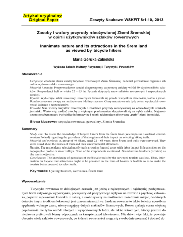 Artykuł oryginalny Original Paper Zeszyty Naukowe WSKFiT 8:1-10, 2013 Zasoby i walory przyrody nieożywionej Ziemi Śremskiej w opinii użytkowników szlaków rowerowych Inanimate nature and its attractions in the Śrem land as viewed by bicycle hikers Maria Górska-Zabielska Wyższa Szkoła Kultury Fizycznej i Turystyki, Pruszków Streszczenie Cel pracy: Zbadanie stanu wiedzy turystów rowerowych Ziemi Śremskiej na temat geowalorów regionu i ich roli w wyborze szlaku rowerowego. Materiał i metody: Przeprowadzono sondaż diagnostyczny za pomocą ankiety wśród 40 użytkowników szlaków. Respondenci byli w wieku 22 – 65 lat. Pytania dotyczyły nazw szlaków rowerowych i napotykanych atrakcji. Wyniki: Wybierając szlak rowerowy, rowerzyści kierowali się przede wszystkim obecnością lasów i jezior. Rzadko zwracano uwagę na rzeźbę terenu i doliny rzeczne. Głazy narzutowe nie były celem wycieczki rowerowej żadnego z respondentów. Wnioski: Stan wiedzy turystów rowerowych o zasobach przyrody nieożywionej na odwiedzanych szlakach jest niski. Warto więc zadbać o to, by z większym przekonaniem decydowali się na wybór szlaku. Najprostszym sposobem mogły być tablice informacyjne i ulotki reklamujące abiotyczne „perły” ziemi śremskiej. Słowa kluczowe: turystyka rowerowa, geowalory, Ziemia Śremska Summary Study aim: To assess the knowledge of bicycle hikers from the Śrem land (Wielkopolska Lowland, centralwestern Poland) regarding the geovalues of that region and their impact on selecting hiking trails. Material and methods: A group of 40 hikers, aged 22 – 65 years, from Śrem land trails were surveyed. They were asked about the names of trails and their environmental attractions. Results: The respondents selected mostly trails crossing forested areas with lakes but put little attention on the topographic profile or river valleys. None of the respondents mentioned Scandinavian boulders (erratics) as the tourist objective. Conclusions: The knowledge of geovalues of the bicycle trails by the surveyed tourists was low. Thus, information on bicycle trail attractions ought to be provided in the form of boards or leaflets so as to make the tourists better prepared to select trails. Key words: Cycling tourism, Geovalues, Śrem land Wprowadzenie Turystyka rowerowa w dzisiejszych czasach jest jedną z najczęstszych i najchętniej podejmowanych form aktywnego wypoczynku, począwszy od pozytywnego wpływu na zdrowie i psychikę człowieka, poprzez zapewnienie kontaktu z naturą, a skończywszy na możliwości zwiedzania miejsc, do których dotarcie innym środkiem lokomocji jest czasem niemożliwe. Jazda na rowerze to także świetny sposób na spędzanie wolnego czasu, niewymagający dużych nakładów finansowych. Rower zyskuje coraz większą popularność nie tylko wśród młodych i wysportowanych ludzi, ale także wśród tych, którzy jeszcze do niedawna preferowali bierny odpoczynek na kanapie przed telewizorem. Nie dziwi więc fakt, że powstaje obecnie wiele szlaków rowerowych, po których rowerzyści mogą się swobodnie poruszać i dotrzeć do 2 Walory szlaków rowerowych Ziemi Śremskiej najatrakcyjniejszych miejsc danego regionu. Również w powiecie śremskim powstała znakowana sieć szlaków rowerowych, która ma za zadanie motywować okolicznych mieszkańców i przyjezdnych turystów do korzystania z tej formy aktywnego wypoczynku oraz do zwiedzania tego regionu. W świetle tak zaprezentowanego tematu jawi się problem badawczy, którym jest stan świadomości wśród ankietowanych rowerzystów istnienia zasobów i walorów przyrody nieożywionej Ziemi Śremskiej oraz znaczenie tych elementów w wyborze trasy wycieczki rowerowej. Głównym celem opracowania było zatem poznanie oceny geozasobów i geowalorów tego regionu, jakiej dokonali użytkownicy rowerowych szlaków turystycznych. Do osiągnięcia zamierzonego celu zastosowano sondaż diagnostyczny, który przeprowadzono wśród użytkowników śremskich szlaków rowerowych. Obszar badań Według Kondrackiego [3] Ziemia Śremska położona jest w zasięgu trzech różnych regionów geograficznych, tzw. makroregionów. Północno-wschodnia jej część znajduje się na terenie Pojezierza Wielkopolskiego i należy do mezoregionu Równiny Wrzesińskiej. Prawie cała gmina Śrem wchodzi w skład Kotliny Śremskiej należącej do Pradoliny Warszawsko-Berlińskiej. Zajmuje ona centralną część powiatu. Zachodnia i południowa część znajduje się na terenie Pojezierza Leszczyńskiego. Zachodni fragment leży na obszarze Równiny Kościańskiej, a południowy na obszarze Pojezierza Krzywińskiego i Wału Żerkowskiego. Zasoby i walory środowiska przyrodniczego Według Kowalczyka [5] zasobami są wszystkie elementy środowiska przyrodniczego, występujące w obrębie danego obszaru. Natomiast walory obejmują te zasoby, które są przedmiotem zainteresowania turystów i decydują o atrakcyjności turystycznej terenu. Zarówno zasoby, jak i walory środowiska przyrodniczego są najczęściej głównym czynnikiem motywującym turystów do wyjazdów. Lijewski i in. [8] piszą, że najważniejszym kryterium zaliczenia obiektów do walorów przyrodniczych jest ich genetyczny związek ze środowiskiem przyrodniczym. Walory przyrodnicze dzieli się na dwa działy: przyrody ożywionej, reprezentowane przez zespoły lub pojedyncze okazy roślinne i zwierzęce oraz nieożywionej, przejawiające się jako jednostki geomorfologiczne. Na Ziemi Śremskiej znajdują się liczne zasoby zarówno przyrody ożywionej, jak i nieożywionej. Najbardziej cenne i ciekawe z nich podlegają ochronie prawnej. Są to pewne elementy rzeźby terenu, niektóre wody powierzchniowe oraz rzadkie gatunki roślinne. Pewne zasoby przyrodnicze przekształciły się w walory przyrodnicze, gdyż stały się atrakcyjne dla turystów, którzy przyjeżdżając głównie w celach rekreacyjnych, wykazują zainteresowanie nimi. Rzeźba i ukszta