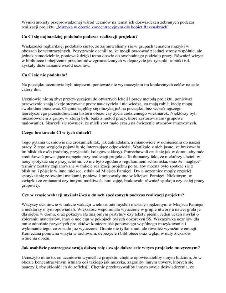 Wyniki ankiety przeprowadzonej wśród uczniów na temat ich doświadczeń zebranych podczas realizacji projektu „Muzyka w obozie koncentracyjnym dla kobiet Ravensbrück” Co Ci się najbardziej podobało podczas realizacji projektu? Większości najbardziej podobało się to, że zajmowaliśmy się w grupach tematem muzyki w obozach koncentracyjnych. Pozytywnie ocenili to, że mogli pracować z jednej strony wspólnie, ale jednak samodzielnie, ponieważ dzięki temu doszło do swobodnego podziału pracy. Również wizyta w bibliotece i obejrzenie przedmiotów zgromadzonych w depozycie jak rysunki, robótki itd. zyskały duże uznanie wśród uczniów. Co Ci się nie podobało? Na początku uczniowie byli niepewni, ponieważ nie wyznaczyłam im konkretnych celów na całe cztery dni. Uczniowie nie są zbyt przyzwyczajeni do otwartych lekcji i pracy metodą projektu, ponieważ przeważnie znają lekcje sterowane przez nauczyciela i nie wiedzą, co mają robić, kiedy mogą swobodnie pracować. Chętnie zajęliby się muzyką już na początku, bez wcześniejszego teoretycznego przestudiowania historii obozu czy życia codziennego więźniarek. Niektórzy byli niezadowoleni z grupy, w której byli, bądź z metod pracy, które zastosowałam (grupowe malowanie). Skarżyli się również, że mieli zbyt mało czasu na ćwiczenie utworów muzycznych. Czego brakowało Ci w tych dniach? Tego pytania uczniowie nie zrozumieli tak, jak zakładałam, a mianowicie w odniesieniu do naszej pracy. Z tego względu pojawiły się interesujące odpowiedzi. Wynikało z nich jasno, że brakowało im bliskich osób (rodziny, przyjaciół, kolegów z klasy). Potrzebowali czuć się jak w domu, aby móc zredukować powstające napięcie przy realizacji projektu. To tłumaczy fakt, że niektórzy chcieli w nocy spotykać się z przyjaciółmi, co nie było zgodne z regulaminem schroniska, oraz że „naglące” terminy zostały zaplanowane w trakcie realizacji projektu po to, aby można było spotkać się z bliskimi i pójście w inne miejsce, z dala od Miejsca Pamięci. Dwie uczennice mogły częściej spotykać się ze swoimi matkami, ponieważ pracowały one w Miejscu Pamięci. Niektórym, w związku ze zmianami czy innymi możliwościami zajęć, brakowało również spokoju czy stałej pracy grupowej. Czy w czasie wakacji myślałaś/-eś o dniach spędzonych podczas realizacji projektu? Wszyscy uczniowie w trakcie wakacji wielokrotnie myśleli o czasie spędzonym w Miejscu Pamięci a niektórzy o tym opowiadali. Większość wspominała wyuczone w grupie utwory a nawet grała je dla siebie w domu, oraz pokazywała znajomym partytury czy teksty pieśni. Jeden uczeń myślał o zbieraniu materiałów, inny o noclegu w pokojach byłych dozorczyń SS. Wskazówka uczniów dla mnie odnośnie przyszłych projektów: konieczność ponownego wspólnego muzykowania i wykonanie tego, co zostało już wyuczone. Granie nie tylko z nut, ale również wyrażanie emocji. Konieczna ponowna wizyta w archiwum, depozycie i bibliotece oraz wgląd w nuty z czasów istnienia obozu. Jak osobiście postrzegasz swoją dalszą rolę / swoje dalsze cele w tym projekcie muzycznym? Ucieszyło mnie to, co uczniowie wynieśli z projektu: chętnie opowiedzieliby innym ludziom, że w obozie koncentracyjnym istniało coś takiego jak muzyka, zagraliby innym utwory, których się nauczyli, aby skłonić ich do refleksji. Chętnie przekazywaliby innym swoje doświadczenia, że muzyka pomaga przezwyciężyć problemy i obawy. Większość uczniów planowała wziąć udział w uroczystości „Uczniowie zapraszają”, co zresztą uczyniła.