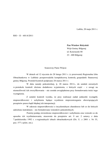 Lublin, 20 maja 2011 r. RIO – II – 601/6/2011 Pan Wiesław Różyński Wójt Gminy Biłgoraj ul. Kościuszki 88 23 - 400 Biłgoraj Szanowny Panie Wójcie W dniach od 12 stycznia do 28 lutego 2011 r. (z przerwami) Regionalna Izba Obrachunkowa w Lublinie przeprowadziła kompleksową kontrolę gospodarki finansowej gminy Biłgoraj. Protokół kontroli podpisano 28 marca 2011 r. W dniu narady pokontrolnej, tj. 28 marca 2011r., do ustaleń zawartych w protokole kontroli złożono dodatkowe wyjaśnienia, z których część – z uwagi na niemożliwość ich zweryfikowania – nie została uwzględniona przy formułowaniu treści tego wystąpienia. Z ustaleń kontroli wynika, że przy realizacji zadań jednostki wystąpiły nieprawidłowości i uchybienia będące wynikiem nieprzestrzegania obowiązujących przepisów prawa bądź błędnej ich interpretacji. W zakresie nieprawidłowości o incydentalnym charakterze lub co do których udzielono instruktażu – nie formułowano wniosków pokontrolnych. Poniżej podaję stwierdzone nieprawidłowości i uchybienia oraz wnioski co do sposobu ich wyeliminowania, stosownie do przepisów art. 9 ust. 2 ustawy z dnia 7 października 1992 r. o regionalnych izbach obrachunkowych (Dz. U. z 2001 r. Nr 55, poz. 577 z późn. zm.). 2 W załączniku do wystąpienia pokontrolnego wskazuję osoby odpowiedzialne za stwierdzone nieprawidłowości. 1. W zakresie księgowości i sprawozdawczości: 1.1. Nieprawidłowe prowadzenie ewidencji analitycznej do konta 221 „Należności z tytułu dochodów budżetowych”, w zakresie dochodów z najmu i dzierżawy oraz użytkowania wieczystego, przez prowadzenie jej tylko według podziałek klasyfikacji budżetowej zamiast według dłużników i podziałek klasyfikacji budżetowej. Konta ksiąg pomocniczych do konta 221 „Należności z tytułu dochodów budżetowych” prowadzić zgodnie z zasadami funkcjonowania tego konta, określonymi w załączniku Nr 3 do rozporządzenia Ministra Finansów z dnia 5 lipca 2010 r. w sprawie szczególnych zasad rachunkowości oraz planów kont dla budżetu państwa, budżetów jednostek samorządu terytorialnego, jednostek budżetowych, samorządowych zakładów budżetowych, państwowych funduszy celowych oraz państwowych jednostek budżetowych mających siedzibę poza granicami Rzeczypospolitej polskiej (Dz. U. Nr 128, poz. 861), zwanego w dalszej części tego wystąpienia rozporządzeniem Ministra Finansów z 5 lipca 2010 r. – str. 6 protokołu. 1.2 Dokonywanie zapisów w dzienniku budżetu i Urzędu Gminy w sposób uniemożliwiający ich jednoznaczne powiązanie ze sprawdzonymi i zatwierdzonymi dowodami księgowymi. Zapisów w dzienniku dokonywać w sposób umożliwiający ich jednoznaczne powiązanie ze sprawdzonymi i zatwierdzonymi dowodami księgowymi, stosownie do przepisów art. 14 ust. 2 ustawy z dnia 29 września 1994 r. o rachunkowości (Dz. U. z 2009 r. Nr 152, poz. 1223 z późn. zm.) – str 7, 17 protokołu. 1.3. Niezachowanie systematyki zapisów przy księgowaniu operacji gospodarczych. Zapisów o zdarzeniach dokonywać na kontach księgi głównej w ujęciu systematycznym, w związku z przepisami art. 15 ust. 1 ustawy o rachunkowości, w szczególności: a) wpływ środków na wydatki jednostki Urząd Gminy, ujmować: Wn 130 WU„Rachunek bieżący jednostki” (wydatki urzędu), Ma 223 „Rozliczenie wydatków budżetowych”, - dokonanie wydatków bieżących: Wn konta zespołu 2 „Rozrachunki i rozliczenia”, Ma 130 WU „Rachunek bieżący jednostki (wydatki urzędu)”, - przeksięgowanie zrealizowanych wydatków na podstawie sprawozdania Rb-28S z wykonania planu wydatków budżetowych: 3 Wn 223”Rozliczenie wydatków budżetowych”, Ma 800”Fundusz jednostki”; b) w przypadku wyodrębnienia bieżącego rachunku bankowego dla wydatków inwestycyjnych realizowanych przez Urząd Gminy dokonywać następujących zapisów: - przelew środków na wydatki z rachunku budżetu gminy na rachunek bieżący dla wydatków inwestycyjnych Urzędu Gminy: * w księgach rachunkowych budżetu gminy: Wn 223 „Rozliczenie wydatków budżetowych”, Ma 133 „Rachunek budżetu”, * w księgach rachunkowych Urzędu Gminy: Wn 130/I „Rachunek bieżący jednostki” (inwestycje), Ma 223 „Rozliczenie wydatków budżetowych”, - zapłata za fakturę z rachunku bieżącego dla wydatków inwestycyjnych: Wn 201 „Rozrachunki z odbiorcami i dostawcami”, Ma 130/I „Rachunek bieżący jednostki” (inwestycje), oraz równocześnie Wn 810 „Dotacje budżetowe, płatności z budżetu środków europejskich oraz środki z budżetu na inwestycje”, Ma 800 „Fundusz jednostki”; c) rozliczenia z tytułu udzielonych dotacji dla zakładu budżetowego ujmować: - przelew przyznanych dotacji: Wn 224 „Rozliczenie dotacji budżetowych oraz płatności z budżetu środków europejskich”, Ma 130/WU „Rachunek bieżący jednostki – subkonto wydatki”, - uznanie dotacji za rozliczone: Wn 810 „Dotacje budżetowe, płatności z budżetu środków europejskich oraz środki z budżetu na inwestycje”, Ma 224 „Rozliczenie dotacji budżetowych oraz płatności z budżetu środków europejskich”, - zwrot niewykorzystanej dotacji: Wn 130/WU „Rachunek bieżący jednostki – subkonto wydatki”, Ma 224 „Rozliczenie dotacji budżetowych oraz płatności z budżetu środków europejskich”, oraz techniczny zapis ujemny po obu stronach konta 130/WU: (-) Wn 130/WU „Rachunek bieżący jednostki – subkonto wydatki”, (-) Ma 130/WU „Rachunek bieżący jednostki – subkonto wydatki”, 4 stosownie do zasad funkcjonowania tych kont określonych w załącznikach Nr 2 i 3 do rozporządzenia Ministra Finansów z dnia 5 lipca 2010 r. – str. 9, 10, 111 protokołu. 1.4. Przypadki ewidencjonowania operacji gospodarczych na kontach nieprzewidzianych w zakładowym planie kont. Zapisów operacji gospodarczych dokonywać na kontach przewidzianych do stosowania w zakładowym pla