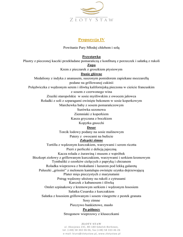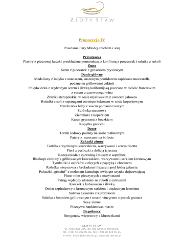 Propozycja IV Powitanie Pary Młodej chlebem i solą Przystawka Plastry z pieczonej kaczki przekładane pomarańczą z konfiturą z porzeczek i sałatką z rukoli Zupa Krem z pieczarek z groszkiem ptysiowym Danie główne Medaliony z indyka z ananasem, suszonym pomidorem zapiekane mozzarellą podane na grillowanej cukinii Polędwiczka z wędzonym serem i śliwką kalifornijską pieczona w cieście francuskim z sosem z czerwonego wina Zraziki staropolskie w sosie myśliwskim z owocem jałowca Roladki z soli z szparagami owinięte bekonem w sosie koperkowym Marchewka baby z sosem pomarańczowym Surówka sezonowa Ziemniaki z koperkiem Kasza gryczana z boczkiem Kopytka gnocchi Deser Torcik lodowy podany na sosie malinowym Patery z owocami na bufecie Zakąski zimne Tortilla z wędzonym kurczakiem, warzywami i serem ricotta Pierś z perliczki z delicją jajeczną Kacza rolada z żurawiną i musem z wątróbek Biszkopt ziołowy z grillowanym kurczakiem, warzywami i serkiem kremowym Tymbaliki z ozorków cielęcych z papryką i chrzanem Roladka wieprzowa z brokułami i lazurem pod lekką galaretą Paluszki „grissini” z melonem kantalupa owinięte szynka dojrzewającą Plater mięs pieczystych z marynatami Pstrąg wędzony ułożony na rukoli z cytrusami Karczek z kabanosem i śliwką Omlet szpinakowy z kremowym serkiem i wędzonym łososiem Sałatka Cesarska z kurczakiem Sałatka z łososiem grillowanym i sosem vinegrette z pestek granata Sosy zimne Pieczywo bankietowe, masło Po północy Strogonow wieprzowy z kluseczkami ZŁOTY STAW ul. Akacjowa 23C, 80-180 Gdańsk-Borkowo, tel. (+48) 58 302 06 06, fax (+48) 58 333 46 26 e-mail: [email protected] , www.zlotystaw.pl