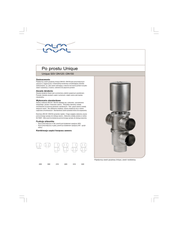 . ky Po prostu Unique Unique SSV DN125 i DN150 ky Zastosowanie Pojedynczy zawór grzybowy Unique DN125 i DN150 jest pneumatycznym zaworem o higienicznej i uniwersalnej konstrukcji umożliwiającej szerokie zastosowanie, np. jako zawór odcinający z dwoma lub trzema portami lub jako zawór rozdzielczy z trzema, czterema lub pięcioma portami Zasada działania Zasada działania Zawór jest uruchamiany zdalnie sprężonym powietrzem. Posiada niewiele prostych części ruchomych, dzięki czemu jest bardzo niezawodny. Wykonanie standardowe Zawory wielkości DN125 i DN150 składają się z siłownika, uszczelnienia wargowego, grzyba i korpusów zaworu. Wszystkie elementy zostały zmontowane za pomocą pierścieni zaciskowych. Tłok i grzyb zaworu zostały skręcone razem. Dla ułatwienia instalacji, zawory dostarcza się w stanie częściowo zmontowanym. Standardowo zawór posiada króćce do wspawania. Rozmiary DN125 i DN150 są bardzo ciężkie. Z tego względu zalecamy użycie pomocniczego sprzętu do obsługi zaworu. Zalecania zostały podane w ulotce IM 70007. Alfa Laval nie dostarcza pomocniczego sprzętu do obsługi zaworów. Funkcja siłownika - Ruch pneumatyczny w dół, powrót pod działaniem sprężyny (NO) Ruch pneumatyczny w górę, powrót po działaniem sprężyny (NC - grzyb dolny) Kombinacja części korpusu zaworu Pojedynczy zawór grzybowy Unique, zawór rozdzielczy. 200 . 300 210 220 310 320 Wykresy spadku ciśnienia/wydajności przepływu Zawór odcinający Zawór odcinający Δ Zawór rozdzielczy UWAGA! Wykresy są dla: Czynnik: Woda (20°C). Pomiar: Zgodnie VDI 2173. Zawór rozdzielczy Dane dotyczące ciśnienia dla pojedynczego zaworu grzybowego Unique DN125 i DN150 Typ/funkcja siłownika 10. Ruch pneumatyczny w dół, powrót pod działaniem sprężyny (dolny grzyb NO) 20. Ruch pneumatyczny w górę, powrót pod działaniem sprężyny (dolny grzyb NC) Tabela 1: Zawory odcinające i rozdzielcze - Maks. ciśnienie bez wycieku w grzybie zaworu Połączenie i kierunek ciśnienia siłownika/korpusu zaworu Ciśnienie powietrza (bar) Typ/funkcja siłownika Rozmiar zaworu DN 125-150 Typ 10 (NO) 5 10 (NO) DIN 8.7 6 10 (NO) DIN 4.4 5 20 (NC) 8.1* 6 20 (NC) 3.7 70 (NC) AC SC * = = = = 5.2 DIN 5.2 Powietrze zamknięte Sprężyna zamknięta Wartości są prawidłowe dla ciśnienia powietrza 8 bar Rzeczywiste ciśnienie produktu Tabela 2: Zawory odcinające i rozdzielcze. Tabela podaje przybliżone ciśnienie statyczne (P) w barach przy którym można otworzyć zawór. Kombinacje układu siłownik / korpus zaworu i kierunek ciśnienia Ciśnienie powietrza (bar) Typ siłownika / funkcja Typ DN 125-150 60 (NO) DIN 8.8 6 10 (NO) 8.1 6 60 (NO) min. 10** 6 70 (NC) 20 (NC) AO = Powietrze otwarte SO = Sprężyna otwarta DIN 7.8 8.9 Wymiary (mm) DIN DN Wymiar nominalny A1 A2 A3 A4 C OD ID t E1 E2 F1 F2 H M/DIN Męski Waga (kg) Zawór odcinający Zawór rozdzielający 125 NC 571 614 740 781 167 129 125 2.0 150 150 43 41 199 46 40.3 50 150 NO 573 618 737 778 167 129 125 2.0 150 150 45 41 199 46 40.3 50 NC 584 627 777 818 192 154 150 2.0 150 150 43 41 199 50 40.9 51.3 NO 586 631 775 816 192 154 150 2.0 150 150 45 41 199 50 40.9 51.3 Ostrzeżenie, czas otwarcia, zamknięcia: Na czas otwarcia/zamknięcia mają wpływ - Dopływ powietrza (ciśnienie powietrza). Długość i wymiary przewodów powietrznych. Liczba zaworów podłączonych do tego samego przewodu powietrznego. Użycie pojedynczego elektrozaworu dla szeregowo podłączonych funkcji siłownika pneumatycznego. Ciśnienie produktu. Połączenia pneumatyczne, sprężone powietrze: R 1/8" (BSP), gwint wewnętrzny. a. Zawór odcinający. b. Zawór rozdzielczy. Rys. 2. Wymiary. Dane techniczne Maks. ciśnienie produktu: . . . . . . . . . . . . . . . . . . . Min. ciśnienie produktu: . . . . . . . . . . . . . . . . . . . . Zakres temperatur, standardowe uszczelnienie wargowe: Zakres temperatur, specjalne uszczelnienie wargowe: . . . . . . . . . . . . . . . . . . . . . . . . . . . . . . . . . . . . . . . . . . . . . . . . . . . . . . . . . . . . . . . . . . 1000 kPa (10 bar). Pełna próżnia. -10°C do +100°C (EPDM) -10°C do +140°C (EPDM) Siłownik pneumatyczny - Rozmiary DN125-150 . . . . . . . . . . . . . . . . . . . . . . . . . . . . . . . . . . . . . 600 do 800 kPa (6 do 8 bar) Zużycie powietrza na jeden skok (w litrach wolnego powietrza) Rozmiar Zawór odcinający / zawór rozdzielczy Działanie siłownika Zawór odcinający / zawór rozdzielczy Działanie siłownika DN 125-150 1,5 x ciśnienie powietrza [bar) NC 3,6 x ciśnienie powietrza (bar) NC (powietrze wsp. zamykania) DN 125-150 2,2 x ciśnienie powietrza [bar) NO 2,9 x ciśnienie powietrza (bar) NO (powietrze wsp. otwierania) Materiały Elementy stalowe mające kontakt z produktem: . . . . . . . . . . . . . . . . . . . . . . Stal kwasoodporna 1,4401 (316L). Wykończenie: . . . . . . . . . . . . . . . . . . . . . . . . . . . . . . . . . . . . . . . . . . . Półmat. Pozostałe elementy stalowe: . . . . . . . . . . . . . . . . . . . . . . . . . . . . . . . . . Stal nierdzewna 1.4301 (304). Trzpień grzyba - Rozmiary DN125-150 . . . . . . . . . . . . . . . . . . . Uszczelki mające kontakt z produktem . . . . . . . . . Inne uszczelki . . . . . . . . . . . . . . . . . . . . . . . . Zamienne uszczelki mające kontakt z produktem . . . . . . . . . . . . . . . . . . . . . . . . . . . . . . . . . . . . . . . . . . . . . . . . . . . . . . . . . . . . . . . . . . . . . . . . . . . 1,4401 (316L) EPDM (standard) Guma nitrylowa (NBR) Guma nitrylowa (NBR) i guma fluorowa (FPM), PTFE/FEP Opcje Zamawianie A. Części zewnętrzne zgodne z wymaganym standardem. B. Kontrola i wskazanie (patrz rozdział w katalogu produktów). C. Chropowatość powierzchni, elementy mające kontakt z produktem: Ra 0,8 µm. D. Uszczelki mające kontakt z produktem: z gumy nitrylowej (NBR), z gumy fluorowej (FPM) lub PTFE. E. Narzędzia serwisowe dla siłownika. Przy składaniu zamówienia należy określić: -