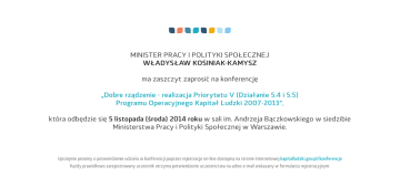 MINISTER PRACY I POLITYKI SPOŁECZNEJ WŁADYSŁAW KOSINIAK-KAMYSZ ma zaszczyt zaprosić na konferencję „Dobre rządzenie - realizacja Priorytetu V (Działanie 5.4 i 5.5) Programu Operacyjnego Kapitał Ludzki 2007-2013”, która odbędzie się 5 listopada (środa) 2014 roku w sali im. Andrzeja Bączkowskiego w siedzibie Ministerstwa Pracy i Polityki Społecznej w Warszawie. Uprzejmie prosimy o potwierdzenie udziału w konferencji poprzez rejestrację on-line dostępną na stronie internetowej kapitalludzki.gov.pl/konferencje Każdy prawidłowo zarejestrowany uczestnik otrzyma potwierdzenie uczestnictwa na adres e-mail wskazany w formularzu rejestracyjnym. KONFERENCJA DOBRE RZĄDZENIE REALIZACJA PRIORYTETU V (DZIAŁANIE 5.4 i 5.5) PROGRAMU OPERACYJNEGO KAPITAŁ LUDZKI 2007-2013 Konferencja współfinansowana ze środków Unii Europejskiej w ramach Europejskiego Funduszu Społecznego PROGRAM KONFERENCJI 9.30 – 10.30 10.30 – 10.50 Rejestracja uczestników Powitanie uczestników i podsumowanie roli MPiPS we wdrażaniu Działania 5.4 i 5.5 PO KL – Pani Małgorzata Marcińska, Podsekretarz Stanu w Ministerstwie Pracy i Polityki Społecznej 10.50 – 11.10 Stan wdrażania Działania 5.4 PO KL – Pani Agnieszka Sztymelska-Opas, Departament Wdrażania EFS w MPiPS 11.10 – 11.40 Podsumowanie projektów systemowych realizowanych w ramach Poddziałania 5.4.1 PO KL – Pan Krzysztof Więckiewicz, Dyrektor Departamentu Pożytku Publicznego w MPiPS Prezentacja projektu „Model współpracy administracji publicznej i organizacji pozarządowych – wypracowanie i upowszechnienie standardów współpracy" – Pan Łukasz Waszak, Prezes Zarządu Centrum Promocji i Rozwoju Inicjatyw Obywatelskich „OPUS” 11.40 – 12.00 Prezentacja projektu „Poznaj swoje prawa - bezpłatne poradnictwo prawne i obywatelskie dla mieszkańców powiatu puławskiego i ryckiego” – Pani Monika Grodzka, Wiceprezes Zarządu Lubelskiego Ośrodka Samopomocy - koordynator projektu 12.00 – 12.20 Przerwa kawowa 12.20 – 12.50 Prezentacja wybranych projektów z zakresu centrów wspierania organizacji pozarządowych Projekt „Trasa 78 - ze śląskiego w świętokrzyskie" – przedstawiciel Stowarzyszenia Centrum Rozwoju Inicjatyw Społecznych CRIS Projekt „Centrum wspierania inicjatyw pozarządowych RAZEM" – przedstawiciel Fundacji RAZEM 12.50 – 13.20 Prezentacja wybranych projektów innowacyjnych realizowanych w ramach Poddziałania 5.4.2 PO KL Projekt „Regranting jako sposób zwiększenia zakresu, skali i efektywności realizacji zadań publicznych przez organizacje pozarządowe w gminie i powiecie" – Pan Tomasz Schimanek, ekspert do spraw organizacyjnych pozarządowych i programów społecznych, Akademia Rozwoju Filantropii w Polsce Projekt „Samorząd - NGO's, dobre praktyki w zakresie przekazywania zadań publicznych" – przedstawiciel Beneficjenta 13.20 – 13.40 Wzmocnienie potencjału związków zawodowych i organizacji pracodawców w ramach Działania 5.5 PO KL – Pani Aneta Zaraś, Departament Wdrażania EFS w MPiPS 13.40 – 14.00 Prezentacja projektu „Centrum Wspierania Dialogu Regionalnego” zakładającego podniesienie jakości, rangi i standardów prowadzenia dialogu regionalnego w ramach WKDS Pani Anna Wolska, Członek Zarządu Związku Pracodawców Warszawy i Mazowsza – koordynator projektu 14:00 Obiad t Świa owy wiaNt a ka ac Br ka dzka ogro Now Hoża 2007 2008 2009 t bra Roz Hoża 2010 TERMIN I MIEJSCE KONFERENCJI ka ejs Wi owieskie zdsk zdjaow jeleUjejaU AleA Hoża Mokotowska ólna Wsp Ministerstwo Pracy i Polityki Społecznej Departament Wdrażania Europejskiego Funduszu Społecznego ul. Nowogrodzka 1/3/5, 00-513 Warszawa e-mail: [email protected] Książęca Książęca h rzec Pl. Tyży Krz za Kruc a owsk załk Mars ska ań Pozn ólna Wsp ORGANIZATOR KONFERENCJI skie zolim Jero e j Ale wia Żura skie zolim Jero e j le A iat y Św Now aws ałskko ow zaałrksz MarsM MAPA DOJAZDU o Rond skiego o w RondDmsokiegokie s w Dmeorozolim J Aleje 3 Aleja 2011 5 listopada 2014 r. - początek o godz. 10.30 siedziba Ministerstwa Pracy i Polityki Społecznej ul. Nowogrodzka 1/3/5 sala im. Andrzeja Bączkowskiego (I piętro) 2012 2013 2014 kapitalludzki.gov.pl