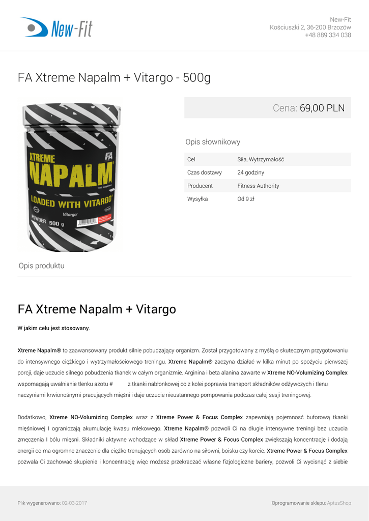 New-Fit Kościuszki 2, 36-200 Brzozów +48 889 334 038 FA Xtreme Napalm + Vitargo - 500g Cena: 69,00 PLN Opis słownikowy Cel Siła, Wytrzymałość Czas dostawy 24 godziny Producent Fitness Authority Wysyłka Od 9 zł Opis produktu FA Xtreme Napalm + Vitargo W jakim celu jest stosowany. Xtreme Napalm® to zaawansowany produkt silnie pobudzający organizm. Został przygotowany z myślą o skutecznym przygotowaniu do intensywnego ciężkiego i wytrzymałościowego treningu. Xtreme Napalm® zaczyna działać w kilka minut po spożyciu pierwszej porcji, daje uczucie silnego pobudzenia tkanek w całym organizmie. Arginina i beta alanina zawarte w Xtreme NO-Volumizing Complex wspomagają uwalnianie tlenku azotu #℣佐⌡⌀一伀⌡⍃倣℣ z tkanki nabłonkowej co z kolei poprawia transport składników odżywczych i tlenu naczyniami krwionośnymi pracujących mięśni i daje uczucie nieustannego pompowania podczas całej sesji treningowej. Dodatkowo, Xtreme NO-Volumizing Complex wraz z Xtreme Power & Focus Complex zapewniają pojemnosć buforową tkanki mięśniowej I ograniczają akumulację kwasu mlekowego. Xtreme Napalm® pozwoli Ci na długie intensywne treningi bez uczucia zmęczenia I bólu mięsni. Składniki aktywne wchodzące w skład Xtreme Power & Focus Complex zwiększają koncentrację i dodają energii co ma ogromne znaczenie dla ciężko trenujących osób zarówno na siłowni, boisku czy korcie. Xtreme Power & Focus Complex pozwala Ci zachować skupienie i koncentrację więc możesz przekraczać własne fizjologiczne bariery, pozwoli Ci wycisnąć z siebie Plik wygenerowano: 02-03-2017 Oprogramowanie sklepu: AptusShop New-Fit Kościuszki 2, 36-200 Brzozów +48 889 334 038 więcej, zrobić więcej powtórzeń i trenować dłużej niż kiedykolwiek wcześniej. Każda porcja Xtreme Napalm® zapewnia organizmowi optymalne ilości najsilniejszych przeciwutleniaczy redukujących wolne rodniki, a Electrolite & Delivery Complex odpowiada za właściwe nawodnienie organizmu podczas intensywnego treningu. Oznacza to, że dzięki Xtreme Napalm® organizm jest prawidłowo nawodniony i może wytrzymać więcej przez dłuższy okres czasu. Od teraz Xtreme Napalm® w formie proszku dostępny jest w dwóch wersjach: Xtreme Napalm® loaded with Vitargo® i Xtreme Napalm® Pre-Contest! Xtreme Napalm® Pre-Contest nie zawiera węglowodanów i może być spożywany przez wszystkie osoby z ograniczonym zapotrzebowaniem na węglowodany w diecie. Xtreme Napalm® Pre-Contest to idealny wybór dla każdego kto chce zbudować beztłuszczową masę mięśniową w miedzy treningowych okresach. Xtreme Napalm® loaded with Vitargo® zawiera łatwo przyswajalne węglowodany będące łatwo dostępnym źródłem energii dla pracujących mięśni. Wyjątkowe właściwości wielkocząsteczkowych węglowodanów zawartych w Xtreme Napalm® loaded with Vitargo® zostały potwierdzone wieloma badaniami klinicznymi. Wykazano, że wielkocząsteczkowe węglowodany opuszają żołądek 80% szybciej niż maltodekstryny i cukry co sprawia, że są w większym stopniu absorbowane przez organizm. Xtreme Napalm loaded with Vitargo® nie tylko przygotowuje organizm do ciężkich sesji treningowych ale także wspiera dystrybucję energii podczas ćwiczeń co pozwala na trening na jeszcze wyższym poziomie niż zazwyczaj. Stosowanie: Rozpuścić 2 miarki proszku #℣佐⌡⌀縀 Ⰰ㜀 最⌡⍃倣℣ w 150-200 ml wody lub soku i spożywać na 30 minut przed treningiem. Nie przekraczać zalecanej do spożycia dziennej porcji produktu. Porcja: 2 Miarki (10,7 g) Opakowanie: 500g Ilość porcji w opakowaniu ~46 Skład : Porcja 10,7g. Witamina C 100mg Niacyna 10mg Witamina B6 4mg Witamina B12 5µg Selen 27,5µg Beta-Alanina (as CarnoSyn®) 2000mg Arginina AKG 1000mg Plik wygenerowano: 02-03-2017 Oprogramowanie sklepu: AptusShop New-Fit Kościuszki 2, 36-200 Brzozów +48 889 334 038 w tym arginina 700mg Jabłczan cytruliny 750mg w tym cytrulina 700mg Tauryna 500mg Kofeina bezwodna 200mg Glukuronolakton 100mg Sód 10mg Skrobia kukurydziana (Vitargo®) 5000mg Hydrolizowana kazeina (PeptoPro®) 25mg Składniki: Skrobia kukurydziana #℣佐⌡⌀嘀椀琀愀爀最漀글⌡⍃倣℣, beta-alanina #℣佐⌡⌀䌀愀爀渀漀匀礀渀 글 ⌡⍃倣℣, alfa-ketoglutaran argininy, jabłczan cytruliny, aromat-5, tauryna, aromat-4, premix witaminowo-mineralny [witamina C #℣佐⌡⌀欀眀愀猀 䰀ⴀ愀猀欀漀爀戀椀渀漀眀礀⌡⍃倣℣, fosforan dwupotasowy, wodorowęglan sodu, fosforan magnezu, niacyna #℣佐⌡⌀愀洀椀搀 欀眀愀猀甀 渀椀欀漀琀礀渀漀眀攀最漀⌡⍃倣℣, witamina B6 #℣佐⌡⌀挀栀氀漀爀漀眀漀搀漀爀攀欀 瀀椀爀礀搀漀欀猀礀渀礀⌡⍃倣℣, selenian #℣佐⌡⌀䤀嘀⌡⍃倣℣ sodu, witamina B12 #℣佐⌡⌀挀礀樀愀渀漀欀漀戀愀氀愀洀椀渀愀⌡⍃倣℣], aromat-1, regulator kwasowości #℣佐⌡⌀欀眀愀猀 挀礀琀爀礀渀漀眀礀⌡⍃倣℣, aromaty-2;3, bezwodna kofeina, glukuronolakton, substancja słodząca #℣佐⌡⌀猀甀欀爀愀氀漀稀愀Ⰰ 愀挀攀猀甀氀昀愀洀 䬀⌡⍃倣℣, koncentrat soku buraczanego-4, barwnik #℣佐⌡⌀戀攀琀愀ⴀ欀愀爀漀琀攀渀ⴀⰀ㈀㬀 䔀㐀ⴀ㔀⌡⍃倣℣, barwniki #℣佐⌡⌀䔀 ㈀Ⰰ 䔀㌀㌀⌡⍃倣℣, substancja przeciwzbrylająca (dwutlenek krzemu), hydrolizowana kazeina (PeptoPro®). Dotyczy produktów o smaku: 1-Pomarańczowym, 2-gruszkowo - jabłkowym, 3-ananas kiwi, 4-arbuzowym, 5-Mojito. Plik wygenerowano: 02-03-2017 Powered by TCPDF (www.tcpdf.org) Oprogramowanie sklepu: AptusShop