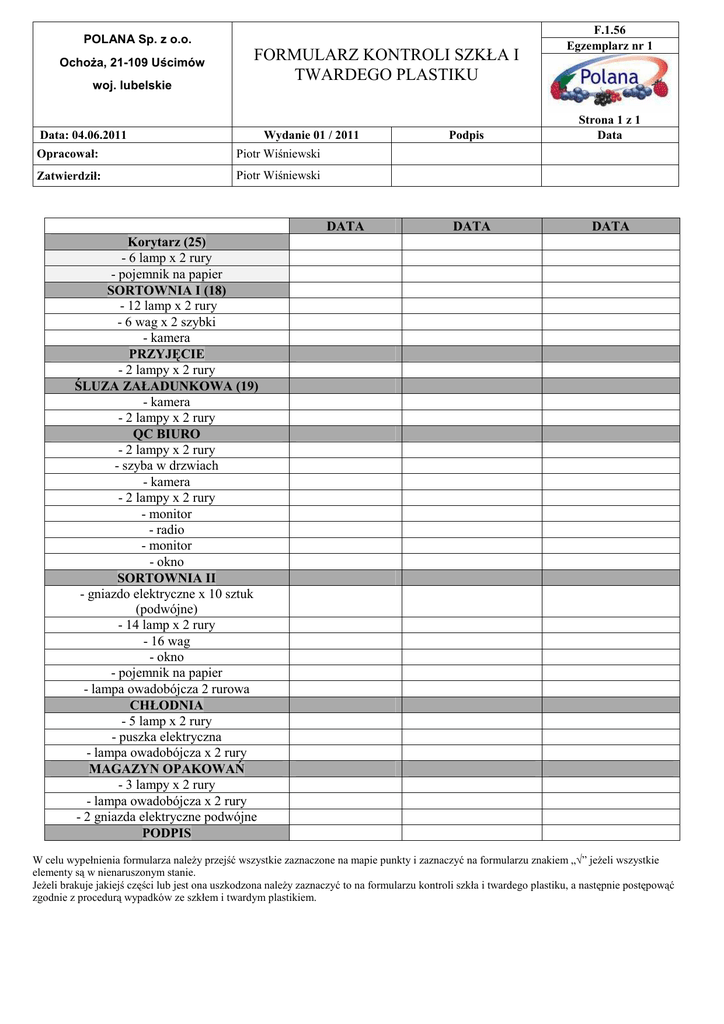 POLANA Sp. z o.o. OchoŜa, 21-109 Uścimów woj. lubelskie FORMULARZ KONTROLI SZKŁA I TWARDEGO PLASTIKU Data: 04.06.2011 Wydanie 01 / 2011 Opracował: Piotr Wiśniewski Zatwierdził: Piotr Wiśniewski DATA Podpis DATA F.1.56 Egzemplarz nr 1 Strona 1 z 1 Data DATA Korytarz (25) - 6 lamp x 2 rury - pojemnik na papier SORTOWNIA I (18) - 12 lamp x 2 rury - 6 wag x 2 szybki - kamera PRZYJĘCIE - 2 lampy x 2 rury ŚLUZA ZAŁADUNKOWA (19) - kamera - 2 lampy x 2 rury QC BIURO - 2 lampy x 2 rury - szyba w drzwiach - kamera - 2 lampy x 2 rury - monitor - radio - monitor - okno SORTOWNIA II - gniazdo elektryczne x 10 sztuk (podwójne) - 14 lamp x 2 rury - 16 wag - okno - pojemnik na papier - lampa owadobójcza 2 rurowa CHŁODNIA - 5 lamp x 2 rury - puszka elektryczna - lampa owadobójcza x 2 rury MAGAZYN OPAKOWAŃ - 3 lampy x 2 rury - lampa owadobójcza x 2 rury - 2 gniazda elektryczne podwójne PODPIS W celu wypełnienia formularza naleŜy przejść wszystkie zaznaczone na mapie punkty i zaznaczyć na formularzu znakiem „√” jeŜeli wszystkie elementy są w nienaruszonym stanie. JeŜeli brakuje jakiejś części lub jest ona uszkodzona naleŜy zaznaczyć to na formularzu kontroli szkła i twardego plastiku, a następnie postępowąć zgodnie z procedurą wypadków ze szkłem i twardym plastikiem.
