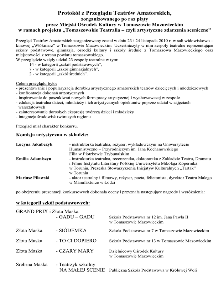 Protokół z Przeglądu Teatrów Amatorskich, zorganizowanego po raz piąty przez Miejski Ośrodek Kultury w Tomaszowie Mazowieckim w ramach projektu „Tomaszowskie Teatralia – czyli artystyczne zdarzenia sceniczne” Przegląd Teatrów Amatorskich zorganizowany został w dniu 23 i 24 listopada 2010 r. w sali widowiskowo – kinowej „Włókniarz” w Tomaszowie Mazowieckim. Uczestniczyły w nim zespoły teatralne reprezentujące szkoły podstawowe, gimnazja, ośrodki kultury i szkoły średnie z Tomaszowa Mazowieckiego oraz miejscowości z terenu powiatu tomaszowskiego. W przeglądzie wzięły udział 23 zespoły teatralne w tym: 14 - w kategorii „szkół podstawowych”, 7 - w kategorii „szkół gimnazjalnych”, 2 - w kategorii „szkół średnich”. Celem przeglądu było: - prezentowanie i popularyzacja dorobku artystycznego amatorskich teatrów dziecięcych i młodzieżowych - konfrontacja dokonań artystycznych - inspirowanie do poszukiwań nowych form pracy artystycznej i wychowawczej w zespole - edukacja teatralna dzieci, młodzieży i ich artystycznych opiekunów poprzez udział w zajęciach warsztatowych - zainteresowanie dorosłych ekspresją twórczą dzieci i młodzieży - integracja środowisk twórczych regionu Przegląd miał charakter konkursu. Komisja artystyczna w składzie: Lucyna Jakubczyk Emilia Adamiszyn Mariusz Pilawski - instruktorka teatralna, reżyser, wykładowczyni na Uniwersytecie Humanistyczno – Przyrodniczym im. Jana Kochanowskiego Filia w Piotrkowie Trybunalskim - instruktorka teatralna, recenzentka, doktorantka z Zakładzie Teatru, Dramatu i Filmu Instytutu Literatury Polskiej Uniwersytetu Mikołaja Kopernika w Toruniu, Prezeska Stowarzyszenia Inicjatyw Kulturalnych „Tartak” w Toruniu - aktor teatralny i filmowy, reżyser, poeta, felietonista, dyrektor Teatru Małego w Manufakturze w Łodzi po obejrzeniu prezentacji konkursowych dokonała oceny i przyznała następujące nagrody i wyróżnienia: w kategorii szkół podstawowych: GRAND PRIX i Złota Maska - GADU – GADU Szkoła Podstawowa nr 12 im. Jana Pawła II w Tomaszowie Mazowieckim Złota Maska - SIÓDEMKA Szkoła Podstawowa nr 7 w Tomaszowie Mazowieckim Złota Maska - TO CI DOPIERO Szkoła Podstawowa nr 13 w Tomaszowie Mazowieckim Złota Maska - CZARY MARY Dzielnicowy Ośrodek Kultury w Tomaszowie Mazowieckim Srebrna Maska - Teatrzyk szkolny NA MAŁEJ SCENIE Publiczna Szkoła Podstawowa w Królowej Woli Srebrna Maska - BRZDĄCE Brązowa Maska - HORROREK Brązowa Maska - TEATRZYK CHŁOPIĘCY „SIEDMIU” Szkoła Podstawowa nr 12 im. Jana Pawła II w Tomaszowie Mazowieckim Dzielnicowy Ośrodek Kultury w Tomaszowie Mazowieckim Szkoła Podstawowa nr 7 w Tomaszowie Mazowieckim Brązowa Maska - CZARY MARY Zespół Szkół nr 8 w Tomaszowie Mazowieckim Wyróżnienie - SITOWIE Publiczna Szkoła Podstawowa w Inowłodzu W kategorii szkół podstawowych komisja artystyczna przyznała także wyróżnienia aktorskie - dla „pięciu sów” ze spektaklu „Prawo jazdy” zespołu SITOWIE - dla „Czerwonego Kapturka” ze spektaklu „Czerwony Kapturek szuka księcia” zespołu CZARY MARY ZS nr 8 - dla „Kukułki Wieśki, Wrony i Gołębia” ze spektaklu „Gniazdo” zespołu BRZDĄCE - dla „Księżniczki Leny i dla robotów” ze spektaklu „Epidemia nicnierobienia” zespołu CZARY MARY DOK - dla „Murzynka Bambo” ze spektaklu „Nowy kolega” zespołu „TO CI DOPIERO” w kategorii szkół gimnazjalnych: Srebrna Maska - POD SŁOŃCEM Publiczne Gimnazjum w Popielawach Srebrna Maska - OKSYMORON Zespół Szkół nr 4 w Tomaszowie Mazowieckim Brązowa Maska - Grupa Teatralna INNI Gimnazjum nr 6 im. Ks. Jana Twardowskiego w Tomaszowie Mazowieckim Wyróżnienie - TRAKT Publiczne Gimnazjum w Będkowie Wyróżnienie - ARTISTIC SQAD Gimnazjum nr 7 w Tomaszowie Mazowieckim W kategorii szkół gimnazjalnych komisja artystyczna przyznała wyróżnienia aktorskie - dla „kierowniczki banku” ze spektaklu „Druga szansa” zespołu POD SŁOŃCEM - dla „zespołu sekretarek” ze spektaklu „Druga szansa” zespołu POD SŁOŃCEM w kategorii szkół średnich: Wyróżnienie - Szkolny Amatorski Teatr TRZCINA II Liceum Ogólnokształcące im. Stefana Żeromskiego w Tomaszowie Mazowieckim W tej kategorii komisja artystyczna przyznała wyróżnienia aktorskie - dla „trzech kotów” ze spektaklu „Ballada o chorym księżycu” SAT TRZCINA Uwagi Komisji Artystycznej: Jury dziękuje opiekunom i wykonawcom za wkład pracy oraz organizatorom za sprawne przygotowanie przeglądu. Z radością informuje, że poziom artystyczny zaprezentowanych spektakli był dobry. Jury zwraca uwagę i prosi o podjęcie starań i pieczołowite dbanie o podstawy techniki mówienia w ogóle, emisji i artykulacji. Jednocześnie w sferze dużego zainteresowania jury, co jest uwaga na przyszłość, leży podejmowanie ważkich społecznie tematów. Również dobór literatury jest istotny, jak i sens, wymowa i prostota w dobieraniu odpowiednich, czystych środków wyrazu. To wszystko kształtuje poczucie smaku, wyrabia gust i przygotowuje młodzież do świadomego uczestnictwa w kulturze. Przegląd Teatrów Amatorskich oraz wydarzenia towarzyszące „V Tomaszowskim Teatraliom” zostały sfinansowane ze środków własnych i pozyskanych przez Miejski Ośrodek Kultury w Tomaszowie Mazowieckim. Wydarzenie wsparły finansowo, rzeczowo i organizacyjnie następujące urzędy, firmy i instytucje: Gmina Miasto Tomaszowów Mazowiecki, Starostwo Powiatowe w Tomaszowie Mazowieckim, Firma Frito Lay i Ceramika Paradyż Spółka z o.o. oraz firma Rembor. Podpisała Komisja Artystyczna