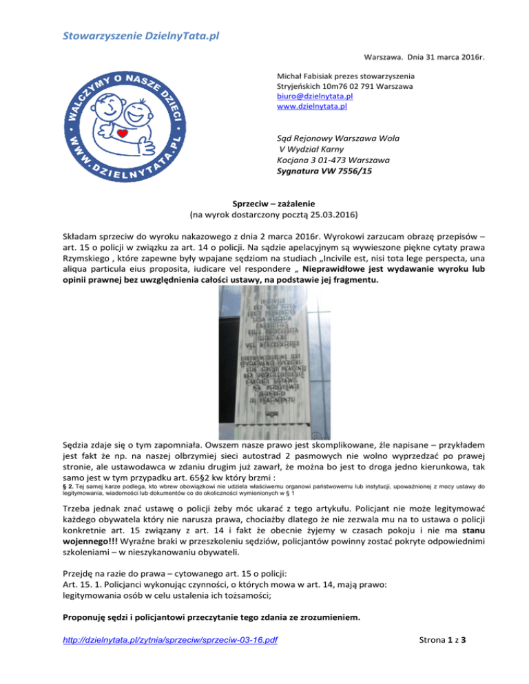 Stowarzyszenie DzielnyTata.pl Warszawa Dnia 31 marca 2016r. Warszawa. Michał Fabisiak prezes stowarzyszenia Stryjeńskich 10m76 02 791 Warszawa [email protected] www.dzielnytata.pl Sąd Rejonowy Warszawa Wola V Wydział Karny Kocjana 3 01-473 473 Warszawa Sygnatura VW 7556/15 Sprzeciw – zażalenie (na wyrok dostarczony pocztą 25.03.2016) Składam sprzeciw do wyroku nakazowego z dnia 2 marca 2016r.. Wyrokowi zarzucam obrazę przepisów – art. 15 o policji w związku za art. 14 o policji. policji. Na sądzie apelacyjnym są wywieszone piękne cytaty prawa Rzymskiego , któree zapewne były wpajane sędziom na studiach „Incivile „Incivile est, nisi tota lege perspecta, una aliqua particula eius proposita, iudicare vel respondere „ Nieprawidłowe jest wydawanie wyroku lub opinii prawnej bez uwzględnienia całości ustawy, na podstawie jej fragmentu. fragmentu Sędzia zdaje się o tym zapomniała. Owszem nasze prawo jest skomplikowane, źle napisane – przykładem jest fakt że np. na naszej olbrzymiej sieci autostrad 2 pasmowych nie wolno wyprzedzać po prawej stronie, ale ustawodawca w zdaniu drugim już zawarł, zawarł że można bo jest to droga jedno kierunkowa, tak samo jest w tym przypadku art. 65§2 kw który brzmi : § 2. Tej samej karze podlega, kto wbrew obowiązkowi obowi nie udziela właściwemu organowi państwowemu stwowemu lub instytucji, upowaŜnionej upowa z mocy ustawy do legitymowania, wiadomości ci lub dokumentów co do okoliczności okoliczno wymienionych w § 1 Trzeba jednak znać ustawę o policji żeby móc ukarać z tego artykułu. Policjant nie może mo legitymować każdego obywatela który nie narusza prawa, chociażby dlatego że nie zezwala mu na to ustawa o policji konkretnie art. 15 związany z art. 14 i fakt że obecnie żyjemy w czasach pokoju i nie ma stanu wojennego!!! Wyraźne aźne braki w przeszkoleniu sędziów, sędziów, policjantów powinny zostać pokryte odpowiednimi szkoleniami – w nieszykanowaniu obywateli. Przejdę na razie do prawa – cytowanego art. 15 o policji: Art. 15. 1. Policjanci wykonując czynności, o których mowa w art. 14, mają prawo: legitymowania osób sób w celu ustalenia ich tożsamości; Proponuję sędzi i policjantowi przeczytanie tego zdania ze zrozumieniem. zrozumieniem http://dzielnytata.pl/zytnia/sprzeciw/sprzeciw http://dzielnytata.pl/zytnia/sprzeciw/sprzeciw-03-16.pdf Strona 1 z 3 Stowarzyszenie DzielnyTata.pl Nie można przeczytać tylko punktu 1 go , wcześniej jest art. 14 który brzmi po krótce: Art. 14. 1. W granicach swych zadań Policja wykonuje czynności: operacyjno--rozpoznawcze, dochodzeniowo-śledcze i administracyjno-porządkowe w celu: 1) rozpoznawania, zapobiegania i wykrywania przestępstw i wykroczeń; 2) poszukiwania osób ukrywających się przed organami ścigania lub wymiaru sprawiedliwości, zwanych dalej „osobami poszukiwanymi”; 3) poszukiwania osób, które na skutek wystąpienia zdarzenia uniemoŜliwiającego ustalenie miejsca ich pobytu naleŜy odnaleźć w celu zapewnienia ochrony ich Ŝycia, zdrowia lub wolności, zwanych dalej „osobami zaginionymi”. 2. Policja wykonuje równieŜ czynności na polecenie sądu, prokuratora, organów administracji państwowej i samorządu terytorialnego w zakresie, w jakim obowiązek ten został określony w odrębnych ustawach. 3. Policjanci w toku wykonywania czynności słuŜbowych mają obowiązek respektowania godności ludzkiej oraz przestrzegania i ochrony praw człowieka. Pozostało zatem zadać pytanie 1) czy policjant Tomasz Mikuła prowadził ze mną czynności ujęte w art. 15 a sprecyzowane w art. 14 – otóż NIE !!!! 2) Czy było rozpoznawane przestępstwo przeze mnie lub naruszenie – Nie 3) Czy byłym podejrzany jako osoba ukrywająca się – NIE A zatem art. 15 o policji zezwala policjantowi legitymować osoby poszukiwane albo te które naruszają prawo. Owszem prawo zostało naruszone – ale nie przeze mnie tylko przez Policjanta Mikułę, Policjant kopał mnie po łydkach, próbował zastraszać mnie że naruszam porządek na „jego komisariacie”, próbował oskarżać mnie – że nie legalnie go filmuję, próbował ukraść mi telefon komórkowy – którym nagrywałem całe zdarzenie na żywo, próbował ukrywać swoje dane osobowe – pokazując mi swoją legitymację na 1 sekundę. Ponadto Policjant był nieumundurowany !!!! Prawo nie nakazuje okazywania swoich danych osobowych nieumundurowanemu policjantowi, policjant nie pokazał swojej legitymacji tak żebym mógł zobaczyć czy to prawdziwa legitymacja, ani zobaczyć jego danych osobowych tak żebym mógł je zanotować. Ponadto gdy prosiłem innych policjantów żeby zapalili światło – to usłyszałem „to nie jest koncert życzeń” – zresztą za to nie zapalenie światła zostałem przeproszony w piśmie – które załączam. Zatem nie można powiedzieć że doszło do naruszenia prawa – które pozwalało by policjantowi Tadeuszowi Mikule legitymowania mnie – co za tym idzie policjant nie mógł mnie legitymować. Policjant wbrew prawu ukradł mi dowód osobisty – co widać na filmie, a oddał go innej osobie. Ponadto nie można powiedzieć że policja nie wiedziała z kim mam do czynienia gdyż krnąbrnego policjanta odciągnęli inni policjanci z komendy którzy byli umundurowani, oni przedstawili mi się, ja im i nastąpiło kulturalne podanie ręki – co widać na filmie. Zadać sobie należy pytanie – dlaczego byłem na komisariacie ? Nie byłem tam po to żeby zgłosić jakieś przestępstwo obywatela – ale po to żeby reagować na przemoc policjanta – który wyciągnął Joannę Niciejewską godzinę wcześniej z samochodu, pobił, skuł i wrzucił jak worek kartofli do samochodu – poniżając godność Joanny Niciejwskiej, i wywołując nasze przerażenie – to jest mnie i Pawła Lenartowicza – który był świadkiem rozmowy telefonicznej - konferencji jaką prowadziliśmy gdy Joanna zaparkowała pod Hotel