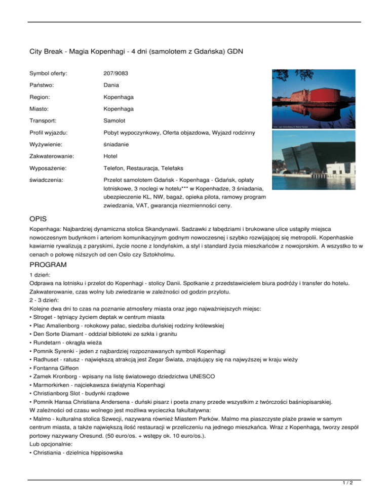 City Break - Magia Kopenhagi - 4 dni (samolotem z Gdańska) GDN Symbol oferty: 207/9083 Państwo: Dania Region: Kopenhaga Miasto: Kopenhaga Transport: Samolot Profil wyjazdu: Pobyt wypoczynkowy, Oferta objazdowa, Wyjazd rodzinny Wyżywienie: śniadanie Zakwaterowanie: Hotel Wyposażenie: Telefon, Restauracja, Telefaks świadczenia: Przelot samolotem Gdańsk - Kopenhaga - Gdańsk, opłaty lotniskowe, 3 noclegi w hotelu*** w Kopenhadze, 3 śniadania, ubezpieczenie KL, NW, bagaż, opieka pilota, ramowy program zwiedzania, VAT, gwarancja niezmienności ceny. OPIS Kopenhaga: Najbardziej dynamiczna stolica Skandynawii. Sadzawki z łabędziami i brukowane ulice ustąpiły miejsca nowoczesnym budynkom i arteriom komunikacyjnym godnym nowoczesnej i szybko rozwijającej się metropolii. Kopenhaskie kawiarnie rywalizują z paryskimi, życie nocne z londyńskim, a styl i standard życia mieszkańców z nowojorskim. A wszystko to w cenach o połowę niższych od cen Oslo czy Sztokholmu. PROGRAM 1 dzień: Odprawa na lotnisku i przelot do Kopenhagi - stolicy Danii. Spotkanie z przedstawicielem biura podróży i transfer do hotelu. Zakwaterowanie, czas wolny lub zwiedzanie w zależności od godzin przylotu. 2 - 3 dzień: Kolejne dwa dni to czas na poznanie atmosfery miasta oraz jego najważniejszych miejsc: • Stroget - tętniący życiem deptak w centrum miasta • Plac Amalienborg - rokokowy pałac, siedziba duńskiej rodziny królewskiej • Den Sorte Diamant - oddział biblioteki ze szkła i granitu • Rundetarn - okrągła wieża • Pomnik Syrenki - jeden z najbardziej rozpoznawanych symboli Kopenhagi • Radhuset - ratusz - największą atrakcją jest Zegar Świata, znajdujący się na najwyższej w kraju wieży • Fontanna Giffeon • Zamek Kronborg - wpisany na listę światowego dziedzictwa UNESCO • Marmorkirken - najciekawsza świątynia Kopenhagi • Christianborg Slot - budynki rządowe • Pomnik Hansa Christiana Andersena - duński pisarz i poeta znany przede wszystkim z twórczości baśniopisarskiej. W zależności od czasu wolnego jest możliwa wycieczka fakultatywna: • Malmo - kulturalna stolica Szwecji, nazywana również Miastem Parków. Malmo ma piaszczyste plaże prawie w samym centrum miasta, a także największą ilość restauracji w przeliczeniu na jednego mieszkańca. Wraz z Kopenhagą, tworzy zespół portowy nazywany Oresund. (50 euro/os. + wstępy ok. 10 euro/os.). Lub opcjonalnie: • Christiania - dzielnica hippisowska 1/2 • Ogrody Tivoli - park rozrywki, drugi co do wielkości rollercoaster w Europie (wstęp ok. 10 euro/os.) • Browary Carlsberg - zwiedzanie + degustacja (wstęp ok. 6 euro/os.) • Muzeum Rekordów Guinnesa - (wstęp ok. 10 euro/os.) • Muzeum Vikingów - (wstęp ok. 10 euro/os.) • Akwarium - 285 gatunków zwierząt morskich z całego świata, ponad 70 akwariów, największe mieści ok. 85 000 litrów wody (wstęp ok. 12 euro/os.) 4 dzień: Wykwaterowanie z hotelu, czas wolny w zależności od godzin wylotu, transfer na lotnisko, przelot do Polski. ZAKWATEROWANIE • HOTELE*** - położone w Kopenhadze z dogodnym dojazdem komunikacją miejską do centrum miasta. Pokoje 2 osobowe (możliwość dostawki) z łazienką. Wyżywienie: śniadania kontynentalne. CENA ZAWIERA • Przelot samolotem • Opłaty i podatki lotniskowe • 3 noclegi w hotelu • 3 śniadania • Opieka pilota • Ubezpieczenie KL, NW, bagaż • Ramowy program zwiedzania • Podatek VAT • Gwarancja niezmienności ceny CENA NIE ZWIERA • Orientacyjnego kosztu uczestnictwa w w/w programie ramowym: 90-120 euro (transfery z/na lotnisko, bilety wstępów do zwiedzanych atrakcji, bilety komunikacji miejskiej, lokalni przewodnicy). • Wycieczek fakultatywnych i propozycji pozaprogramowych INFORMACJE DODATKOWE • Kolejność zwiedzania może ulec zmianie. • Pilot nie oprowadza wewnątrz obiektów. • Wycieczki fakultatywne z pilotem są organizowane w zależności od ilości chętnych oraz wolnego czasu. • Transfery z/na lotnisko w zależności od ilości osób są realizowane busem lub komunikacją miejską i/lub podmiejską. • Przejazdy podczas zwiedzania i wycieczek fakultatywnych odbywają się komunikacją miejską i/lub podmiejską. • Spotkanie z przedstawicielem biura podróży nastąpi na lotnisku w Polsce lub po przylocie w Kopenhadze • Linia lotnicza i godziny przelotów mogą ulec zmianie. • Pierwszy i ostatni dzień w zależności od godzin przelotu może być dniem zwiedzania. • Aktualne godziny wylotów i zbiórki klient zobowiązany jest potwierdzić w swoim biurze podróży na 2 dni przed wylotem. • SINGLE - bez dopłaty (przy dokwaterowaniu do pokoju 2 lub 3 osobowego). • DZIECI TANIEJ - dotyczy dziecka do 12 lat zakwaterowanego wspólnie z 2 osobami pełnopłatnymi. ROZKŁAD LOTÓW Linie lotnicze: Wizzair TERMINY: od: 2012-05-01 do: 2012-05-04 (4 dni), miejsca: sprawdź miejsca cena od: 1740 PLN 2/2