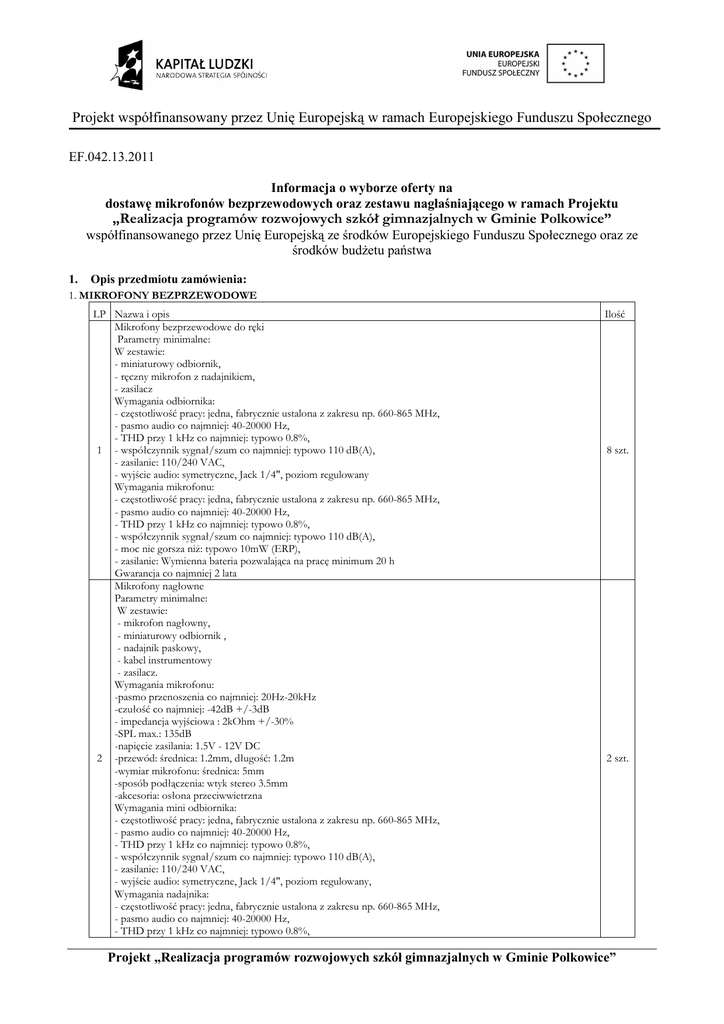 Projekt współfinansowany przez Unię Europejską w ramach Europejskiego Funduszu Społecznego EF.042.13.2011 Informacja o wyborze oferty na dostawę mikrofonów bezprzewodowych oraz zestawu nagłaśniającego w ramach Projektu „Realizacja programów rozwojowych szkół gimnazjalnych w Gminie Polkowice” współfinansowanego przez Unię Europejską ze środków Europejskiego Funduszu Społecznego oraz ze środków budŜetu państwa 1. Opis przedmiotu zamówienia: 1. MIKROFONY BEZPRZEWODOWE LP Nazwa i opis Mikrofony bezprzewodowe do ręki Parametry minimalne: W zestawie: - miniaturowy odbiornik, - ręczny mikrofon z nadajnikiem, - zasilacz Wymagania odbiornika: - częstotliwość pracy: jedna, fabrycznie ustalona z zakresu np. 660-865 MHz, - pasmo audio co najmniej: 40-20000 Hz, - THD przy 1 kHz co najmniej: typowo 0.8%, 1 - współczynnik sygnał/szum co najmniej: typowo 110 dB(A), - zasilanie: 110/240 VAC, - wyjście audio: symetryczne, Jack 1/4", poziom regulowany Wymagania mikrofonu: - częstotliwość pracy: jedna, fabrycznie ustalona z zakresu np. 660-865 MHz, - pasmo audio co najmniej: 40-20000 Hz, - THD przy 1 kHz co najmniej: typowo 0.8%, - współczynnik sygnał/szum co najmniej: typowo 110 dB(A), - moc nie gorsza niŜ: typowo 10mW (ERP), - zasilanie: Wymienna bateria pozwalająca na pracę minimum 20 h Gwarancja co najmniej 2 lata Mikrofony nagłowne Parametry minimalne: W zestawie: - mikrofon nagłowny, - miniaturowy odbiornik , - nadajnik paskowy, - kabel instrumentowy - zasilacz. Wymagania mikrofonu: -pasmo przenoszenia co najmniej: 20Hz-20kHz -czułość co najmniej: -42dB +/-3dB - impedancja wyjściowa : 2kOhm +/-30% -SPL max.: 135dB -napięcie zasilania: 1.5V - 12V DC 2 -przewód: średnica: 1.2mm, długość: 1.2m -wymiar mikrofonu: średnica: 5mm -sposób podłączenia: wtyk stereo 3.5mm -akcesoria: osłona przeciwwietrzna Wymagania mini odbiornika: - częstotliwość pracy: jedna, fabrycznie ustalona z zakresu np. 660-865 MHz, - pasmo audio co najmniej: 40-20000 Hz, - THD przy 1 kHz co najmniej: typowo 0.8%, - współczynnik sygnał/szum co najmniej: typowo 110 dB(A), - zasilanie: 110/240 VAC, - wyjście audio: symetryczne, Jack 1/4", poziom regulowany, Wymagania nadajnika: - częstotliwość pracy: jedna, fabrycznie ustalona z zakresu np. 660-865 MHz, - pasmo audio co najmniej: 40-20000 Hz, - THD przy 1 kHz co najmniej: typowo 0.8%, Ilość 8 szt. 2 szt. Projekt „Realizacja programów rozwojowych szkół gimnazjalnych w Gminie Polkowice” Projekt współfinansowany przez Unię Europejską w ramach Europejskiego Funduszu Społecznego - współczynnik sygnał/szum co najmniej: typowo 110 dB(A), - moc nie gorsza niŜ: typowo 10 mW (ERP), - zasilanie: Wymienna bateria pozwalająca na pracę minimum 20 h Gwarancja co najmniej 2 lata CPV: 32341000-5 Mikrofony 2. ZESTAW NAGŁAŚNIAJĄCY Ilość LP Nazwa i opis DwudroŜny pasywny system głośnikowy Parametry minimalne: Zakres częstotliwości co najmniej (-10dB) 38Hz - 16kHz Pasmo przenoszenia co najmniej (+/- 3dB) 50Hz - 12.5kHz Skuteczność co najmniej (1w/1m) 98dB SPL 1 Impedancja nominalna 8 Ohm 2 szt. Moc całkowita co najmniej 250W RMS Moc szczytowa co najmniej 1000W Głośnik basowy o średnicy co najmniej 15 cali oraz głośnik wysokotonowy nie mniejszy niŜ 1 cal Przyłącza co najmniej: Speakon NL4 i jack 1/4" Gwarancja co najmniej 2 lata Wzmacniacz mocy Parametry minimalne: Dwukanałowy, moc nie mniej niŜ: 2 x 450W/4Ω , 2 x 300W/8Ω, 900W/8Ω/mono, mocowanie do racka, wejścia 2 1 szt. co najmniej: symetryczne na złączach XLR, wyjścia na złączach Speakon Pasmo przenoszenia co najmniej: 20 Hz-20 kHz Gwarancja co najmniej 2 lata CPV: 32343000-9 Wzmacniacze, 32342412-3 Głośniki 2. W odpowiedzi na zapytanie ofertowe w terminie składania ofert do Zamawiającego wpłynęły oferty złoŜone przez: 1. FHUP „MM MUSIC” Michał Madura, Osiedle Pułaskiego 10F, 58-100 Busko Zdrój – Oferta złoŜona na obie części, w tym: a. Mikrofony bezprzewodowe do ręki za cenę 469,00 zł brutto za sztukę tj. 3.752,00 zł za osiem sztuk oraz Mikrofony nagłowne za cenę 530,00 zł brutto za sztukę tj. 1.060,00 zł za dwie sztuki – łącznie 4.812,00 zł brutto. b. DwudroŜny pasywny system głośnikowy za cenę 1.266,00 zł brutto za sztukę tj. 2.532,00 zł za dwie sztuki oraz Wzmacniacz mocy za cenę 1.215,00 zł brutto – łącznie 3.747,00 zł brutto. 2. DSA Artur Kamil Kaczyński Sp. J., ul. Legionowa 9/1 lok. 153, 156, 15-281 Białystok - Oferta złoŜona na obie części, w tym: a. Mikrofony bezprzewodowe do ręki za cenę 459,00 zł brutto za sztukę tj. 3.672,00 zł za osiem sztuk oraz Mikrofony nagłowne za cenę 555,00 zł brutto za sztukę tj. 1.110,00 zł za dwie sztuki – łącznie 4.782,00 zł brutto. b. DwudroŜny pasywny system głośnikowy za cenę 1.230,00 zł brutto za sztukę tj. 2.460,00 zł za dwie sztuki oraz Wzmacniacz mocy za cenę 1.310,00 zł brutto – łącznie 3.770,00 zł brutto. 3. Fabryka Dźwięku Paweł Piłat, ul. Mała Zgoda 3, 25-379 Kielce - Oferta złoŜona na obie części, w tym: a. Mikrofony bezprzewodowe do ręki za cenę 441,57 zł brutto (359 zł netto) za sztukę tj. 3.532,56 zł brutto (2.872,00 zł netto) za osiem sztuk oraz Mikrofony nagłowne za cenę 441,57 zł brutto (359 zł netto) za sztukę tj. 883,14 zł brutto (718,00 zł netto) za dwie sztuki – łącznie 4.415,70 zł brutto (3.590,00 zł netto). b. DwudroŜny pasywny system głośnikowy za cenę 1.199,25 zł brutto (975,00 zł netto) za sztukę tj. 2.398,50 zł brutto (1.950,00 zł netto) za dwie sztuki oraz Wzmacniacz mocy za cenę 1.289,04 zł brutto (1.048,00 zł netto) – łącznie 3.687,54 zł brutto (2.998,00 zł netto). 4. Przedsiębiorstwo Handlowe MAGNUS Piotr Filipowicz, 22-400 Zamość, ul. Piłsudskiego 53 - Oferta złoŜona na obie części, w tym: a. Mikrofony bezprzewodowe do ręki za cenę 435,00 zł brutto za sztukę tj. 3.480,00 zł brutto za osiem sztuk oraz Mikrofony nagło