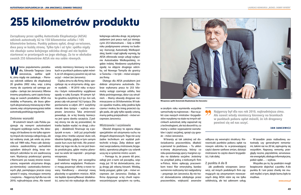 Laureaci konkursu „Biznes. dobry wybór” autostrada eksploatacja sa - Jan Jancewicz, edward targosz Zarządzany przez spółkę Autostrada Eksploatacja (AESA) odcinek autostrady A2 to 150 kilometrów asfaltu i 105 kilometrów betonu. Punkty poboru opłat, drogi serwisowe, dwa pasy w każdą stronę. Tylko tyle i aż tyle: spółka nigdy nie zbuduje sama kolejnego odcinka drogi ani nie będzie startować w przetargach na jego obsługę. Za to w obsłudze swoich 255 kilometrów AESA nie ma sobie równych. W brew popularnemu porzekadłu, Edwarda Targosza i Jana Jancewicza, szefów spółki, zima nigdy nie zaskakuje. – Pierwszy odcinek oddano do eksploatacji 20 grudnia 2002 roku, więc z zimą mamy do czynienia od samego początku – żartuje Jan Jancewicz. Wbrew innemu przysłowiu, sami często korzystają ze swoich produktów: AESA ma siedzibę w Poznaniu, ale biura głównych akcjonariuszy mieszczą się w Warszawie, więc utrzymywaną przez siebie autostradą podróżują regularnie. Zmienne warunki W ostatnich latach cała Polska pasjonuje się nowymi autostradami i drogami szybkiego ruchu. Nic dziwnego, ich budowa to nie tylko ogromny impuls do rozwoju całego kraju, ale też widomy znak, jak wiele się zmieniło od 1989 roku. Przez całe dziesięciolecia zazdrościliśmy zachodnim sąsiadom dobrych dróg, teraz niektórych odcinków to oni zazdroszczą nam. Wystarczy przekroczyć granicę z Niemcami: po naszej stronie nowoczesna, wspaniale utrzymana droga, po niemieckiej – autostrada z betonowych płyt, pamiętająca jeszcze czasy sprzed II wojny, nieustające remonty i zwężenia. – Najgorszy był dla nas rok 2010, najtrudniejsza zima. Ale nawet 48 wtedy niemieccy kierowcy na bramkach w punktach poboru opłat mówili, że ich drogowcy powinni się od nas uczyć – mówi Jan Jancewicz. Ciężka zima to dla firmy, która specjalizuje się w utrzymaniu dróg, spore wydatki. – W 2010 roku w styczniu i lutym notowaliśmy wyjątkowe opady w całej Europie. W samym tylko grudniu zużyliśmy 6,5 tys. ton soli, przez cały rok ponad 16,5 tysiąca. Dla porównania w całym 2011 zużyliśmy niecałe dwa tysiące – wylicza wiceprezes Jancewicz. Taka zmienność powoduje, że w tej branży konieczna jest spora dawka szczęścia. Z jednej strony nie da się przewidzieć, ile trzeba będzie wydać na drogi, z drugiej – działalność finansuje się z pożyczek w euro. – Jeśli już przychodzi sroga zima i trzeba używać dużo soli, idealnie byłoby, gdyby w tym samym czasie kurs euro był niski. Ale przewidzieć się tego nie da, to nie jest branża produkcyjna, gdzie można planować na wiele lat naprzód – przyznaje wiceprezes. Działalność firmy jest szczególna pod wieloma względami. Producenci mogą poszerzyć ofertę o nowe towary. Handlowcy – otworzyć nową placówkę w sąsiednim mieście. AESA nie będzie dywersyfikować działalności, sama też nie wybuduje dla siebie kolejnego odcinka drogi. Jej jedynym zadaniem jest praca nad już istniejącymi 253 kilometrami. – Gdy w 2000 roku podpisywano umowy na budowę i koncesję Autostrady Wielkopolskiej, banki i rząd zgłosiły wymóg, by AESA oferowała swoje usługi wyłącznie Autostradzie Wielkopolskiej, nigdzie indziej. Niedawno uzyskaliśmy zgodę na objęcie drugiego odcinka, od Nowego Tomyśla do granicy w Świecku – i to tyle – mówi wiceprezes firmy. Dlatego dla AESA produktem jest dobrze utrzymana autostrada. Dobrze wykonana praca to 253 kilometry wstęgi czarnego asfaltu, bez błota pośniegowego, dziur czy utrudnień. – Mamy obwody drogowe rozmieszczone co 50 kilometrów. W trakcie opadów trudno, żeby jezdnia była czarna i mokra, bo śnieg przecież ciągle pada, ale gdy tylko opady ustaną, mamy pełną przejezdność – mówi wiceprezes Jancewicz. Mistrzowie i uczniowie Obwód drogowy to zgrana ekipa specjalistów od utrzymania ruchu na drogach ekspresowych. Tego nie uczy żadne technikum ani wydział politechniki w kraju. Żeby dobrze spełniać swoje zadania, mistrzowie, brygadziści, operatorzy pługów czy solarek uczą się w systemie mistrz–uczeń. – Pomaga to, że prawie 60 proc. załogi jest z nami od początku, więc mają już 10 lat doświadczenia, znają drogę jak własną kieszeń. Wiedzą, kiedy posypać, gdzie i jak – mówi wiceprezes Jan Jancewicz. Dodaje, że firma dysponuje w tej chwili najnowocześniejszym sprzętem na rynku, FOT. aesa 255 kilometrów produktu Wiceprezes spółki Autostrada Eksploatacja Jan Jancewicz w zeszłym roku wymieniła wszystkie samochody na najnowsze. – Raz na jakiś czas naszych mistrzów i brygadzistów wysyłamy na staże na innych odcinkach autostrad, żeby zapoznali się z technologiami, ale też docenili to, co mamy u siebie: wyposażenie warsztatów i części socjalnej, sprzęt czy garaże – mówi Jancewicz. W branży aż tak zależnej od doświadczenia pracowników, dbałość o personel to podstawa. – Tu ukłon w stronę akcjonariuszy, którzy co roku pozostawiają spory margines zysku na działania socjalne. Jesteśmy na przykład jedną z nielicznych firm w Polsce, które opłacają pracownikom trzeci filar emerytalny, bardzo sumiennie rozliczamy też nadgodziny – przyznaje Jan Jancewicz. By nie tracić doświadczenia zdobytego przez pracowników, większość awansów Najgorszy był dla nas rok 2010, najtrudniejsza zima. Ale nawet wtedy niemieccy kierowcy na bramkach w punktach poboru opłat mówili, że ich drogowcy powinni się od nas uczyć. Jan Jancewicz odbywa się wewnątrz struktury. Kierowniczki punktów poboru opłat na nowym odcinku to w przeważającej części dawne szefowe zmian, dzisiejsi mistrzowie to często dawni brygadziści, i tak dalej. Z punktu A do B Jak podkreśla wiceprezes Jancewicz, od innych podobnych firm zajmujących się utrzymaniem nowoczesnych dróg AESA różni się nie tylko solidnością, ale też zakresem usług. – W zasadzie poza rozbudową autostrady czy generalnymi remontami, 