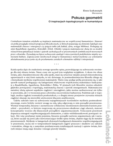 Ewa Łukaszyk Warszawa Pokusa geometrii O inspiracjach topologicznych w humanistyce Centralnym tematem artykułu są inspiracje matematyczne we współczesnej humanistyce. Stanowi on próbę przeglądu różnych propozycji filozoficznych, w których pojawiają się elementy topologii oraz matematyki chaosu i emergencji czy pojęcia takie jak fraktal, sfera, wstęga Möbiusa. Posługują się nimi Baudrillard, Agamben, Sloterdijk i Žižek. Obiekty i pojęcia matematyczne służą im za modele różnych konceptualizacji świata i zjawisk zachodzących w przestrzeniach symbolicznych tworzonych przez człowieka. Pozwalają na lepsze uchwycenie analogii i nieoczywistych podobieństw między wytworami kultury. Zapożyczenie nieobecnych dotąd w humanistyce metod myślenia czy schematów abstrahowania przyczynia się do przełamania zastałych schematów refleksji i interpretacji. *** Lokalność 9 Tematy z Szewskiej Każda epoka dąży do znalezienia nowego sposobu opisu, pozwalającego na uchwycenie swoistego dla niej obrazu świata. Nasze czasy nie są pod tym względem wyjątkiem. A skoro ów obraz świata, jako charakterystyczny dla całej epoki, musi się sytuować niejako ponad różnorodnością uprawianych w niej form namysłu, to nic dziwnego, że postmodernistyczna filozofia zbiega się z kierunkami myślenia współczesnej matematyki. Warto więc podjąć próbę przyjrzenia się, w jaki sposób namysł posługujący się kategoriami właściwymi współczesnej matematyce funkcjonuje u Baudrillarda, Agambena, Sloterdijka i Žižka. W pismach tych filozofów można odnaleźć głębokie powiązania z topologią, matematyką chaosu i zjawisk emergentnych. Matematyczne metafory służą opisowi aspektów ciągłości i nieciągłości, jakie można zaobserwować nie tylko w przyrodzie, ale i w tworzonej przez człowieka rzeczywistości kulturowej. Podobnie jak w topologii, analiza ciągłości rozmaitych przekształceń, a z drugiej strony przejawów zrywania różnych ciągłości okazuje się niezwykle użytecznym kluczem analitycznym. Gdyby zależało nam na uchwyceniu najogólniejszych wyróżników myślenia postmodernistycznego, warto byłoby zwrócić uwagę na rolę, jaką odgrywają w nim porządki przestrzenne. Wymiar temporalny, linearny i asymetryczny (obdarzony niezmiennym ukierunkowaniem przeszłość – przyszłość), w którym rozgrywają się przyczynowo-skutkowe ciągi zdarzeń, stanowi konceptualny wzorzec dla klasycznych porządków argumentacyjnych. Tymczasem przestrzeń dopuszcza mnogość współwystępujących elementów, a także wielokierunkowość powiązań i relacji. Aby więc przełamać mniej pojemne, linearne porządki zarówno argumentacji, jak i narracji, które zaczęły się jawić jako niewystarczające środki opisu świata, chętnie sięga się do metafor przestrzennych. Myślenie w kategoriach złożonych konfiguracji elementów współwystępujących w przestrzeni, raczej niż w temporalnych kategoriach ciągów przyczyn i skutków czy założeń i wniosków, zbiega się z zamysłem przełamywania totalizujących narracji i opisów świata, których miejsce mają zająć doraźne i mnogie prawdy lokalne. Tematy z Szewskiej Lokalność Pojęcie lokalności rysuje się więc jako jeden z centralnych problemów współczesnej humanistyki. Często rzecz jasna przewija się w rozumieniu nieścisłym, na przykład jako rodzaj rozmytego określenia względnej skali zjawisk, z domniemaniem, iż ta skala przekłada się w taki czy inny sposób na charakter i przebieg określonych procesów kulturowych. W tym znaczeniu mówi się na przykład o lokalności jako o wymiarze przeciwstawianym tendencjom globalizacyjnym, ustanawiającym charakterystyczne wzorce wspólnotowości, wytwarzania czy wymiany. Przeczuwając płynność przejścia między kategorią lokalności a globalnością, niektórzy próbują mówić o glokalności. Wszystkie te pojęcia mają jednak właściwie intuicyjny charakter. Nic więc dziwnego, że pojawia się swego rodzaju tęsknota za ścisłością. Współczesna humanistyka szuka inspiracji w dziedzinie zwykle sytuowanej na jej antypodach, matematyce, zwłaszcza gdy chodzi o namysł nad kategoriami przestrzennymi. Szczególna rola przypada tu w udziale względnie nowym, rozwijającym się w ciągu XX wieku gałęziom: topologii oraz matematyce emergencji, szukającej sposobów ścisłego opisu zjawisk, w których z chaosu wyłaniają się zdumiewające rodzaje uporządkowania. W świetle szeroko dyskutowanej prowokacji Alana Sokala z 1996 roku mogłoby się wydawać, że drogi filozofii postmodernistycznej i przyrodoznawstwa rozeszły się na zawsze, a dawna idea „trzeciej kultury” C.P. Snowa miała ostatecznie pozostać jedną z XX-wiecznych utopii. Tym bardziej zaskakuje więc to, że dziedzina tak z pozoru hermetyczna jak topologia jest z uporem eksplorowana przez szukających w niej inspiracji myślicieli. Obiekty topologiczne, takie jak sfera czy wstęga Möbiusa, stają się istotnymi narzędziami myślenia w próbie sformułowania „filozofii globalności” przez Petera Sloterdijka czy w wielu inspirowanych Lacanem pismach Slavoja Žižka. Jean Baudrillard sięga z kolei po całkiem w matematyce świeże, bo sformułowane zaledwie kilkadziesiąt lat temu pojęcie fraktala1, aby zastosować je jako model służący zrozumieniu mechanizmów funkcjonowania porządków kulturowych w skali lokalnej i globalnej. Giorgio Agamben sięga po pojęcia i znaki matematyczne, aby przedstawić swoją koncepcję „wspólnoty, która nadchodzi”. Tak więc zarówno symbole, jak i matematyczne metafory przewijają się w humanistyce współczesnej coraz częściej i przypuszczalnie nie są wyłącznie ozdobnikami. Podobnie też czymś więcej niż intelektualną zagrywką jest pytanie postawione przez Stanisława Krajewskiego: czy matematyka jest nauką humanistyczną?2. Co prawda chodzi tu o książkę napisaną wciąż jeszcze p