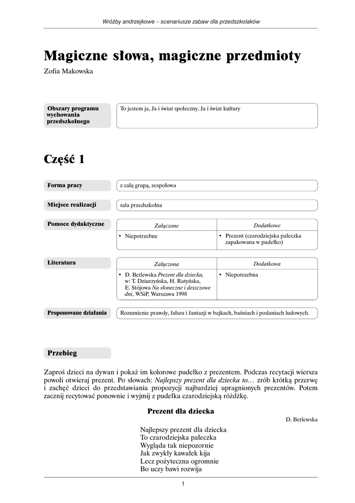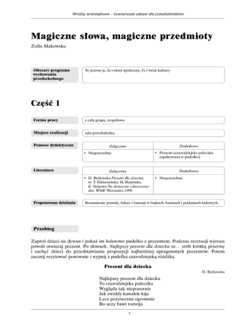 Wró˝by andrzejkowe – scenariusze zabaw dla przedszkolaków Magiczne słowa, magiczne przedmioty Zofia Makowska Obszary programu wychowania przedszkolnego To jestem ja, Ja i świat społeczny, Ja i świat kultury Część 1 Forma pracy z całą grupą, zespołowa Miejsce realizacji sala przedszkolna Pomoce dydaktyczne Dodatkowe Załączone • Prezent (czarodziejska pałeczka zapakowana w pudełko) • Niepotrzebne Literatura Dodatkowa Załączona • D. Betlewska Prezent dla dziecka, w: T. Dziurzyńska, H. Ratyńska, E. Stójowa Na słoneczne i deszczowe dni, WSiP, Warszawa 1998 Proponowane działania • Niepotrzebna Rozumienie prawdy, fałszu i fantazji w bajkach, baśniach i podaniach ludowych. Przebieg Zaproś dzieci na dywan i pokaż im kolorowe pudełko z prezentem. Podczas recytacji wiersza powoli otwieraj prezent. Po słowach: Najlepszy prezent dla dziecka to… zrób krótką przerwę i zachęć dzieci do przedstawiania propozycji najbardziej upragnionych prezentów. Potem zacznij recytować ponownie i wyjmij z pudełka czarodziejską różdżkę. Prezent dla dziecka D. Betlewska Najlepszy prezent dla dziecka To czarodziejska pałeczka Wygląda tak niepozornie Jak zwykły kawałek kija Lecz pożyteczna ogromnie Bo uczy bawi rozwija 1 Wró˝by andrzejkowe – scenariusze zabaw dla przedszkolaków Gdy czarodziejską pałeczkę Kupi mi wreszcie mama To górę innych zabawek Już wyczaruję sama. Zaproś dzieci do rozmowy. Spróbujcie wspólnie odpowiedzieć na pytanie: Czy czary przynoszą szczęście, czy nie? Powiedz dzieciom, że w swoich wypowiedziach mogą przypomnieć przykłady z bajek, np.: zaczarowana kareta dla Kopciuszka, zatrute jabłko z bajki o królewnie Śnieżce. Zaproponuj zabawę w sąd nad czarami i magią. Podziel grupę na dwa zespoły i wyjaśnij, na czym będzie polegała dyskusja. Poproś, aby dzieci – obrońcy czarów – wymyśliły jak najwięcej argumentów za tym, że czary są potrzebne. Zespół stanowiący przeciwników czarów zachęć do wyszukiwania wszystkich złych uczynków spowodowanych przez magię. Po wysłuchaniu stron podkreśl fakt, że czary, magia to elementy fantazji. Można je spotkać w bajkach, baśniach, podaniach ludowych. Zaproponuj dzieciom podróż po krainie fantazji, tradycji i zwyczajów, magii i czarodziejstwa. Część 2 Forma pracy z całą grupą, indywidualna Miejsce realizacji sala przedszkolna Pomoce dydaktyczne Dodatkowe Załączone • Gazety, krepina, klej, taśma klejąca, klej z brokatem, ozdoby, wstążki itp., papier kolorowy, nożyczki, gałązka wiśni, wazon, nieprzezroczysta chusta lub kawałek materiału, dziwne przedmioty, papier, flamastry, CD z tajemniczą muzyką • Niepotrzebne Proponowane działania 1. Projektowanie i wykonanie czarodziejskiej różczki – wykorzystanie różnorodnych materiałów plastycznych. 2. Trening twórczego myślenia: a) tworzenie nowych słów, b) wymyślanie przeznaczenia dla przedmiotów. Uwaga Wcześniej wyszukaj i przygotuj dziwne przedmioty, których nazw dzieci nie znają. Mogą to być fragmenty jakichś narzędzi, sprężyny, kółka zębate ze starego zegara itp. Zawieś je na gałązce wiśni i zakryj. Przebieg Pokaż dzieciom przygotowane na stolikach materiały plastyczne. Zaproponuj wykonanie 2 Wró˝by andrzejkowe – scenariusze zabaw dla przedszkolaków czarodziejskiej różdżki. Wyjaśnij i zaprezentuj, w jaki sposób można wykonać długą, cienką różdżkę, Pokaż, jak ścisło trzeba zrolować gazetę. Zaproponuj przedszkolakom, by ozdobiły pałeczkę według własnego pomysłu, wykorzystując zgromadzone materiały. Po zakończeniu pracy zaproś dzieci na dywan i poproś, aby pomogły Ci wyczarować niespodziankę za pomocą swoich czarodziejskich pałeczek. Podnieście pałeczki do góry i wypowiedzcie zaklęcie nad tajemniczym przedmiotem ukrytym pod chustą np.: Czary mary garnek stary, Niech się spełnią nasze czary. lub Czary mary, czary mary, Tu magiczne będą dary. Po wypowiedzeniu zaklęć poproś jedno z dzieci, aby ostrożnie zdjęło chustę. W tej magicznej chwili może Wam towarzyszyć tajemnicza muzyka. Opowiedz dzieciom o wróżbie z wiśniowych gałązek. Głosi ona, że jeśli gałązki zakwitną na Boże Narodzenie, to wszystkie pomyślane życzenia się spełnią. Zachęć przedszkolaki do wymyślania swoich życzeń. Następnie obejrzyjcie dziwne przedmioty zawieszone na gałązkach wiśni. Poproś dzieci, aby w małych zespołach wymyśliły przeznaczenie i nazwę dla wylosowanego przedmiotu. Wspólnie dokonajcie prezentacji, której obiektem będzie dziwna rzecz. Możecie też sporządzić tabliczki z nowymi nazwami dziwnych przedmiotów. Część 3 Forma pracy z całą grupą Miejsce realizacji sala przedszkolna Pomoce dydaktyczne Dodatkowe Załączone • Wykonane przez dzieci czarodziejskie pałeczki • Niepotrzebne Proponowane działania Zabawa ruchowa „Różdżka” – zdobywanie orientacji w otoczeniu, szybkie reagowanie na sygnały umowne. Przebieg Zaproponuj dzieciom zabawę „Różdżka”. Poproś, aby usiadły w kole, w niewielkiej odległości jedno od drugiego. Zaproponuj, by magiczne różdżki, skierowane do środka koła, leżały na podłodze przed dziećmi. Wyjaśnij, na czym będzie polegała zabawa: wybrana osoba – czarodziej – spaceruje wkoło. Po chwili dotyka różdżką kolegę i biegnie dookoła, by zająć jego miejsce. Dotknięte dziecko – zaczarowane – chwyta swoją różdżkę, podnosi się i biegnie za czarodziejem, by go dogonić, zanim ten usiądzie na jego miejscu. Jeżeli czarodziej dobiegnie do wolnego miejsca, natychmiast je zajmuje, a wybrane dziecko staje się czarodziejem. Jeśli wybrany kolega zdoła dogonić czarodzieja, ten musi czarować jeszcze raz. Pierwsza rozpocznij zabawę. 3