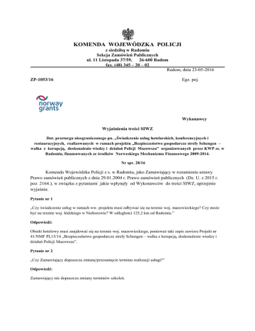 KOMENDA WOJEWÓDZKA POLICJI z siedzibą w Radomiu Sekcja Zamówień Publicznych ul. 11 Listopada 37/59, 26-600 Radom fax. (48) 345 – 20 – 02 Radom, dnia 23-05-2016 ZP-1053/16 Egz. poj. Wykonawcy Wyjaśnienia treści SIWZ Dot. przetargu nieograniczonego pn. „Świadczenie usług hotelarskich, konferencyjnych i restauracyjnych, realizowanych w ramach projektu „Bezpieczeństwo gospodarcze strefy Schengen – walka z korupcją, doskonalenie wiedzy i działań Policji Mazowsza” organizowanych przez KWP zs. w Radomiu, finansowanych ze środków Norweskiego Mechanizmu Finansowego 2009-2014. Nr spr. 28/16 Komenda Wojewódzka Policji z s. w Radomiu, jako Zamawiający w rozumieniu ustawy Prawo zamówień publicznych z dnia 29.01.2004 r. Prawo zamówień publicznych (Dz. U. z 2015 r. poz. 2164.), w związku z pytaniami jakie wpłynęły od Wykonawców do treści SIWZ, uprzejmie wyjaśnia: Pytanie nr 1 „Czy świadczenie usług w ramach ww. projektu musi odbywać się na terenie woj. mazowieckiego? Czy moŜe być na terenie woj. łódzkiego w Nieborowie? W odległości 125,2 km od Radomia.” Odpowiedź: Obiekt hotelowy musi znajdować się na terenie woj. mazowieckiego, poniewaŜ taki zapis zawiera Projekt nr 41/NMF PL15/14 „Bezpieczeństwo gospodarcze strefy Schengen – walka z korupcją, doskonalenie wiedzy i działań Policji Mazowsza”. Pytanie nr 2 „Czy Zamawiający dopuszcza zmianę/przesunięcie terminu realizacji usługi?” Odpowiedź: Zamawiający nie dopuszcza zmiany terminów szkoleń. Pytanie nr 3 „Czy zapis: Zamknięcie dostępu dla osób postronnych do obiektów wykorzystywanych podczas Szkolenia oznacza, Ŝe Zamawiający wymaga zapewnienia hotelu na wyłączność, czy tylko pomieszczeń /sala konferencyjna, miejsce spoŜywania posiłków/?” Odpowiedź: Zamknięcie dostępu dla osób postronnych do obiektów wykorzystywanych podczas szkolenia oznacza zamknięcie dostępu do strefy szkoleniowej, czyli sali konferencyjnej, restauracji (podczas trwania szkolenia) oraz części hotelowej, w której znajdują się pokoje uczestników szkolenia. Pytanie nr 4 „Zamawiający wymaga części serwowanej kolacji, gdzie część serwowana do stołów ma się składać między innymi z:zupy: do wyboru dwa rodzaje, dania drugiego: do wyboru dania – 2 mięsne /1 rybne- czy Zamawiający poda wcześniej komu jakie danie zaserwować ??? czy moŜe ta część kolacji ma być w formie bufetu? w stole /wtedy nie będzie to część serwowana/ . Bardzo proszę o doprecyzowanie określenia „część serwowana do stołów”” Odpowiedź: Kolacja bankietowa (serwowano-bufetowa) powinna być zgodna z zamieszczonym opisem w opisie przedmiotu zamówienia, czyli powinny być zapewnione miejsca siedzące przy stołach dla wszystkich uczestników jednocześnie w pomieszczeniu z wyraźnie wyodrębnionym obszarem dla uczestników seminarium, w tle oprawa muzyczna w wersji elektronicznej. Część serwowana kolacji powinna zawierać do wyboru dwa rodzaje zup oraz do wyboru drugie danie w postaci mięsnej lub rybnej (z dodatkiem skrobiowym i surówkę) oraz deser. Część bufetowa kolacji powinna trwać min. 4 godz. i winna być uzupełniana na bieŜąco. Pytanie 5 „Zgodnie z uzasadnieniem Uchwały Sądu NajwyŜszego z dn. 20.11.2011 (Sygn. akt III CZP52/11) Zamawiający ma obowiązek zweryfikować zastosowanie przez Wykonawców prawidłowej stawki VAT, która jest jednym z elementów cenotwórczych. Wynika to z konieczności zachowania zasady uczciwej konkurencji i równego traktowania Wykonawców. W związku z powyŜszym, proszę o wyjaśnienie, jaka stawka VAT według Zamawiającego zostanie uznana za prawidłową. Czy według Zamawiającego przedmiotem zamówienia jest usługa kompleksowa, a w sytuacji, gdy kilka świadczeń obejmuje z ekonomicznego punktu widzenia jedną usługę to nie powinna być ona sztucznie dzielona dla celów podatkowych – zgodnie z wyrokiem Europejskiego Trybunału Sprawiedliwości w sprawie C-349/96, a co za tym idzie wartość całej usługi powinna zawierać podatek VAT w wysokości 23% Podobnie wskazuje interpretacja Dyrektora Izby Skarbowej w Poznaniu z dnia 24 września 2014, sygn. ILPP2/443-651/14-4/MR zgodnie z którą w przypadku, gdy usługa składa się z róŜnych świadczeń, których realizacja prowadzi do jednego celu powinna zostać uznana za kompleksową? Czy wg Zamawiającego przedmiot zamówienia stanowią usługi turystyczne i w związku z tym Wykonawcy powinni zastosować procedurę VAT marŜy? Skoro Zamawiający daje moŜliwość realizacji usługi w odległości do 130 km do Radomia, dlaczego nie dopuszcza obiektów z sąsiadujących województw mieszczących się w tej odległości? Co dokładnie Zamawiający rozumie przez zamknięcie dostępu dla osób postronnych do obiektów wykorzystywanych podczas szkolenia? Czy Zamawiający ma na myśli cały hotel, czy tylko części wykorzystywane przez Zamawiającego? JeŜeli tak to które? Sala szkoleniowa, pokoje, restauracja? Czy Zamawiający moŜe dopuścić składanie ofert częściowych, lub róŜne miejsca realizacji zadania 1 i 2. ” Odpowiedź: W ocenie Zamawiającego przedmiotem zamówienia jest usługa organizacji konferencji, która powinna być uznana za jedno kompleksowe świadczenie opodatkowane stawką podstawową. Obiekt hotelowy musi znajdować się na terenie woj. mazowieckiego, poniewaŜ taki zapis zawiera Projekt nr 41/NMF PL15/14 „Bezpieczeństwo gospodarcze strefy Schengen – walka z korupcją, doskonalenie wiedzy i działań Policji Mazowsza”. Zamknięcie dostępu dla osób postronnych do obiektów wykorzystywanych podczas szkolenia oznacza zamknięcie dostępu do strefy szkoleniowej, czyli sali konferencyjnej, restauracji (podczas trwania szkolenia) oraz części hotelowej, w której znajdują się pokoje uczestników szkolenia. Zamawiający w Specyfikacji Istotnych Warunków Zamówienia dopuścił składanie ofert częściowych. Pytanie nr 6 „W nawiązaniu 