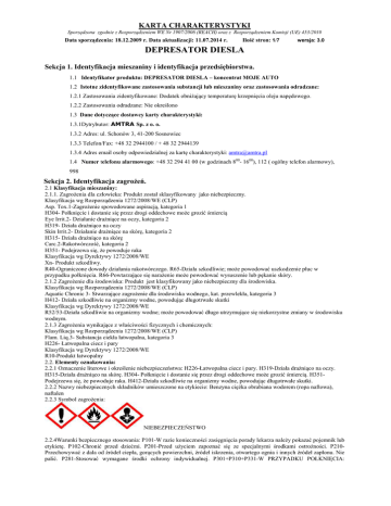 KARTA CHARAKTERYSTYKI Sporządzona zgodnie z Rozporządzeniem WE Nr 1907/2006 (REACH) oraz z Rozporządzeniem Komisji (UE) 453/2010 Data sporządzenia: 18.12.2009 r. Data aktualizacji: 11.07.2014 r. Ilość stron: 1/7 wersja: 3.0 DEPRESATOR DIESLA Sekcja 1. Identyfikacja mieszaniny i identyfikacja przedsiębiorstwa. 1.1 Identyfikator produktu: DEPRESATOR DIESLA – koncentrat MOJE AUTO 1.2 Istotne zidentyfikowane zastosowania substancji lub mieszaniny oraz zastosowania odradzane: 1.2.1 Zastosowania zidentyfikowane: Dodatek obniżający temperaturę krzepnięcia oleju napędowego. 1.2.2 Zastosowania odradzane: Nie określono 1.3 Dane dotyczące dostawcy karty charakterystyki: 1.3.1Dytrybutor: AMTRA Sp. z o. o. 1.3.2 Adres: ul. Schonów 3, 41-200 Sosnowiec 1.3.3 Telefon/Fax: +48 32 2944100 / + 48 32 2944139 1.3.4 Adres email osoby odpowiedzialnej za kartę charakterystyki: [email protected] 1.4 Numer telefonu alarmowego: +48 32 294 41 00 (w godzinach 800- 1600), 112 ( ogólny telefon alarmowy), 998 Sekcja 2. Identyfikacja zagrożeń. 2.1 Klasyfikacja mieszaniny: 2.1.1. Zagrożenia dla człowieka: Produkt został sklasyfikowany jako niebezpieczny. Klasyfikacja wg Rozporządzenia 1272/2008/WE (CLP) Asp. Tox.1-Zagrożenie spowodowane aspiracją, kategoria 1 H304- Połknięcie i dostanie się przez drogi oddechowe może grozić śmiercią Eye Irrit.2- Działanie drażniące na oczy, kategoria 2 H319- Działa drażniąco na oczy Skin Irrit.2- Działanie drażniące na skórę, kategoria 2 H315- Działa drażniąco na skórę Carc.2-Rakotwórczość, kategoria 2 H351- Podejrzewa się, że powoduje raka Klasyfikacja wg Dyrektywy 1272/2008/WE Xn- Produkt szkodliwy. R40-Ograniczone dowody działania rakotwórczego. R65-Działa szkodliwie; może powodować uszkodzenie płuc w przypadku połknięcia. R66-Powtarzające się narażenie może powodować wysuszenie lub pękanie skóry. 2.1.2 Zagrożenie dla środowiska: Produkt jest klasyfikowany jako niebezpieczny dla środowiska. Klasyfikacja wg Rozporządzenia 1272/2008/WE (CLP) Aquatic Chronic 3- Stwarzające zagrożenie dla środowiska wodnego, kat. przewlekła, kategoria 3 H412- Działa szkodliwie na organizmy wodne, powodując długotrwałe skutki Klasyfikacja wg Dyrektywy 1272/2008/WE R52/53-Działa szkodliwie na organizmy wodne; może powodować długo utrzymujące się niekorzystne zmiany w środowisku wodnym. 2.1.3 Zagrożenia wynikające z właściwości fizycznych i chemicznych: Klasyfikacja wg Rozporządzenia 1272/2008/WE (CLP) Flam. Liq.3- Substancja ciekła łatwopalna, kategoria 3 H226- Łatwopalna ciecz i pary Klasyfikacja wg Dyrektywy 1272/2008/WE R10-Produkt łatwopalny 2.2. Elementy oznakowania: 2.2.1 Oznaczenie literowe i określenie niebezpieczeństwa: H226-Łatwopalna ciecz i pary. H319-Działa drażniąco na oczy. H315-Działa drażniąco na skórę. H304- Połknięcie i dostanie się przez drogi oddechowe może grozić śmiercią. H351Podejrzewa się, że powoduje raka. H412-Działa szkodliwie na organizmy wodne, powodując długotrwałe skutki. 2.2.2 Nazwy niebezpiecznych składników umieszczone na etykiecie: Benzyna ciężka obrabiana wodorem (ropa naftowa), naftalen 2.2.3 Symbol zagrożenia: NIEBEZPIECZEŃSTWO 2.2.4Warunki bezpiecznego stosowania: P101-W razie konieczności zasięgnięcia porady lekarza należy pokazać pojemnik lub etykietę. P102-Chronić przed dziećmi. P201-Przed użyciem zapoznać się ze specjalnymi środkami ostrożności. P210Przechowywać z dala od źródeł ciepła, gorących powierzchni, źródeł iskrzenia, otwartego ognia i innych źródeł zapłonu. Nie palić. P281-Stosować wymagane środki ochrony indywidualnej. P301+P310+P331-W PRZYPADKU POŁKNIĘCIA: KARTA CHARAKTERYSTYKI Sporządzona zgodnie z Rozporządzeniem WE Nr 1907/2006 (REACH) oraz z Rozporządzeniem Komisji (UE) 453/2010 Data sporządzenia: 18.12.2009 r. Data aktualizacji: 11.07.2014 r. Ilość stron: 2/7 wersja: 3.0 DEPRESATOR DIESLA Natychmiast skontaktować się z OŚRODKIEM ZATRUĆ/ lekarzem. NIE wywoływać wymiotów. P308+P313-W przypadku narażenia lub styczności: Zasięgnąć porady/ zgłosić się pod opiekę lekarza. P501-Zawartość/ pojemnik usuwać w bezpieczny sposób 2.2.4Dodatkowe informacje: Brak danych 2.3 Inne zagrożenia: Brak informacji na temat spełniania kryteriów PBT lub vPvB zgodnie z załącznikiem XIII Rozporządzenia Komisji (UE) Nr 253/2011 z dnia 15 marca 2011r. Badania nie zostały przeprowadzone. Sekcja3.Skład i informacje o składnikach 3.1 Substancje: Nie dotyczy 3.2 Mieszaniny: Nazwa chemiczna składnika Zakres stężeń Numer CAS Numer WE Klasyfikacja wg 67/548/EWG Klasyfikacja wg 1272/2008/WE Benzyna ciężka obrabiana wodorem (ropa naftowa) <100% 64742-48-9 265-150-3 R10, Xn, R65, R66 Flam. Liq.3, H226 Asp. Tox. 1, H304 Solwent nafta (ropa naftowa) ciężkie aromatyczne 10%-15% 64742-94-5 265-198-5 Xi, R36/38 Xn, R65 N, R51/53 Naftalen < 2,5% 91-20-3 202-049-5 Xn, R22 Carc. Cat.3, R40 N, R50/53 1,2,4-trimetylobenzen <1% 95-63-6 202-436-9 R10 Xn, R20 Xi, R36/37/38 N, R51/53 Eye Irrit.2, H 319 Skin Irrit.2, H315 Aquatic Chronic 2, H411 Asp. Tox.1, H304 Carc.2, H351 Acute Tox.4, H302 Aquatic Acute 1, H400 Aquatic Chronic 1, H410 Flam. Liq.3, H226 Acute Tox.4, H332 Eye Irrit.2, H319 STOT SE.3, H335 Skin Irrit.2, H315 Aquatic Chronic 2, H411 SEKCJA 4. ŚRODKI PIERWSZEJ POMOCY 4.1 Opis środków pierwszej pomocy: 4.1.1 Połknięcie: W razie połknięcia przepłukać jamę ustną, wyjąć protezy dentystyczne jeśli są. Nie wywoływać wymiotów. Przetransportować do najbliższej placówki medycznej celem podjęcia leczenia. Pokazać opakowanie lub etykietę. Jeśli wystąpią spontanicznie wymioty, trzymać głowę poniżej bioder. 4.1.2. Zatrucie inhalacyjne: Wynieść poszkodowanego z miejsca narażenia i zapewnić dostęp świeżego powietrza oraz spokój i odpoczynek. W przypadku dolegliwości (kaszel, wymioty, zawroty głowy, świszczący oddech) zapewnić pomoc lekarską. Nieprzytomnego 