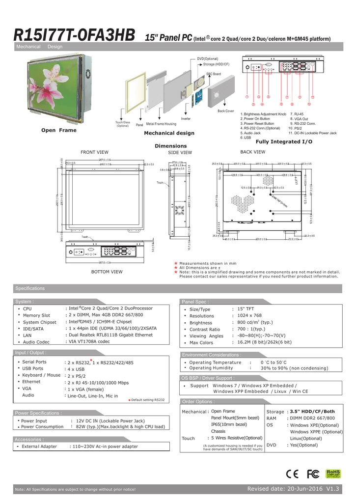 R15I77T-OFA3HB 15" Panel PC (Intel R core 2 Quad/core 2 Duo/celeron M+GM45 platform) Design Mechanical MODEL #: R15I77T-OFA1 Storage (HDD/CF) USB USB USB USB RJ45 RJ45 RS232 VR VGA RS232 RS232 RS232 PS2 DC IN PS2 Audio SBC Board 1 Back Cover Touch/Glass (Optional) Panel Metal Frame Housing Open Frame Mechanical design USB USB USB USB RJ45 RJ45 VGA RS232 RS232 RS232 PS2 11 10 Fully Integrated I/O BACK VIEW SIDE VIEW RS232 VR 8 1. Brightness Adjustment Knob 7. RJ-45 2. Power On Button 8. VGA Out 3. Power Reset Button 9. RS-232 Conn. 4. RS-232 Conn.(Optional) 10. PS/2 5. Audio Jack 11. DC-IN Lockable Power Jack 6. USB Dimensions FRONT VIEW 9 7 6 4 2 Inverter 5 3 DC IN PS2 Audio Measurements shown in mm * All Dimensions are ± * Note: is a simplified drawing and some components are not marked in detail. * Pleasethis contact our sales representative if you need further product information. BOTTOM VIEW Specifications System : Panel Spec : CPU R : Intel Core 2 Quad/Core 2 DuoProcessor Size/Type : 15" TFT Memory Slot : 2 x DIMM, Max 4GB DDR2 667/800 Resolutions : 1024 x 768 System Chipset : Intel RGM45 / ICH9M-E Chipset Brightness 2 : 800 cd/m (typ.) IDE/SATA : 1 x 44pin IDE (UDMA 33/66/100)/2XSATA Contrast Ratio : 700 : 1(typ.) LAN : Dual Realtek RTL8111B Gigabit Ethernet Viewing Angles : -80~80(H);-70~70(V) Audio Codec : VIA VT1708A codec Max Colors : 16.2M (8 bit)/262k(6 bit) Input / Output : Environment Considerations : Serial Ports : 2 x RS232, 1 x RS232/422/485 USB Ports : 4 x USB Keyboard / Mouse : 2 x PS/2 Ethernet VGA Audio : 2 x RJ 45-10/100/1000 Mbps : 1 x VGA (female) : Line-Out, Line-In, Mic in Power Specifications : : 12V DC IN (Lockable Power Jack) : 82W (typ.)(Max.backlight & high CPU load) : : 0 ˚C to 50 ˚C 30% to 90% (non condensing) OS BSP / Driver Support : Support Default setting:RS232 Power Input Power Consumption Operating Temperature Operating Humidity Windows 7 / Windows XP Embedded / Windows XPP Embbeded / Lixux / Win CE Order Options : Mechanical : Open Frame Panel Mount(5mm bezel) IP65(10mm bezel) Storage : 3.5" HDD/CF/Both RAM : DIMM DDR2 667/800 OS Chassis Touch Accessori es : Externa l Adapter : 110~230V Ac-in power adapter Note: All Specifications are subject to change without prior notice! : Windows XPE(Optional) Windows XPPE (Optional) : 5 Wires Resistive(Optional) (A customized housing is needed if you have demands of SAW/IR/IT/SC touch) Linux(Optional) DVD : Yes(Optional) Revised date: 20-Jun-2016 V1.3
