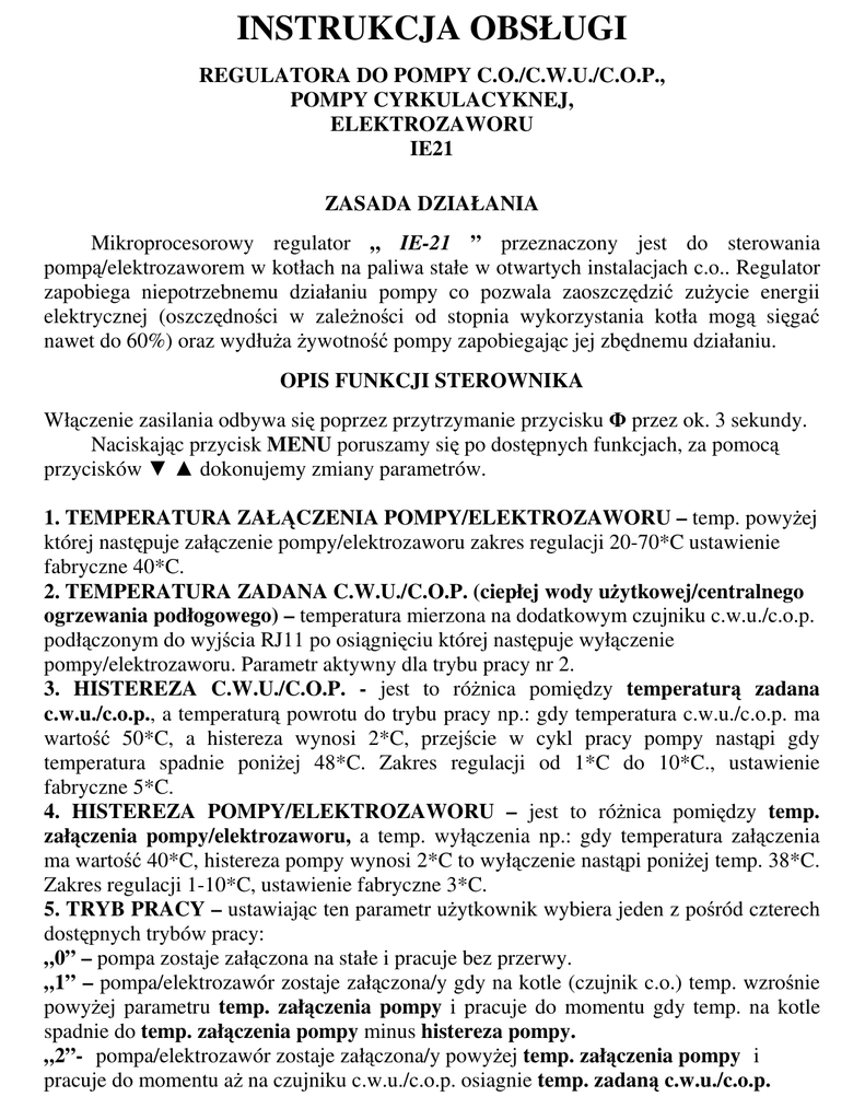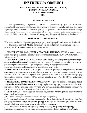 INSTRUKCJA OBSŁUGI REGULATORA DO POMPY C.O./C.W.U./C.O.P., POMPY CYRKULACYKNEJ, ELEKTROZAWORU IE21 ZASADA DZIAŁANIA Mikroprocesorowy regulator „ IE-21 ” przeznaczony jest do sterowania pompą/elektrozaworem w kotłach na paliwa stałe w otwartych instalacjach c.o.. Regulator zapobiega niepotrzebnemu działaniu pompy co pozwala zaoszczędzić zużycie energii elektrycznej (oszczędności w zależności od stopnia wykorzystania kotła mogą sięgać nawet do 60%) oraz wydłuża żywotność pompy zapobiegając jej zbędnemu działaniu. OPIS FUNKCJI STEROWNIKA Włączenie zasilania odbywa się poprzez przytrzymanie przycisku Φ przez ok. 3 sekundy. Naciskając przycisk MENU poruszamy się po dostępnych funkcjach, za pomocą przycisków ▼ ▲ dokonujemy zmiany parametrów. 1. TEMPERATURA ZAŁĄCZENIA POMPY/ELEKTROZAWORU – temp. powyżej której następuje załączenie pompy/elektrozaworu zakres regulacji 20-70*C ustawienie fabryczne 40*C. 2. TEMPERATURA ZADANA C.W.U./C.O.P. (ciepłej wody użytkowej/centralnego ogrzewania podłogowego) – temperatura mierzona na dodatkowym czujniku c.w.u./c.o.p. podłączonym do wyjścia RJ11 po osiągnięciu której następuje wyłączenie pompy/elektrozaworu. Parametr aktywny dla trybu pracy nr 2. 3. HISTEREZA C.W.U./C.O.P. - jest to różnica pomiędzy temperaturą zadana c.w.u./c.o.p., a temperaturą powrotu do trybu pracy np.: gdy temperatura c.w.u./c.o.p. ma wartość 50*C, a histereza wynosi 2*C, przejście w cykl pracy pompy nastąpi gdy temperatura spadnie poniżej 48*C. Zakres regulacji od 1*C do 10*C., ustawienie fabryczne 5*C. 4. HISTEREZA POMPY/ELEKTROZAWORU – jest to różnica pomiędzy temp. załączenia pompy/elektrozaworu, a temp. wyłączenia np.: gdy temperatura załączenia ma wartość 40*C, histereza pompy wynosi 2*C to wyłączenie nastąpi poniżej temp. 38*C. Zakres regulacji 1-10*C, ustawienie fabryczne 3*C. 5. TRYB PRACY – ustawiając ten parametr użytkownik wybiera jeden z pośród czterech dostępnych trybów pracy: „0” – pompa zostaje załączona na stałe i pracuje bez przerwy. „1” – pompa/elektrozawór zostaje załączona/y gdy na kotle (czujnik c.o.) temp. wzrośnie powyżej parametru temp. załączenia pompy i pracuje do momentu gdy temp. na kotle spadnie do temp. załączenia pompy minus histereza pompy. „2”- pompa/elektrozawór zostaje załączona/y powyżej temp. załączenia pompy i pracuje do momentu aż na czujniku c.w.u./c.o.p. osiagnie temp. zadaną c.w.u./c.o.p. ponowne załączenie pompy/elektrozaworu nastąpi gdy temp na czujniku c.w.u./c.o.p. spadnie poniżej histerezy c.w.u./c.o.p.. Cykle te będą się powtarzać. W tym trybie pompa zostanie również wyłączona gdy zostanie spełniony jeden z poniższych warunków: - temp. na kotle spadnie poniżej temp. załączenia pompy minus histereza pompy. - temp. na kotle mniejsza niż temp. na czujniku c.w.u./c.o.p. „3” – pompa pracuje powyżej temp. załączenia pompy według parametrów czas pracy pompy i czas wyłączenia pompy. Całkowite wyłącznie pompy następuje gdy temp. na kotle spadnie poniżej temp. załączenia pompy minus histereza pompy. 6. Tc.w.u./c.o.p. podgląd temp. na czujniku c.w.u./c.o.p. MENU SERWISOWE Sterownik został wyposażony w dodatkowe menu serwisowe d1. Aby uruchomić tą opcję należy załączyć sterownik z przyciśniętym klawiszem MENU i trzymać go do momentu aż na wyświetlaczu pojawi się napis d1 następnie naciskając przycisk MENU poruszamy się po funkcjach serwisowych. Przyciskami ▲ ▼ zmieniamy wartości parametrów, natomiast przyciskiem Φ zapisujemy zmiany parametrów: MENU d1 1. CZAS PRACY POMPY (dioda z opisem Tzał. pompy) – zakres regulacji 1-99 minut, ustawienie fabryczne 5 minut. 2. CZAS PRZERWY PRACY POMPY (dioda z opisem Tzad. cwu/cop) – zakres regulacji 1-99 minut, nastawienie fabryczne 30 minut. 3. TEMP. ZAŁĄCZENIA ALARMU (dioda z opisem hist. cwu/cop) – zakres regulacji 65-95*C, nastawienie fabryczne 85*C. DODATKOWE FUNKCJE - ALARM – sygnalizacja dźwiękowa powyżej zadanej temp. alarmu. - Funkcja anty stop – pompa załączana jest co 7dni na 10sekund by zapobiec osadzaniu się kamienia na pompie w okresie letnim. - Funkcja anty zamarzanie – załączenie pompy poniżej 7*C by zapobiec zamarznięciu wody w instalacji c.o. Pompa załączana jest również dodatkowo gdy zostanie uszkodzony czujnik temperatury oraz gdy zostanie przekroczona temperatura alarmu!! USTAWIENIA FABRYCZNE Aby powrócić do ustawień fabrycznych należy włączyć sterownik z przyciśniętym przyciskiem START gdy na wyświetlaczu pojawi się napis dS zwalniamy przycisk. ZABEZPIECZENIA Regulator wyposażony jest w szereg zabezpieczeń, które sygnalizowane są na wyświetlaczu LED oraz dźwiękowo: c1 – sygnalizuje przekroczenie temperatury alarmu na kotle, wartość domyślna 85*C. c2 - sygnalizuje uszkodzenie czujnika temperatury W przypadku wystąpienia alarmu c1 nie należy wyłączać sterownika ponieważ spowoduje to wyłączenie pompy obiegowej. Alarm dźwiękowy wyłączamy naciskając klawisz [MENU]. W przypadku błędu c2 należy skontaktować się z serwisem. WYMIANA BEZPIECZNIKA Przed dokonaniem jakichkolwiek czynności związanych z wymianą bezpiecznika należy wyciągną wtyczkę z gniazdka!!! Aby wymienić bezpiecznik należy wykręcić wkręty znajdujące się z tylu sterownika następnie należy wymienić bezpiecznik stosując wkładkę 5x20 1 A szybki. KONSERWACJA Przed sezonem grzewczym i w czasie jego trwania należy sprawdzić stan techniczny przewodów, mocowania oraz oczyścić sterownik z kurzu i innych zanieczyszczeń. Należy również dokonać pomiaru uziemienia silników pomp. Okresowo, a przynajmniej przed każdym sezonem grzewczym należy sprawdzić poprawność działania sterownika, zwłaszcza jego zabezpieczeń. UWAGA! URZĄDZENIE ELEKTRYCZNE POD NAPIĘCIEM! Przed dokonaniem jakichkolwiek czynności związanych z zasilaniem (podłączanie przewo