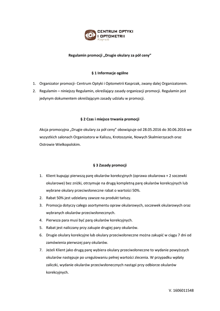 Regulamin promocji „Drugie okulary za pół ceny” § 1 Informacje ogólne 1. Organizator promocji- Centrum Optyki i Optometrii Kasprzak, zwany dalej Organizatorem. 2. Regulamin – niniejszy Regulamin, określający zasady organizacji promocji. Regulamin jest jedynym dokumentem określającym zasady udziału w promocji. § 2 Czas i miejsce trwania promocji Akcja promocyjna „Drugie okulary za pół ceny” obowiązuje od 28.05.2016 do 30.06.2016 we wszystkich salonach Organizatora w Kaliszu, Krotoszynie, Nowych Skalmierzycach oraz Ostrowie Wielkopolskim. § 3 Zasady promocji 1. Klient kupując pierwszą parę okularów korekcyjnych (oprawa okularowa + 2 soczewki okularowe) bez zniżki, otrzymuje na drugą kompletną parę okularów korekcyjnych lub wybrane okulary przeciwsłoneczne rabat o wartości 50%. 2. Rabat 50% jest udzielany zawsze na produkt taoszy. 3. Promocja dotyczy całego asortymentu opraw okularowych, soczewek okularowych oraz wybranych okularów przeciwsłonecznych. 4. Pierwsza para musi byd parą okularów korekcyjnych. 5. Rabat jest naliczany przy zakupie drugiej pary okularów. 6. Drugie okulary korekcyjne lub okulary przeciwsłoneczne można zakupid w ciągu 7 dni od zamówienia pierwszej pary okularów. 7. Jeżeli Klient jako drugą parę wybiera okulary przeciwsłoneczne to wydanie powyższych okularów następuje po uregulowaniu pełnej wartości zlecenia. W przypadku wpłaty zaliczki, wydanie okularów przeciwsłonecznych nastąpi przy odbiorze okularów korekcyjnych. V. 1606011548 8. Akcja promocyjna „Drugie okulary za pół ceny” nie łączy się z innymi promocjami i zniżkami dostępnymi w salonach Organizatora. 9. Badanie wzroku w trakcie trwania promocji przy zakupie pierwszej pary okularów jest w cenie 1 PLN. 10. Badanie wzroku przy zakupie drugiej pary okularów korekcyjnych dla innej osoby jest w cenie 100 PLN. § 4 Postanowienia koocowe 1. Dokonanie zakupu na zasadach określonych w § 3 Regulaminu jest równoznaczne z akceptacją postanowieo Regulaminu. 2. Regulamin dostępny jest w salonach Organizatora wymienionych w § 2 oraz na stronie internetowej: http://www.optyk-kasprzak.pl. 3. Organizator zastrzega sobie prawo zmiany niniejszego Regulaminu w czasie trwania akcji. Wszelkie zmiany w niniejszym Regulaminie wymagają zachowania formy pisemnej, pod rygorem nieważności i będą obowiązywały po upływie 2 dni od dnia ich ogłoszenia na stronie http://www.optyk-kasprzak.pl. V. 1606011548