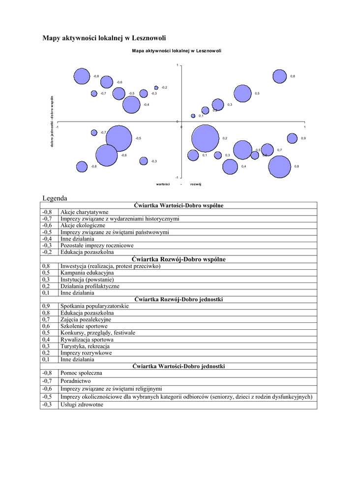 Mapy aktywności lokalnej w Lesznowoli Mapa aktyw ności lokalnej w Lesznow oli 1 -0,8 0,8 -0,6 dob ro jedn ostki - d obro wsp óln e -0,2 -0,7 -0,5 -0,3 0,5 -0,4 0,3 0,2 0,1 0 -1 0 1 -0,7 -0,5 0,2 0,9 0,5 -0,6 0,1 0,3 0,7 0,6 -0,3 -0,8 0,4 0,8 -1 warto ści - rozwój Legenda -0,8 -0,7 -0,6 -0,5 -0,4 -0,3 -0,2 Ćwiartka Wartości-Dobro wspólne Akcje charytatywne Imprezy związane z wydarzeniami historycznymi Akcje ekologiczne Imprezy związane ze świętami państwowymi Inne działania Pozostałe imprezy rocznicowe Edukacja pozaszkolna Ćwiartka Rozwój-Dobro wspólne 0,8 0,5 0,3 0,2 0,1 0,9 0,8 0,7 0,6 0,5 0,4 0,3 0,2 0,1 -0,8 -0,7 -0,6 -0,5 -0,3 Inwestycja (realizacja, protest przeciwko) Kampania edukacyjna Instytucja (powstanie) Działania profilaktyczne Inne działania Ćwiartka Rozwój-Dobro jednostki Spotkania popularyzatorskie Edukacja pozaszkolna Zajęcia pozalekcyjne Szkolenie sportowe Konkursy, przeglądy, festiwale Rywalizacja sportowa Turystyka, rekreacja Imprezy rozrywkowe Inne działania Ćwiartka Wartości-Dobro jednostki Pomoc społeczna Poradnictwo Imprezy związane ze świętami religijnymi Imprezy okolicznościowe dla wybranych kategorii odbiorców (seniorzy, dzieci z rodzin dysfunkcyjnych) Usługi zdrowotne Aktywność lokalna w obszarze "Południowo-zachodnim" 1 -0,8 0,8 -0,6 -0,2 Dobro jednostki - dobro wspó lne -0,5 -0,3 0,5 -0,4 0,3 0 -1 0 1 -0,5 0,2 0,9 0,5 -0,6 0,1 0,7 0,6 -0,3 -0,8 0,4 0,8 -1 wartości - rozwój Aktywność lokalna w obszarze "Zachodnim" 1 -0,8 0,8 Dobro jed nostki - d obro wspó lne -0,6 -0,5 -0,3 0,5 -0,4 0,3 0,2 0 -1 0 1 -0,7 -0,5 0,2 0,9 0,5 -0,6 0,1 0,7 0,3 -0,3 -0,8 0,4 -1 wartości - roz wó j 0,8 Aktywność lokalna w obszarze "Centrum" 1 -0,8 0,8 -0,6 Dobro jednostki - dobro wspólne -0,7 -0,5 -0,3 0,5 -0,4 0,3 0 -1 0 1 -0,7 -0,5 0,2 0,5 -0,6 0,1 0,3 0,7 0,6 -0,3 -0,8 0,4 0,8 -1 wartości - rozwój Aktyw ność lokalna w obsz arz e Wschód 1 -0,8 0,8 -0,6 -0,5 0,5 -0,4 0,2 0 -1 0 1 -0,5 0,2 0,9 0,5 -0,6 0,7 0,1 -0,3 0,8 -1