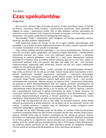 JÓZEF BIAŁEK Czas spekulantów (fragment) Nie ma sensu ukrywać tego, że Europa się kończy. Trzeba powiedzieć wręcz, że Zachód się kończy, zatraciwszy swoje korzenie i zaprzeczywszy wartościom, które pozwoliły mu niegdyś na sukces i opanowanie świata. Dziś te albo podobne wartości wprowadza się skutecznie w życie właśnie w Azji: chcącemu nie dzieje się krzywda, co nie jest zakazane, jest dozwolone – oto zasady, wedle których działają azjatyckie tygrysy. Rozmawiałem kiedyś z Chińczykiem spod Szanghaju, od którego kupowałem skutery. Pytam go, jaki płaci podatek. Odpowiedział: „Gdy eksportuję skutery do Europy, to nie ma w ogóle podatku dochodowego. Jeśli sprzedaję u nas w kraju, to płacę siedemnaście procent. Bo wiesz, naszemu państwu zależy na rozwoju motoryzacji i w ten sposób to wspomaga”. Tego rodzaju polityka państwa wspomaga, a nie niszczy przedsiębiorców. Państwo nie musi być neutralne wobec gospodarki, jak twierdzą utopijni liberałowie i neoliberałowie: neutralność państwa jest mitem, musi ono realizować pewne wartości, a ponieważ funkcjonuje w systemie globalnym, musi dbać też o swój rynek. Wewnętrzne swobody gospodarcze w każdym kraju są możliwe jedynie wówczas, gdy stoi za nimi silne, oparte na wartościach państwo, które nie pozwala, aby jego rolę zajęły inne siły – inne państwa, międzynarodowe organizacje bądź korporacje, których siła jest dziś często wielokrotnie większa niż siła niektórych państw. Wspominam dziś chińskie rudery i smród z początku lat dziewięćdziesiątych dwudziestego wieku, po których nie ma dziś już ani śladu. Dawne miasta pełne rowerzystów w słomkowych kapeluszach zastąpiły nowoczesne metropolie z najnowszą technologią, z drapaczami chmur i markowymi sklepami, pośród których rozwija się lokalny handel i gastronomia. Drogi? Kiedyś wydeptane ścieżyny bądź pełne kolein i wyrw – dziś szerokie, sześciopasmowe autostrady. Obecnie wszyscy już kojarzą Chiny z nowoczesną elektroniką, ale przecież w latach dziewięćdziesiątych było tam większe zacofanie technologiczne niż w Albanii, nie mówiąc już o Polsce. Nikomu nie wpadłoby do głowy, aby Chiny porównywać z jakimkolwiek krajem pierwszego świata, a już na pewno nie z USA czy Japonią, z którymi dziś z powodzeniem konkurują. A jednak Chińczykom się udało. A zaczęli skromnie, od utworzenia wokół Kantonu i kilku innych miast specjalnych stref ekonomicznych, czegoś w rodzaju eksperymentalnych prowincji, w których pozwolono na nieograniczony rozwój kapitalizmu. Kiedy eksperyment się udał, rozszerzono go na cały kraj. Kiedy drugi raz pojechałem do Chin w roku 1996, nie poznałem Kantonu. Szybki rozwój dokonał się praktycznie w każdej dziedzinie. Już nie bałem się iść do restauracji. Smród z ulic zniknął, a polskie polonezy i rosyjskie łady na taksówkach zostały zastąpione przez niemieckie volkswageny i japońskie toyoty. Dlaczego tak się stało? Dlaczego wciąż tak się dzieje, że zacofane Chiny prą do przodu, a rzekomo europejska Polska się cofa? Przede wszystkim chiński rząd, chińskie służby wywiadowcze, chińskie banki stoją za chińskim przedsiębiorcą. Nie starają się sprzyjać obcemu biznesowi, nie faworyzują zagranicznych inwestorów czy handlowców. Dokładnie przeciwnie niż w Polsce, gdzie to, co zagraniczne, zawsze stawiane jest na pierwszym miejscu. Chińska władza, choć nie została wybrana demokratycznie, dba o Chińczyków. Polska demokratycznie wybrana władza zachowuje się tak, jakby powołana została do wytępienia Polaków. Chińscy autokraci zachowują się jak gospodarze, polscy demokraci jak okupanci. 1/6 Chińczycy, realizując swoje reformy, zrozumieli, że bogactwo państwa bierze się z posiadania jak największej ilości własnych, globalnych firm produkujących zaawansowane technologicznie oraz markowe produkty na cały świat. Zrozumieli, że tylko rodzimy, prywatny biznes pozwoli się rozwijać państwu jako organizmowi i instytucji. Taka przemiana w państwie totalnie komunistycznym jest zaskakująca, ale w gruncie rzeczy odpowiada chińskiej mentalności, przywykłej do silnej, centralnej władzy, a zarazem wyjątkowo sprawnej jeśli chodzi o tworzenie nieformalnych powiązań, również biznesowych. Krótko mówiąc: chińskiej władzy zależy, aby obywatele brali sprawy w swoje ręce i nie obciążali nadmiernie państwa. Dlatego sprzyja jak może ich usamodzielnieniu się za pomocą preferencyjnych podatków, kredytów i tak dalej. Dlatego na przykład największa chińska firma komputerowa Lenovo ruszyła w 1994 roku za jedyne dwadzieścia pięć tysięcy dolarów. Firma ta powstała w wyniku współpracy Chińskiej Akademii Nauk i drobnego, postkomunistycznego przemysłu. Dzisiaj Lenovo to światowa potęga. Warto dodać, że Chiny, świadome znaczenia nowych technologii dla rozwoju gospodarki, przeznaczają od lat ponad dwa procent PKB na rozwój nauki, dużo więcej niż w Polsce. To również w rzekomo komunistycznych Chinach kilka lat temu poważnie obniżono podatek dochodowy, wskutek czego duża część klasy średniej w ogóle go nie płaci. Zdarzyło mi się odwiedzić instytut medycyny chińskiej i oglądać efekty współpracy między ministerstwem zdrowia, uniwersytetem i przemysłem. Zaprezentowano urządzenie do niszczenia komórek rakowych za pomocą ultradźwięków. Dzięki temu urządzeniu uzyskuje się sto procent wyleczalności raka bez użycia skalpela, pod warunkiem, że choroba jest w pierwszym stadium. Dziś takie chińskie urządzenia stoją już w szpitalach w Oxfordzie, w Mediolanie, Barcelonie, Frankfurcie, a chińskie technologie kupowane są na całym świecie. Skąd to się wzięło? Między innymi z mądrej polityki państwa, które nie niszczy lokalnych inicjatyw i pomysłów, lecz je wspiera, również w ten sposób, że inwestuje pieniądze podatników nie tyl