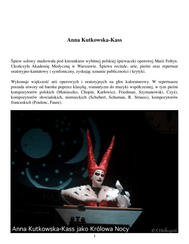 Anna Kutkowska-Kass Śpiew solowy studiowała pod kierunkiem wybitnej polskiej śpiewaczki operowej Marii Fołtyn. Ukończyła Akademię Medyczną w Warszawie. Śpiewa recitale, arie, pieśni oraz repertuar oratoryjno-kantatowy i symfoniczny, zyskując uznanie publiczności i krytyki. Wykonuje większość arii operowych i oratoryjnych na głos koloraturowy. W repertuarze posiada utwory od baroku poprzez klasykę, romantyzm do muzyki współczesnej, w tym pieśni kompozytorów polskich (Moniuszko, Chopin, Karłowicz, Friedman, Szymanowski, Czyż), kompozytorów słowiańskich, niemieckich (Schubert, Schuman, R. Strauss), kompozytorów francuskich (Poulenc, Faure). 1 2 3 Anna Kutkowska-Kass zadebiutowała na scenie Opery Narodowej w partii Królowej Nocy w premierowym przedstawieniu Czarodziejskiego Fletu W. A. Mozarta pod kierownictwem Kazimierza Korda, w reżyserii Achima Freyera w 2006 roku. W tym samym roku wykonała partię Królowej Nocy w Teatrze Wielkim w Poznaniu. W 2007 roku wystąpiła w partii Donny Anny w operze Don Giovanni w Operze Śląskiej w Bytomiu. Spektakl ten otwierał Jubileusz Wiesława Ochmana. Również w tym samym roku wzięła udział w Gali Operowej na cześć Wiesława Ochmana. W kwietniu 2008 roku wystąpiła w roli Hanny w operze Straszny dwór St. Moniuszki w Operze Narodowej w Warszawie. Sezon 2007/2008 to udział w spektaklu Śpiewnik domowy przygotowany przez Marię Fołtyn, w Salach Redutowych Teatru Wielkiego w Warszawie. Sezon 2008/2009 partia Królowej Nocy w Czarodziejskim flecie na scenie Opery Narodowej w Warszawie - wersja polskojęzyczna. Anna Kutkowska-Kass występuje również w koncertach kameralnych i symfonicznych. Dwukrotnie wystąpiła na zaproszenie Katedry Kompozycji Uniwersytetu Muzycznego Fryderyka Chopina w Warszawie (2004, 2008) wykonując cykle pieśni współczesnych awangardowych kompozytorów polskich takich jak: Kościów, Łukaszewski, Borkowski. W 2007 roku brała udział w koncercie w Pradze, gdzie wykonała i nagrała płytę ze Słopiewniami K. Szymanowskiego w ramach obchodów Roku Karola Szymanowskiego z Kameralną Orkiestrą Berg. W tym samyn roku w Studio S-1 Polskiego Radia w Warszawie wzięła udział w Koncercie Dodekafonistów, gdzie wykonała Siedem wczesnych pieśni Albana Berga. Koncert ten powtórzony został w Filharmonii Lubelskiej w ramach Festiwalu im. W. Lutosławskiego. W latach 2007 i 2008 zaproszona przez Ośrodek Kultury Polskiej w Pradze wykonała koncert arii i pieśni. W 2008 roku na Festiwalu Muzyki Współczesnej - XXII Warszawskie Spotkania Muzyczne w Zamku Ujazdowskim - zaśpiewała cykle pieśni Kościówa i Łukaszewskiego. W tym samym roku wystąpiła w Warszawskim Towarzystwie Muzycznym w koncercie dla uczczenia pamięci Marcelli Sembrich-Kochańskiej w repertuarze tej wielkiej śpiewaczki śpiewając między innymi arie Królowej Nocy, Elwiry (Purytanie) i scenę obłędu Łucji. W 2009 roku wystąpiła z recitalem zaproszona przez Warszawskie Towarzystwo Chopinowskie, a w 2010 roku przez Warszawskie Towarzystwo Muzyczne. Brała udział w licznych Festiwalach muzycznych m.in. w 2005 roku w Festiwalu MuzykiWspółczesnej w Sopocie, gdzie zaśpiewała Siedem wczesnych pieśni Albana Berga; w 2006 i 2009 roku podczas Festiwalu Moniuszkowskiego w Białymstoku, gdzie uczestniczyła w koncertowym wykonaniu opery Straszny dwór Stanisława Moniuszki wykonując partię Hanny oraz opery Hrabina wykonując partię Broni i Ewy; w 2007 roku podczas Festiwalu im. W. Lutosławskiego w Filharmonii Lubelskiej oraz Festiwalu My Splendid Isolation - Dni Karola Szymanowskiego podczas którego zaśpiewała Stabat Mater i Litanię do Matki Bożej K. Szymanowskiego z Radomską Orkiestrą Kameralną. 4 5 Rok 2008 to: Nałęczowskie Divertimento, wykonanie Requiem W. A. Mozarta z Filharmonią Podlaska pod dyrekcją M. Nałęcz-Niesiołowskiego; Festiwal Muzyki Współczesnej - XXII Warszawskie Spotkania Muzyczne w Zamku Ujazdowskim; udział w Międzynarodowym Festiwalu Chopinowskim w Antoninie w specjalnym koncercie na cześć Marcelli SembrichKochańskiej oraz w koncercie na Jasnej Górze z okazji rocznicy Odsieczy Wiedeńskiej, gdzie z orkiestrą Opery Śląskiej wykonała arię Siostry Angeliki z opery G. Pucciniego. W 2009 roku dwukrotnie wystąpiła w Antoninie Muzyczne oraz Międzynarodowego Festiwalu Radomską Orkiestrą Kameralną w koncercie arii dwór (Hanna) i Hrabina (Ewa) oraz w koncercie podczas Letniego Festiwalu - Ogrody Chopinowskiego. Wzięła udział z z oper Stanisława Moniuszki Straszny sylwestrowym w Filharmonii Łódzkiej. W roku 2010 dała recital w Warszawskim Towarzystwie Muzycznym, brała udział w Festiwalu Pieśni Polskiej - pieśni Stanisława Moniuszki - w Wilanowie. Również wystąpiła w partii Hanny w Strasznym dworze Stanisława Moniuszki w Operze Śląskiej pod kierownictwem muzycznym Tadeusza Serafina. Dla telewizji „Polonia” nagrała pieśni Ignacego Friedmana. 6