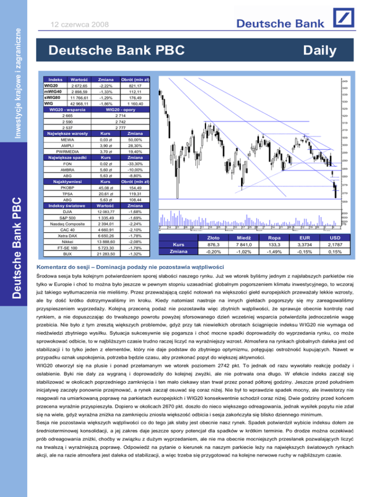 Inwestycje krajowe i zagraniczne 12 czerwca 2008 Deutsche Bank PBC Zmiana Obrót (mln z ) WIG20 Indeks Warto 2 672,65 -2,22% 821,17 mWIG40 2 898,59 -1,33% 112,11 sWIG80 11 766,61 -1,29% 176,49 WIG 42 968,11 -1,86% 1 160,40 Daily 3450 3400 3350 3300 WIG20 - wsparcia WIG20 - opory 3250 2 665 2 714 3200 2 590 2 742 3150 2 537 2 777 3100 Najwi ksze wzrosty Kurs Zmiana MEWA 0,03 z 50,00% 3050 AMPLI 3,90 z 28,30% 3000 PWRMEDIA 3,70 z 19,40% 2950 Najwi ksze spadki Kurs Zmiana FON 0,02 z -33,30% AMBRA 5,60 z -10,00% 2850 2800 ABG 5,63 z -8,80% Najaktywniesi Kurs Obrót (mln z ) PKOBP 45,08 z 154,49 TPSA 20,61 z 119,31 ABG 5,63 z 108,44 2900 Deutsche Bank PBC 2750 Indeksy wiatowe Warto Zmiana 2700 2650 DJIA 12 083,77 -1,68% 20000 S&P 500 1 335,49 -1,69% 15000 Nasdaq Composite 2 394,01 -2,24% 4 660,91 -2,10% Xetra DAX 6 650,26 -1,78% Nikkei 13 888,60 -2,08% FT-SE 100 5 723,30 -1,78% BUX 21 283,50 -1,32% CAC 40 10000 x100 7 2008 14 21 28 4 11 February 18 25 3 10 March oto Kurs Zmiana 17 25 31 7 April 14 21 28 5 May 12 19 26 2 9 June 16 Mied Ropa EUR USD 876,3 7 841,0 133,3 3,3734 2,1787 -0,20% -1,02% -1,49% -0,15% 0,15% Komentarz do sesji – Dominacja poda y nie pozostawia w tpliwo ci rodowa sesja by a kolejnym potwierdzeniem sporej s abo ci naszego rynku. Ju we wtorek byli my jednym z najs abszych parkietów nie tylko w Europie i cho to mo na by o jeszcze w pewnym stopniu uzasadnia globalnym pogorszeniem klimatu inwestycyjnego, to wczoraj ju takiego wyt umaczenia nie mieli my. Przez przewa aj ale by do cz notowa na wi kszo ci gie d europejskich przewa krótko dotrzymywali my im kroku. Kiedy natomiast nastroje na innych gie dach pogorszy y si przyspieszeniem wyprzeda y. Kolejn przecen poda nie pozostawi a wi c zbytnich w tpliwo ci, rynkiem, a nie dopuszczaj c do trwalszego powrotu powy ej sforsowanego dzie y lekkie wzrosty, my zareagowali my e sprawuje obecnie kontrol nad wcze niej wsparcia potwierdzi a jednocze nie wag przebicia. Nie by o z tym zreszt wi kszych problemów, gdy przy tak niewielkich obrotach ci gni cie indeksu WIG20 nie wymaga od nied wiedzi zbytniego wysi ku. Sytuacja sukcesywnie si pogarsza i cho mocne spadki doprowadzi y do wyprzedania rynku, co mo e sprowokowa odbicie, to w najbli szym czasie trudno raczej liczy na wyra niejszy wzrost. Atmosfera na rynkach globalnych daleka jest od stabilizacji i to tylko jeden z elementów, który nie daje podstaw do zbytniego optymizmu, pot guj c ostro no kupuj cych. Nawet w przypadku oznak uspokojenia, potrzeba b dzie czasu, aby przekona popyt do wi kszej aktywno ci. WIG20 otworzy si na plusie i ponad prze amanym we wtorek poziomem 2742 pkt. To jednak od razu wywo os abienie. Byki nie da y za wygran o reakcj poda y i i doprowadzi y do kolejnej zwy ki, ale nie potrwa a ona d ugo. W efekcie indeks zacz si stabilizowa w okolicach poprzedniego zamkni cia i ten ma o ciekawy stan trwa przez ponad pó torej godziny. Jeszcze przed po udniem inicjatyw zacz y ponownie przejmowa , a rynek zacz osuwa si coraz ni ej. Nie by to wprawdzie spadek mocny, ale inwestorzy nie reagowali na umiarkowan popraw na parkietach europejskich i WIG20 konsekwentnie schodzi coraz ni ej. Dwie godziny przed ko cem przecena wyra nie przyspieszy a. Dopiero w okolicach 2670 pkt. dosz o do nieco wi kszego odreagowania, jednak wysi ek popytu nie zda si na wiele, gdy wyra na zni ka na zamkni ciu znios a wi kszo odbicia i sesja zako czy a si blisko dziennego minimum. Sesja nie pozostawia wi kszych w tpliwo ci co do tego jak s aby jest obecnie nasz rynek. Spadek potwierdzi wybicie indeksu do em ze rednioterminowej konsolidacji, a jej zakres daje jeszcze spory potencja dla spadków w krótkim terminie. Po drodze mo na oczekiwa prób odreagowania zni ki, cho by w zwi zku z du ym wyprzedaniem, ale nie ma obecnie mocniejszych przes anek pozwalaj cych liczy na trwalsz i wyra niejsz popraw . Odpowied na pytanie o kierunek na naszym parkiecie le y na najwi kszych wiatowych rynkach akcji, ale na razie atmosfera jest daleka od stabilizacji, a wi c trzeba si przygotowa na kolejne nerwowe ruchy w najbli szym czasie. Informacje ze spó ek AMREST Close: 67,50 z Change: - 4,39% AmRest Holdings N.V. podpisa umow z Burger King Europe GmbH., na podstawie której uzyska bez wy czno ci prawo, do otwierania i prowadzenia na zasadzie franczyzy restauracji Burger King na terytorium Bu garii. Umowa zosta a zawarta na okres 5 lat. DB PBC Wprowadzenie jednej z najbardziej znanych marek na rynek bu garski powinien u atwi umocnienie pozycji AmRestu w tym kraju, który daje bardzo dobre perspektywy rozwoju w najbli szych latach. Prze enia na wyniki mo na jednak oczekiwa w rednim i d szym horyzoncie, a wi c reakcja rynku na dzisiejszej sesji b dzie raczej znikoma. ENERGOPOL Close: 5,67 z Change: - 0,35% Energopol – Po udnie poinformowa , i konsorcjum firm w sk ad którego wchodz : ABM Solid (lider konsorcjum), Energopol – Po udnie (cz onek konsorcjum) oraz Budownictwo Drogowe Altkom Sp. z o.o. (cz onek konsorcjum), podpisa o umow kanalizacyjne ze Zwi zkiem Mi dzygminnym ds. Ekologii w warto ci netto zamówienia. Warto na roboty wodno – ywcu. Udzia spó ki Energopol – Po udnie w podziale zada wynosi 25% podpisanej umowy – 119 353 444,03 z brutto. DB PBC Informacja o zawarciu kontraktu na pozytywn wymow . Warto kontraktu przypadaj ca na Energopol to ponad 37,5 proc. przychodów osi gni tych w ubieg ym roku. Realizacja umowy ma potrwa dwa lata, jednak wp yw na wyniki powinien by zauwa alny. Pomimo niesprzyjaj cych warunków reakcja rynku na dzisiejszej sesji mo e wi c by pozytywna. MOSTOSTAL P OCK Close: 77,60z Change: - 4,20% W wyniku zawarcia przez Mostostal Warszawa S.A. umowy podwykonawczej z Polimex-Mostostal S.A. na realizacj inwestycyjnego pod nazw zadania "Budowa Wytwórni Kwasu Tereftalowego (PTA)", wesz a w ycie umowa przedwst pna zawarta pomi dzy Mostostal P ock, jako podwykonawc , a Mostostal Warszawa na realizacj robót wchodz cych w zakres wy ej wymienionego kontraktu. Wynagrodzenie zosta o