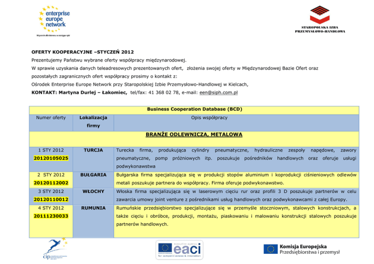 OFERTY KOOPERACYJNE –STYCZEŃ 2012 Prezentujemy Państwu wybrane oferty współpracy międzynarodowej. W sprawie uzyskania danych teleadresowych prezentowanych ofert, złożenia swojej oferty w Międzynarodowej Bazie Ofert oraz pozostałych zagranicznych ofert współpracy prosimy o kontakt z: Ośrodek Enterprise Europe Network przy Staropolskiej Izbie Przemysłowo-Handlowej w Kielcach, KONTAKT: Martyna Durlej – Łakomiec, tel/fax: 41 368 02 78, e-mail: [email protected] Business Cooperation Database (BCD) Numer oferty Lokalizacja Opis współpracy firmy BRANŻE ODLEWNICZA, METALOWA 1 STY 2012 TURCJA 20120105025 Turecka firma, pneumatyczne, produkująca pomp cylindry próżniowych itp. pneumatyczne, poszukuje hydrauliczne pośredników zespoły handlowych napędowe, oraz zawory oferuje usługi podwykonawstwa 2 STY 2012 BUŁGARIA 20120112002 3 STY 2012 metali poszukuje partnera do współpracy. Firma oferuje podwykonawstwo. WŁOCHY 20120110012 4 STY 2012 20111230033 Bułgarska firma specjalizująca się w produkcji stopów aluminium i koprodukcji ciśnieniowych odlewów Włoska firma specjalizująca się w laserowym cięciu rur oraz profili 3 D poszukuje partnerów w celu zawarcia umowy joint venture z pośrednikami usług handlowych oraz podwykonawcami z całej Europy. RUMUNIA Rumuńskie przedsiębiorstwo specjalizujące się w przemyśle stoczniowym, stalowych konstrukcjach, a także cięciu i obróbce, produkcji, montażu, piaskowaniu i malowaniu konstrukcji stalowych poszukuje partnerów handlowych. 1 5 STY 2012 WĘGRY 20120105009 Węgierska firma specjalizująca się w obróbce metali i produkcji wyrobów ze stali nierdzewnej poszukuje usług pośredników handlowych, agentów, przedstawicieli i dystrybutorów. Firma oferuje również usługę podwykonawstwa i outsourcingu, poszukuje partnerów do wzajemnej produkcji. BRANŻA SPOŻYWCZA 6 STY 2012 CHORWACJA 20120104021 7 STY 2012 Chorwacka firma specjalizująca się w sprzedaży hurtowej i imporcie mrożonych i suszonych artykułów spożywczych (owoce, makaron) poszukuje partnerów do joint venture. FRANCJA 20120103028 Francuska agencja handlowa zajmująca się obrotem owocami morza i winem oferuje współpracę handlową. BRANŻA BUDOWLANA 8 STY 2012 TURCJA 20120112014 9 STY 2012 Turecka firma, specjalizująca się w produkcji izolacji tarasów, podłóg pływających oraz materiałów wodoodpornych poszukuje dystrybutorów. BELGIA 20120110020 Belgijska firma, specjalizująca się w wytwarzaniu i rozwijaniu produktów poprawiających bezpieczeństwo na drodze (bariery energochłonne, produkty BHP) poszukuje podwykonawców z ciężkimi prasami hydraulicznymi. 10 STY 2012 20120112013 WŁOCHY Włoska firma wyspecjalizowana w marketingu materiałów budowlanych chciałaby nawiązać współpracę handlową z partnerami zajmującymi się pośrednictwem handlowym. 2 11 STY 2012 RUMUNIA 20111230030 12 STY 2012 Rumuński producent farb, środków chemicznych, detergentów dla przemysłu i gospodarstw domowych poszukuje agentów, dystrybutorów, i importerów. SŁOWENIA 20120119001 Słoweńska firma specjalizująca się w projektowaniu, rozwijaniu oraz produkowaniu sprzętu mechanicznego, urządzeń oraz linii produkcyjnych oferuje swoje usługi jako dystrybutora (agent, przedstawiciel, dystrybutor), w zakresie transportu/ logistyki; istnieje także możliwość joint venture lub podwykonawstwa/ outsourcingu. 13 STY 2012 SŁOWENIA 20120116013 Słoweńska firma specjalizująca się w spawaniu wszystkich rodzajów stali budowlanej, stali nierdzewnej, aluminium, metali żelaznych oferuje podwykonawstwo/ outsourcing, joint venture, sprzedaż całej lub części firmy, wymianę udziałów, wzajemną produkcję. BRANŻA DRZEWNA 14 STY 2012 TURCJA 20120102001 15 STY 2012 usługi podwykonawstwa. HISZPANIA 20120120020 16 STY 2012 20120104012 Turecka firma, działająca w branży meblarskiej, poszukuje pośredników handlowych. Oferuje również Hiszpańska firma specjalizująca się w przetwarzaniu i obróbce drewna poszukuje usług pośrednictwa handlowego. FRANCJA Francuska firma ze centralno-południowej Francji, lider na rynku francuskim w produkcji drewnianych produktów dla dzieci, poszukuje nowych kontaktów handlowych z dystrybutorami i/ lub producentami. Firma poszukuje dystrybutora swoich produktów, oferuje także dystrybucję na rynku francuskim. 3 BRANŻA ODZIEŻOWA / TEKSTYLNA 17 STY 2012 TURCJA 20120118011 Turecka firma, specjalizująca się w wygodnych i funkcjonalnych produktach tekstylnych (skarpetki, tshirty, bielizna itp..), łączących w sobie technologie antyseptycznych włókien ze srebrem oraz bawełnę poszukuje pośredników handlowych, agentów oraz dystrybutorów w krajach UE, szczególnie na terenie Niemiec oraz Europy Północnej. 18 STY 2012 TURCJA 20111230020 Turecka firma, produkująca tkaniny oferuje usługi pośrednictwa handlowego, franczyzy, zawiązanie spółki joint venture, połączenie lub wymianę akcji, sprzedaż części lub całości przedsiębiorstwa, usługi podwykonawstwa oraz wzajemną produkcję. BRANŻA IT 19 STY 2012 RUMUNIA 20120119008 Jedna z najlepszych firm działających w Rumunii w dziedzinie technologii informatycznych i usługach komputerowych poszukuje partnerów do 7 Programu Ramowego. Firma jest również zainteresowana usługami podwykonawstwa oraz zlecania wykonania prac i projektów. BRANŻA OZE /NOWE TECHNOLOGIE 20 STY 2012 RUMUNIA 20111230025 21 STY 2012 20120111010 Rumuńskie przedsiębiorstwo specjalizujące się w recyclingu i gospodarce odpadami poszukuje ofert współpracy, importerów, agentów. SŁOWENIA Słoweńska firma , działająca w branży instalacji elektociepłowniczych oraz energii odnawialnych, poszukuje partnerów biznesowych do współpracy na polu technologii przyjaznych dla środowiska oraz odnawialnych źródeł energii. Firma oferuje franczyzę, wejście w spółkę joint venture, produkcję wzajemną oraz podwykonastwo/outsourcing (produkcja, usługi). 