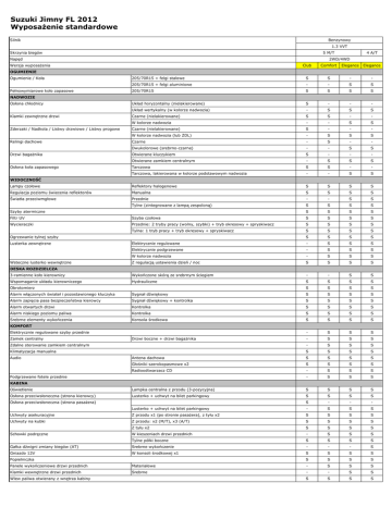 Suzuki Jimny FL 2012 Wyposażenie standardowe Benzynowy Silnik 1.3 VVT Skrzynia biegów 5 M/T 4 A/T 2WD/4WD Napęd Wersja wyposażenia Club Comfort Elegance Elegance 205/70R15 + felgi stalowe S S - - 205/70R15 + felgi aluminiowe - - S S 205/70R15 S S S S OGUMIENIE Ogumienie / Koła Pełnowymiarowe koło zapasowe NADWOZIE Osłona chłodnicy Klamki zewnętrzne drzwi Zderzaki / Nadkola / Listwy drzwiowe / Listwy progowe Relingi dachowe Drzwi bagażnika Osłona koła zapasowego Układ horyzontalny (nielakierowane) S - - - Układ wertykalny (w kolorze nadwozia) - S S S Czarne (nielakierowane) S S - - W kolorze nadwozia - - S S Czarne (nielakierowane) S - - - W kolorze nadwozia (lub ZDL) - S S S Czarne - S - - Dwukolorowe (srebrno-czarne) - - S S Otwierane kluczykiem S - - - Otwierane zamkiem centralnym - S S S Tarczowa S S - - Tarczowa, lakierowana w kolorze podstawowym nadwozia - - S S Lampy czołowe Reflektory halogenowe S S S S Regulacja poziomu świecenia reflektorów Manualna S S S S Światła przeciwmgłowe Przednie - - S S Tylne (zintegrowane z lampą zespoloną) S S S S S S S S S WIDOCZNOŚĆ Szyby atermiczne Filtr UV Szyba czołowa S S S Wycieraczki Przednie: 2 tryby pracy (wolny, szybki) + tryb okresowy + spryskiwacz S S S S Tylna: 1 tryb pracy + tryb okresowy + spryskiwacz S S S S Ogrzewanie tylnej szyby Lusterka zewnętrzne Wsteczne lusterko wewnętrzne S S S S Elektrycznie regulowane - S S S Elektrycznie podgrzewane - S S S W kolorze nadwozia - S S S Z regulacją ustawienia dzień / noc S S S S DESKA ROZDZIELCZA 3-ramienne koło kierownicy Wykończone skórą ze srebrnym ściegiem - - S S Wspomaganie układu kierowniczego Hydrauliczne S S S S S S S S Obrotomierz Alarm włączonych świateł i pozostawionego kluczyka Sygnał dźwiękowy S S S S Alarm zapięcia pasa bezpieczeństwa kierowcy Sygnał dźwiękowy + kontrolka S S S S Alarm otwartych drzwi Kontrolka S S S S Alarm niskiego poziomu paliwa Kontrolka S S S S Srebrne elementy wykończenia Konsola środkowa S S S S - S S S - S S S Zdalne sterowanie zamkiem centralnym - S S S Klimatyzacja manualna S S S S Antena dachowa S S S S Głośniki szerokopasmowe x2 S S S S Radioodtwarzacz CD - S S S - S S S KOMFORT Elektrycznie regulowane szyby przednie Zamek centralny Audio Drzwi boczne + drzwi bagażnika Podgrzewane fotele przednie KABINA Oświetlenie Lampka centralna z przodu (3-pozycyjna) S S S S Osłona przeciwsłoneczna (strona kierowcy) Lusterko + uchwyt na bilet parkingowy S S S S S - - - Lusterko + uchwyt na bilet parkingowy - S S S Uchwyty asekuracyjne Z przodu x1 (po stronie pasażera), z tyłu x2 S S S S Uchwyty na kubki Z przodu: x2 (M/T), x3 (A/T) S S S S Z tyłu x2 S S S S W kieszeniach drzwi przednich - S S S Osłona przeciwsłoneczna (strona pasażera) Schowki podręczne Tylne półki boczne S S S S Gałka dźwigni zmiany biegów (AT) Srebrne wykończenie - - - S Gniazdo 12V W konsoli środkowej x1 S S S S S S S S - S S S - - S S S S S S Popielniczka Panele wykończeniowe drzwi przednich Materiałowe Klamki wewnętrzne drzwi przednich Srebrne Wlew paliwa otwierany z wnętrza kabiny Suzuki Jimny FL 2012 Wyposażenie standardowe Benzynowy Silnik 1.3 VVT Skrzynia biegów 5 M/T 4 A/T 2WD/4WD Napęd Wersja wyposażenia Club Comfort Elegance Elegance SIEDZENIA Fotel pasażera z przodu Mechanizm walk-in ułatwiający zajmowanie miejsc na tylnej kanapie S S S S Tylna kanapa Oparcie dzielone i składane symetrycznie 50:50 S S S S Tkanina S S - - Skóra syntetyczna z logo JIMNY wraz ze wstawkami PVC - - S S S S S S S Tapicerka siedzeń BAGAŻNIK Schowek pod podłogą BEZPIECZEŃSTWO / ZABEZPIECZENIE Czołowe poduszki powietrzne SRS Dla kierowcy i pasażera z przodu S S S System ABS z EBD Zapobiegający blokowaniu kół z elektronicznym rozdziałem siły hamowania S S S S System Brake Assist (BAS) Wspomaganie hamowania awaryjnego S S S S Pasy bezpieczeństwa 3-punktowe pasy ELR: z przodu x2, z tyłu x2 S S S S Pirotechniczne napinacze przednich pasów bezpieczeństwa z ogranicznikiem siły napinającej i regulacją wysokości mocowania S S S S System mocowania fotelika dziecięcego ISOFIX x2 na tylnych siedzeniach S S S S Górne punkty kotwiczenia fotelików dziecięcych x2 na tylnych siedzeniach S S S S Belki wzmacniające W drzwiach przednich S S S S Dodatkowe światło STOP S S S S Immobiliser S S S S S: wyposażenie standardowe