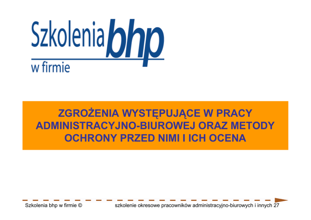 ZGROśENIA WYSTĘPUJĄCE W PRACY ADMINISTRACYJNO-BIUROWEJ ORAZ METODY OCHRONY PRZED NIMI I ICH OCENA Szkolenia bhp w firmie © szkolenie okresowe pracowników administracyjno-biurowych i innych 27 ZagroŜenia ZagroŜenia przy wykonywaniu pracy biurowej wynikają najczęściej: z pracy przy komputerze z obciąŜeń fizycznych z monotonii pracy ze stresu w pracy ze sposobu oświetlenia miejsca pracy Ponadto mogą takŜe występować zagroŜenia wypadkowe, związane najczęściej z poślizgnięciem, potknięciem i upadkiem pracownika bądź poraŜeniem prądem elektrycznym. Szkolenia bhp w firmie © szkolenie okresowe pracowników administracyjno-biurowych i innych 28 ObciąŜenie fizyczne organizmu ObciąŜenie fizyczne organizmu moŜe być: dynamiczne statyczne ObciąŜenie organizmu podczas pracy fizycznej jest uzaleŜnione od rodzaju wysiłku fizycznego. DuŜe znaczenie ma tu pozycja ciała podczas pracy, t.j: siedząca, stojąca, wymuszona. WaŜnym czynnikiem przy obciąŜeniach fizycznych jest odpowiednia organizacja pracy, a szczególnie długość zmiany roboczej oraz częstotliwość powtarzanych czynności. Szkolenia bhp w firmie © szkolenie okresowe pracowników administracyjno-biurowych i innych 29 Praca w pozycji siedzącej Praca w biurze niesie za sobą zagroŜenia związane z: obciąŜeniami mięśniowo-szkieletowymi, wymuszoną pozycją siedzącą podczas pracy. Bardzo często długotrwała praca w pozycji siedzącej, a zwłaszcza w niewłaściwej pozycji ciała moŜe powodować powaŜne dolegliwości bólowe, a w dłuŜszym okresie zmiany zwyrodnieniowe stawów, zwłaszcza kręgosłupa. Szkolenia bhp w firmie © szkolenie okresowe pracowników administracyjno-biurowych i innych 30 Zapobieganie negatywnym skutkom pracy siedzącej Aby przeciwdziałać negatywnym skutkom pracy siedzącej, naleŜy zadbać, Ŝeby stanowisko pracy było wyposaŜone w: odpowiednie siedzisko, biurko odpowiedniej konstrukcji, dodatkowo w podnóŜek. Osoby pracujące w pozycji siedzącej powinny równieŜ przestrzegać określonych zaleceń: Podczas pracy naleŜy przyjmować taką pozycję, aby kręgosłup był utrzymywany w pozycji naturalnej – nie zgarbionej lub skręconej. Po kaŜdej godzinie pracy przy komputerze naleŜy robić 5-minutowe przerwy. Podczas takiej przerwy moŜna zmienić charakter wykonywanej pracy lub wykonać kilka ćwiczeń. Siedzisko powinno być tak wyregulowane, aby podpierać plecy w okolicy lędźwiowej, a ramiona powinny spoczywać na podłokietnikach siedziska. Wysokość siedziska powinna być tak ustawiona, aby nie dopuszczać do ucisku w strefie podkolanowej, a stopy nie znajdowały się pod siedziskiem. Szkolenia bhp w firmie © szkolenie okresowe pracowników administracyjno-biurowych i innych 31 Monotonia Monotonia spowodowana jest brakiem lub jednostajnością bodźców oraz niezmiennością sytuacji. Najczęściej występuje w stanach bezczynności, oczekiwania, np. obserwacji wskaźników monitora. Monotonia spowodowana brakiem bodźców wzrokowych oraz słuchowych określana jest jako monotonia sensoryczna. Jej efektem są często: spowolnienie czynności układu krąŜenia oraz układu oddechowego, wystąpienie senności, zmniejszenie zakresu wykonywanych czynności czego skutkiem jest znaczny spadek wydajności pracy, wzrost liczby popełnianych błędów, a co za tym idzie, sytuacji niebezpiecznych czy nawet potencjalnie wypadkowych. Szkolenia bhp w firmie © szkolenie okresowe pracowników administracyjno-biurowych i innych 32 Monotonia cd. Negatywnym skutkiem powtarzania jednostajnych czynności (ruchów) jest przeciąŜenie wysiłkiem fizycznym niektórych grup mięśni. Efektem jednostajnej pracy moŜe być tzw. zespół cieśni nadgarstka lub łokieć tenisisty. Niebezpiecznym efektem ubocznym ciągłej pracy w pozycji siedzącej jest równieŜ nadmierne obciąŜenie statyczne mięśni kręgosłupa stabilizujących pozycję ciała. Szkolenia bhp w firmie © szkolenie okresowe pracowników administracyjno-biurowych i innych 33 Zapobieganie negatywnym skutkom monotonii Najlepszym sposobem eliminacji tych zagroŜeń i uciąŜliwości jest analiza toku pracy oraz wprowadzenie: rotacji na stanowiskach pracy przerw w pracy urozmaicenia wykonywanych zadań w czasie przerw czynności wymagających aktywności fizycznej Szkolenia bhp w firmie © szkolenie okresowe pracowników administracyjno-biurowych i innych 34 Zespół „suchego oka” Tzw. zespół suchego oka moŜe mieć miejsce w następujących okolicznościach: osoba pracująca przy komputerze stale wpatruje się w dwuwymiarową płaszczyznę, podczas gdy naturalne widzenie jest trójwymiarowe; obserwowana płaszczyzna ma niekorzystne ustawienie pionowe; obciąŜeniem dla oka jest wpatrywanie się w podświetlony ekran, czyli bezpośrednio w źródło światła; podczas pracy przy obsłudze monitora zmniejsza się liczba mrugnięć oczami, co prowadzi do wysychania powierzchni gałki ocznej, czego skutkiem jest niedostateczne nawilŜanie oka – podraŜniona zostaje spojówka i rogówka, pojawiają się typowe dolegliwości oczu, takie jak: pieczenie, zaczerwienienie, uczucie suchości, swędzenie oraz pogarsza się jakość widzenia, obraz zaczyna się zamazywać. Szkolenia bhp w firmie © szkolenie okresowe pracowników administracyjno-biurowych i innych 35 Organizacja stanowiska pracy wyposaŜonego monitor ekranowy Stanowisko pracy wyposaŜone w monitor ekranowy powinno być tak zaprojektowane, aby pracownik miał zapewnioną dostateczną przestrzeń pracy. Wszystkie elementy stanowiska pracy powinny być usytuowane w zasięgu kończyn górnych, a dostęp do stanowiska pracy swobodny. D – dokumenty; DR – drukarka; JC – jednostka centralna; K – klawiatura; M – monitor; P – pojemnik z dyskietkami Szkolenia bhp w firmie © szkolenie okresowe pracowników administracyjno-biurowych i innych 36 Organizacja stanowisk pracy z monitorem ekranowym cd.1 Odległość między pracownikiem a tyłem 