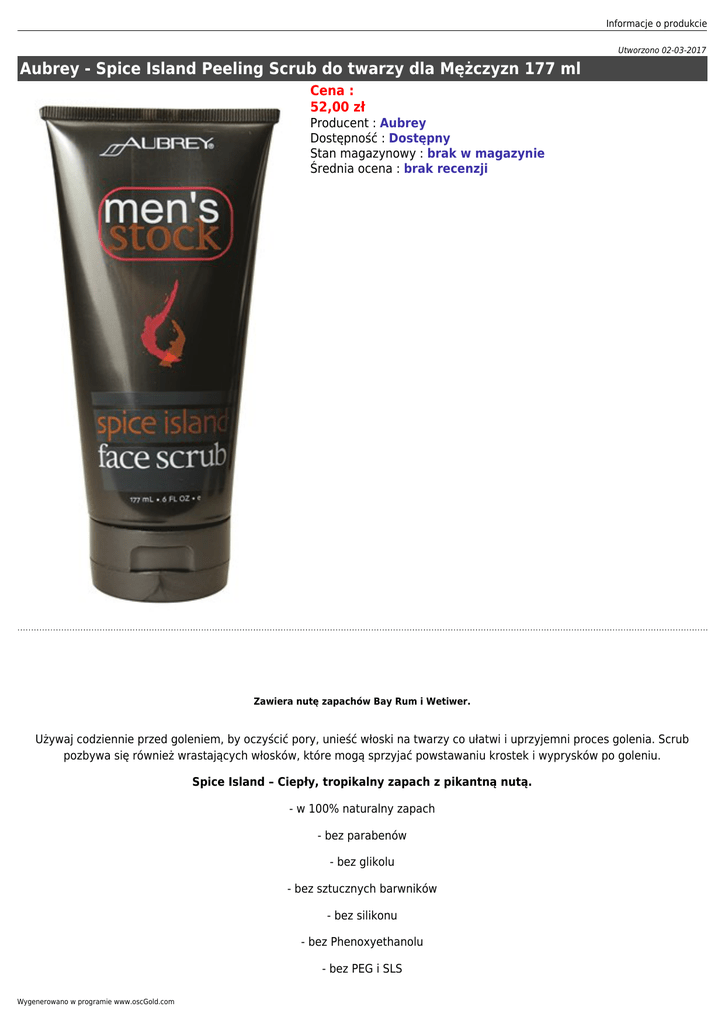 Informacje o produkcie Utworzono 02-03-2017 Aubrey - Spice Island Peeling Scrub do twarzy dla Mężczyzn 177 ml Cena : 52,00 zł Producent : Aubrey Dostępność : Dostępny Stan magazynowy : brak w magazynie Średnia ocena : brak recenzji Zawiera nutę zapachów Bay Rum i Wetiwer. Używaj codziennie przed goleniem, by oczyścić pory, unieść włoski na twarzy co ułatwi i uprzyjemni proces golenia. Scrub pozbywa się również wrastających włosków, które mogą sprzyjać powstawaniu krostek i wyprysków po goleniu. Spice Island – Ciepły, tropikalny zapach z pikantną nutą. - w 100% naturalny zapach - bez parabenów - bez glikolu - bez sztucznych barwników - bez silikonu - bez Phenoxyethanolu - bez PEG i SLS Wygenerowano w programie www.oscGold.com - bez składników GMO - fizjologiczne pH - hypoalergiczny Kluczowe składniki : olejek z kokosa, olejek kukurydziany i mydełko kastylijskie – naturalnie oczyszczają i nawilżają skórę; woskowe kuleczki jojoba i kukurydza zwyczajna – oczyszcza pory i unosi włoski; mięta – chłodzi i orzeźwia. Składniki: Aqua, coco glucoside, cetyl alcohol, kaolin, alcohol denat. (38b, lavender*), jojoba ester (beads), sodium palmate, sodium cocoate, zea mays (corn) cob meal, glycerin, citrus grandis (grapefruit) extract, glyceryl linolenate, glyceryl linoleate, xanthan gum, tocopheryl acetate, menthol crystals, hamamelis virginiana (witch hazel) water, pimenta racemosa (bay rum) leaf oil, pogostemon cablin (patchouli) leaf oil, piper nigrum (black pepper) seed oil, myristica fragrans (nutmeg) kernel oil, vetiveria zizanioides (vetiver) oil, aloe barbadensis leaf*, ascorbic acid, panax ginseng root extract, glycine soja (soybean) oil, daucus carota sativa (carrot) root extract, beta-carotene.
